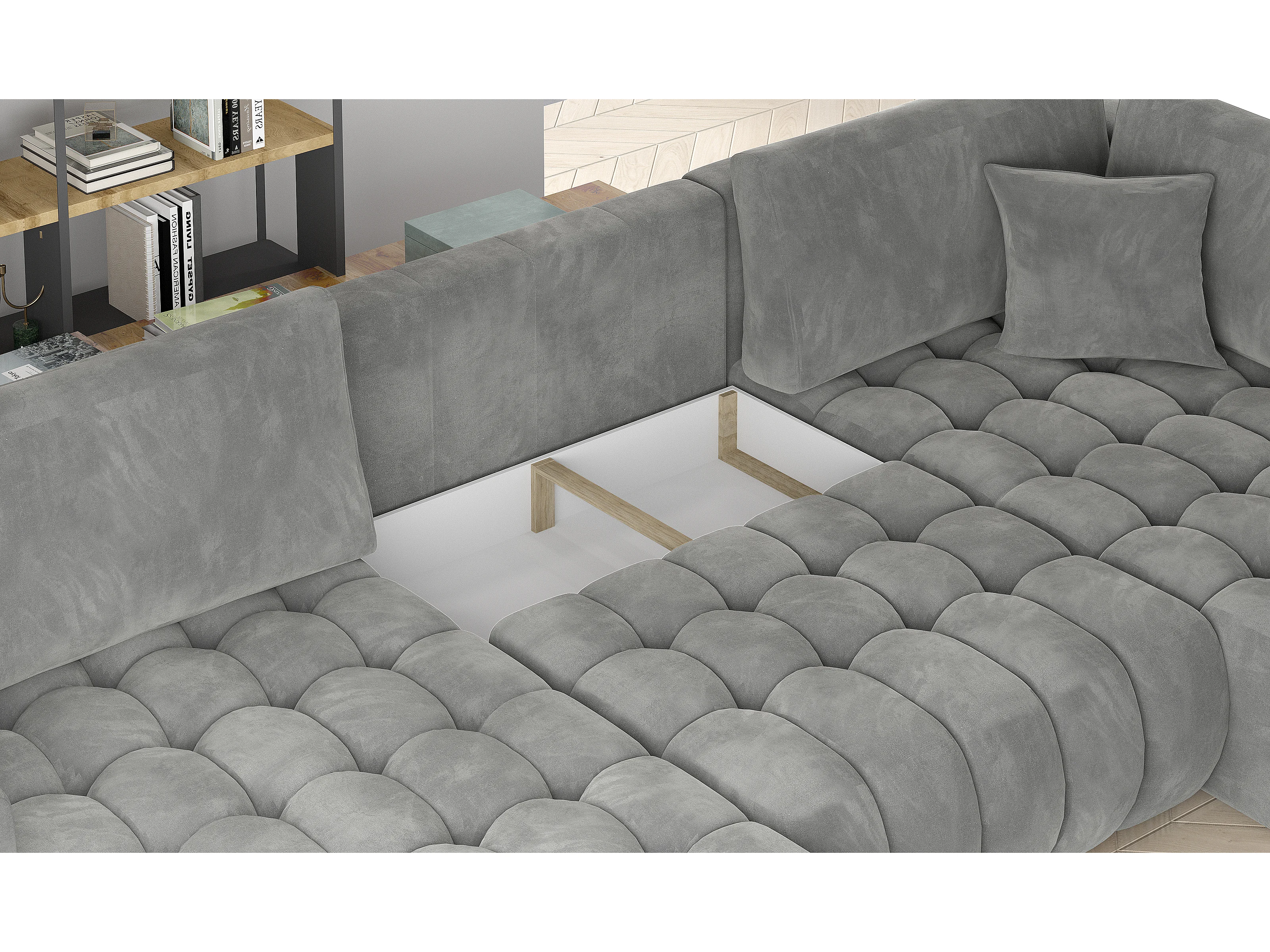Canapé panoramique convertible design capitonné tissu doux vert méridienne gauche Boston 350cm