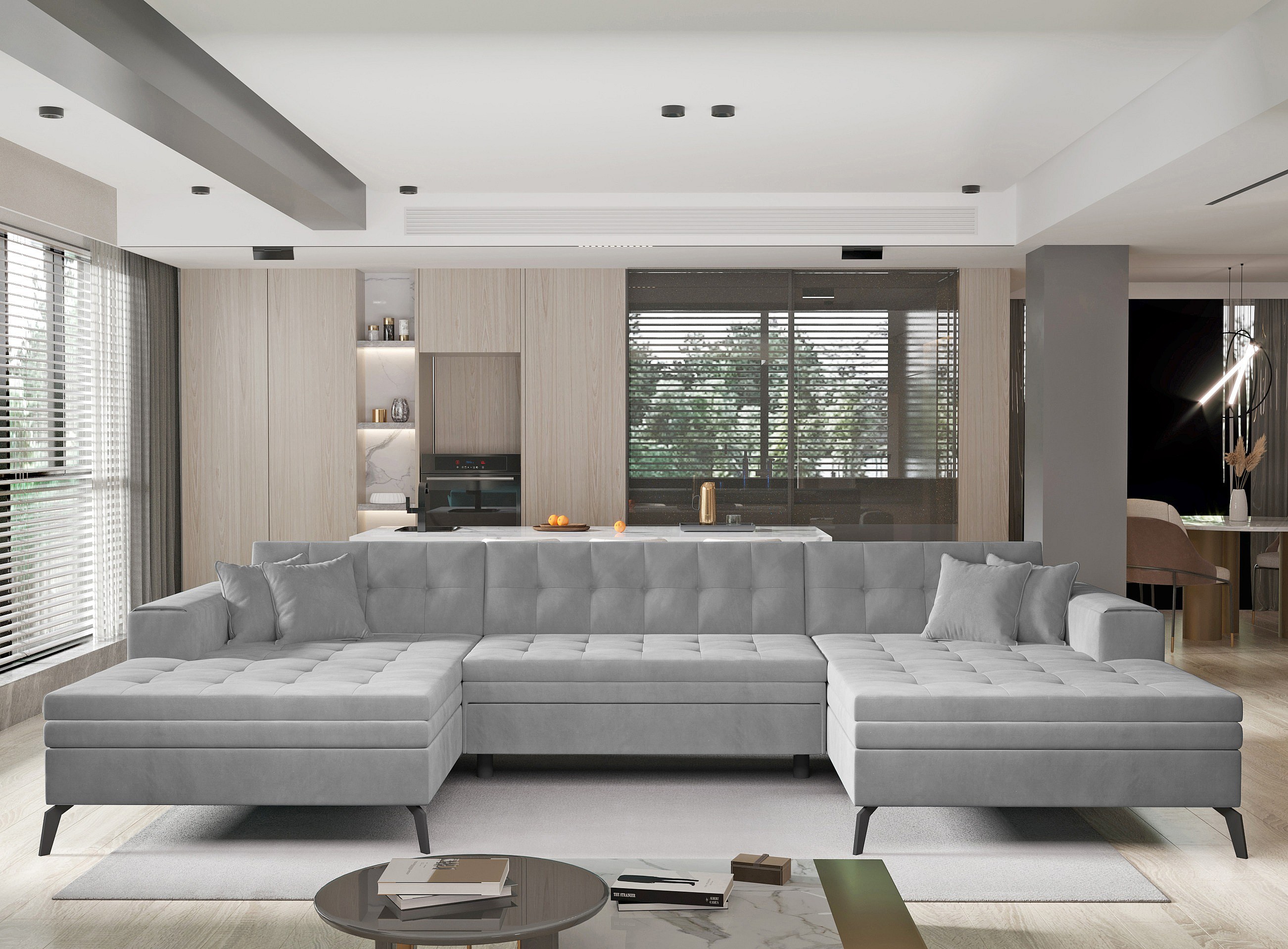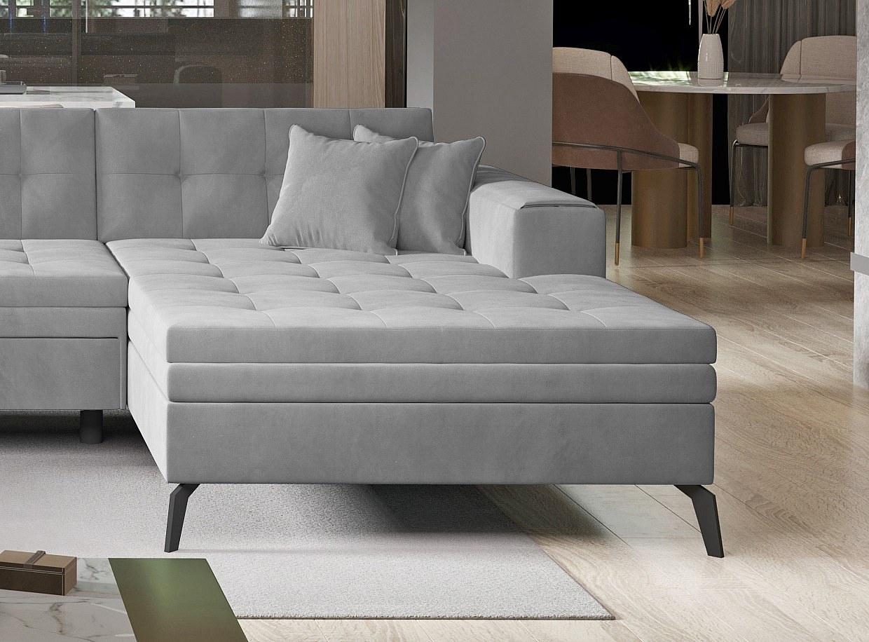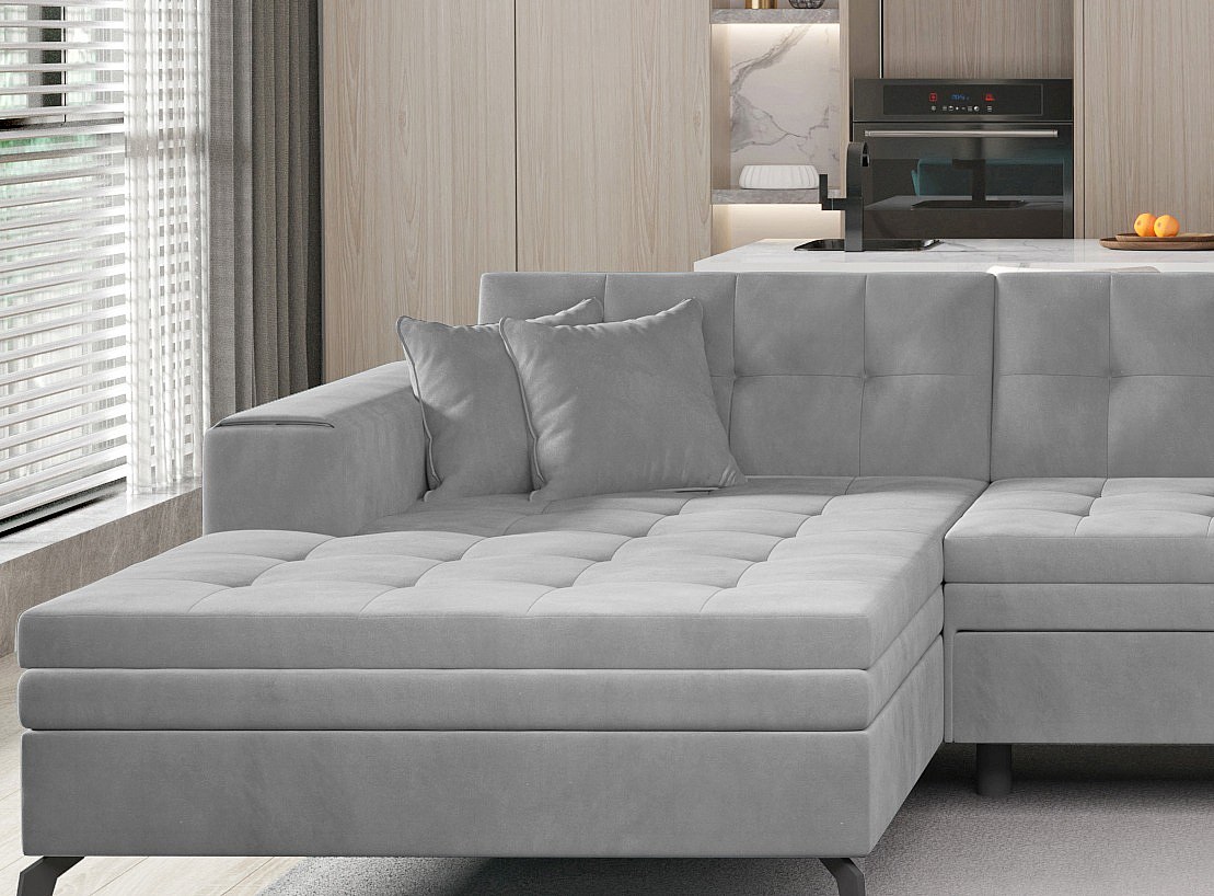 Canapé panoramique convertible tissu doux brillant capitonné gris clair Romy 350cm