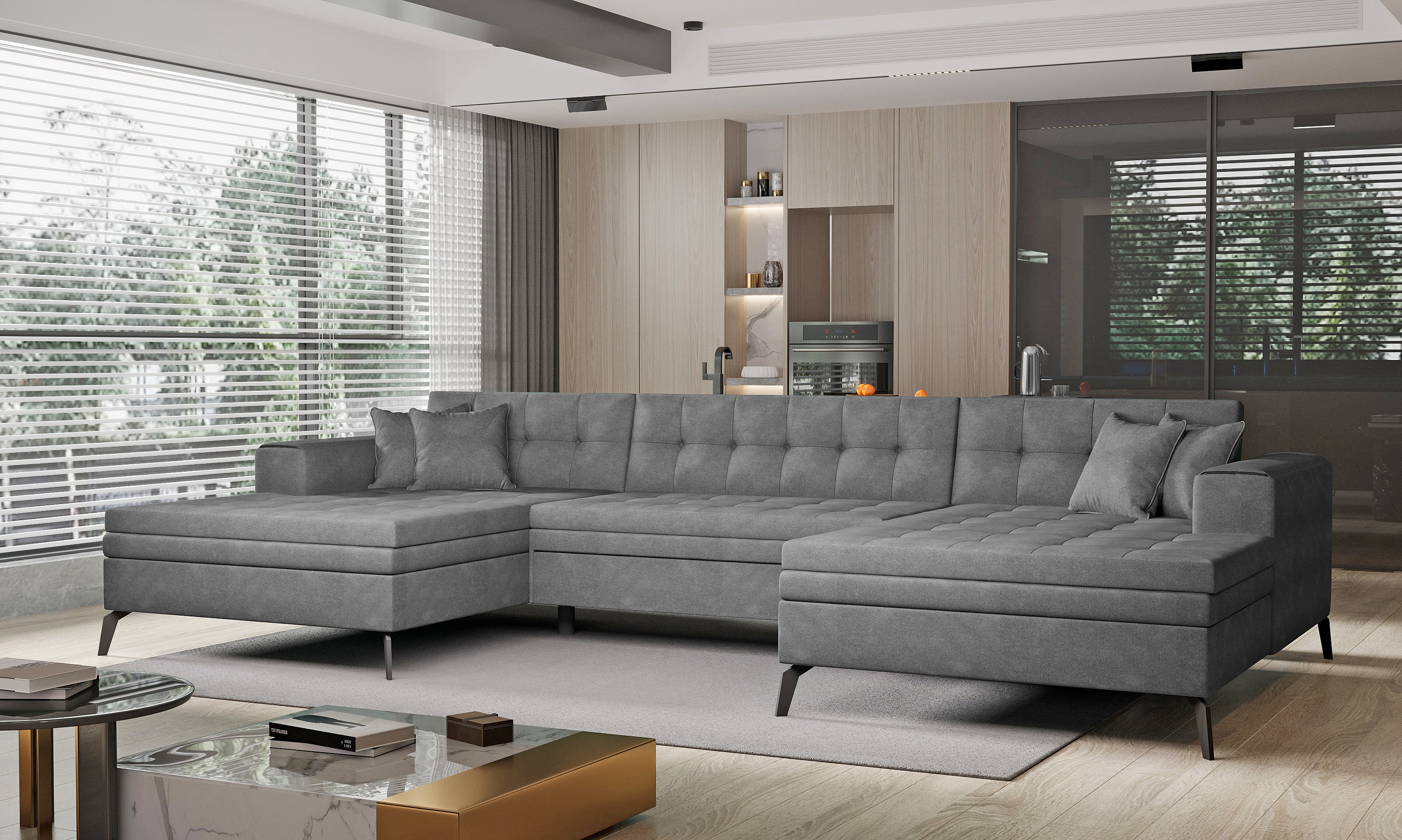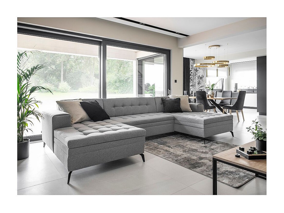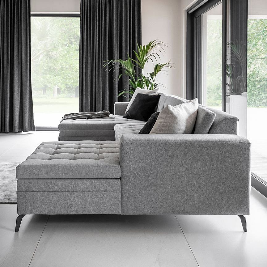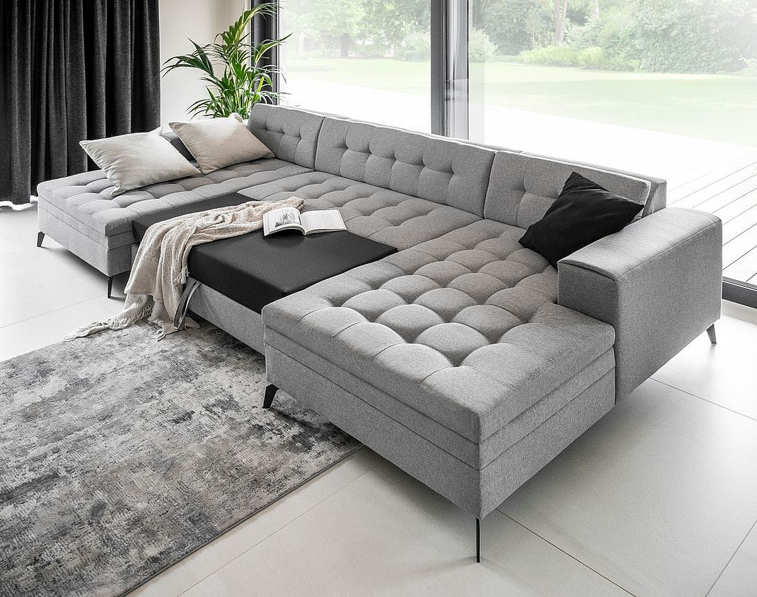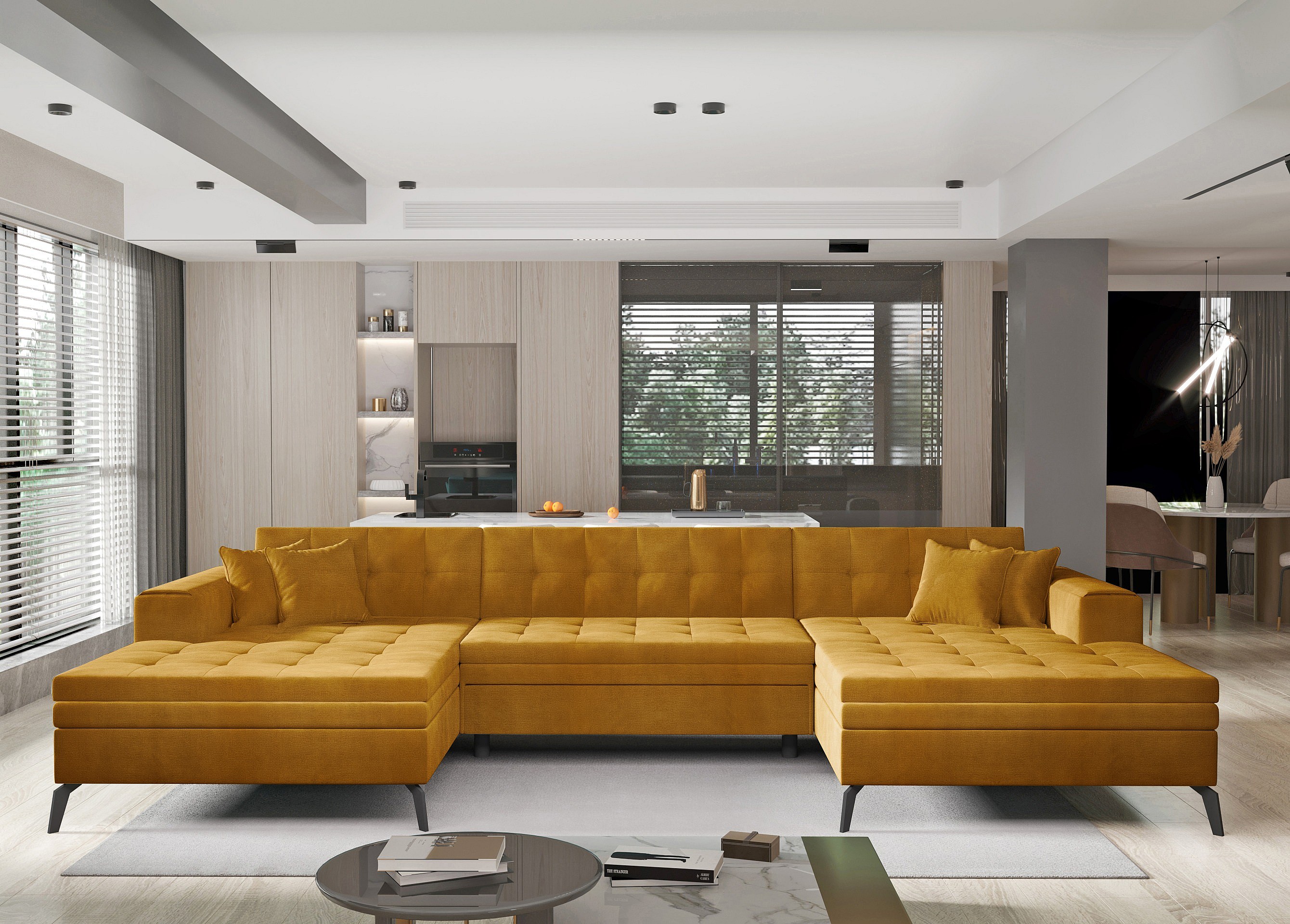 Canapé panoramique convertible tissu doux brillant capitonné orange Romy 350cm
