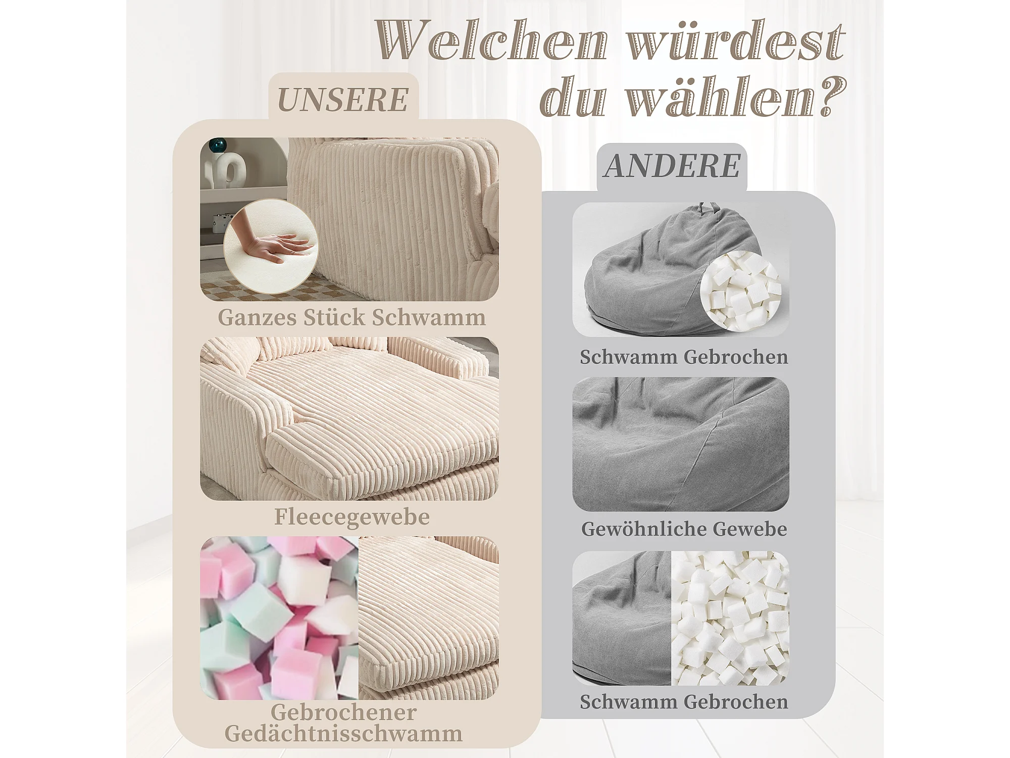 Canapé 2 places en velours côtelé beige – double couche & assise ultra basse – avec 3 coussins – idéal pour salon - 125x155x63cm