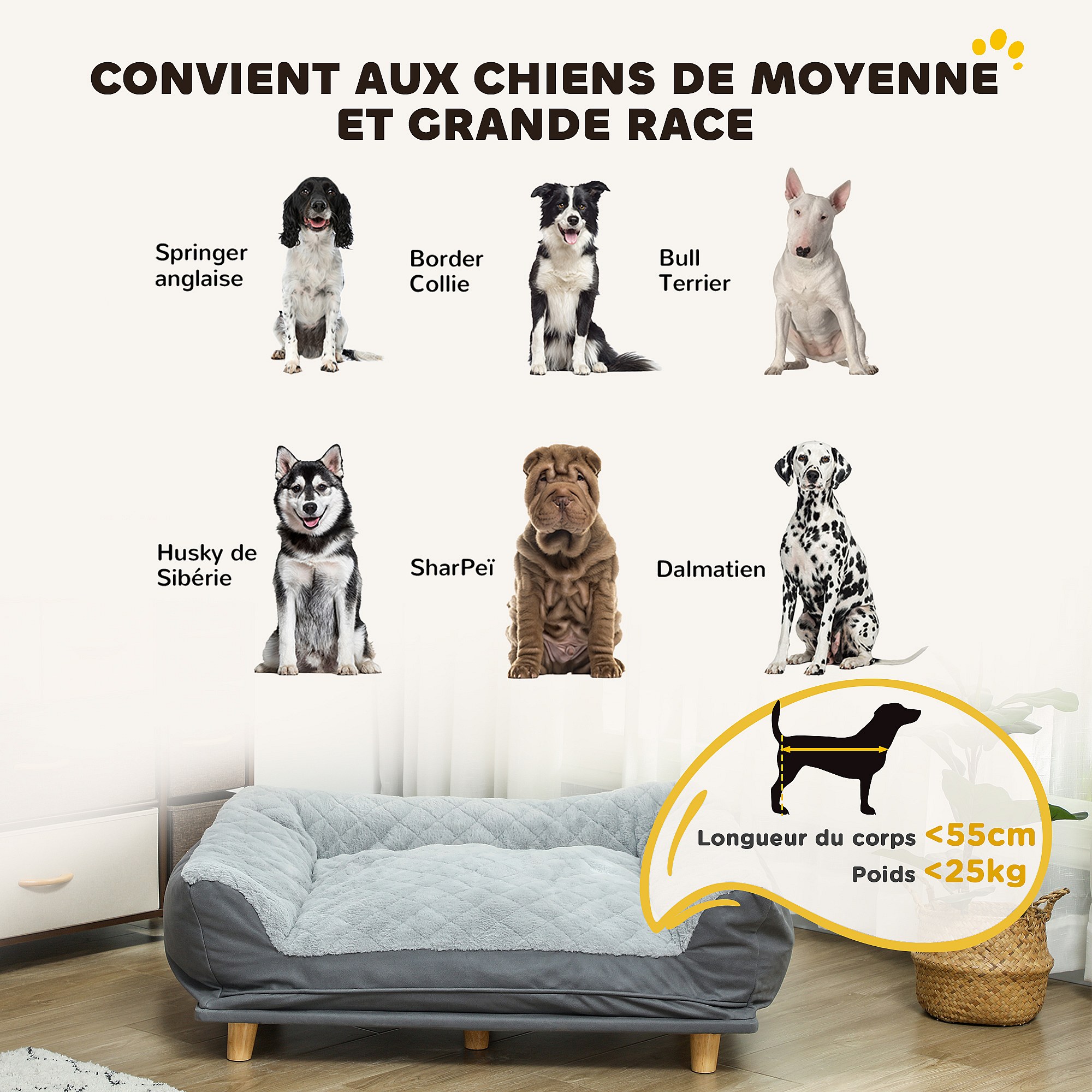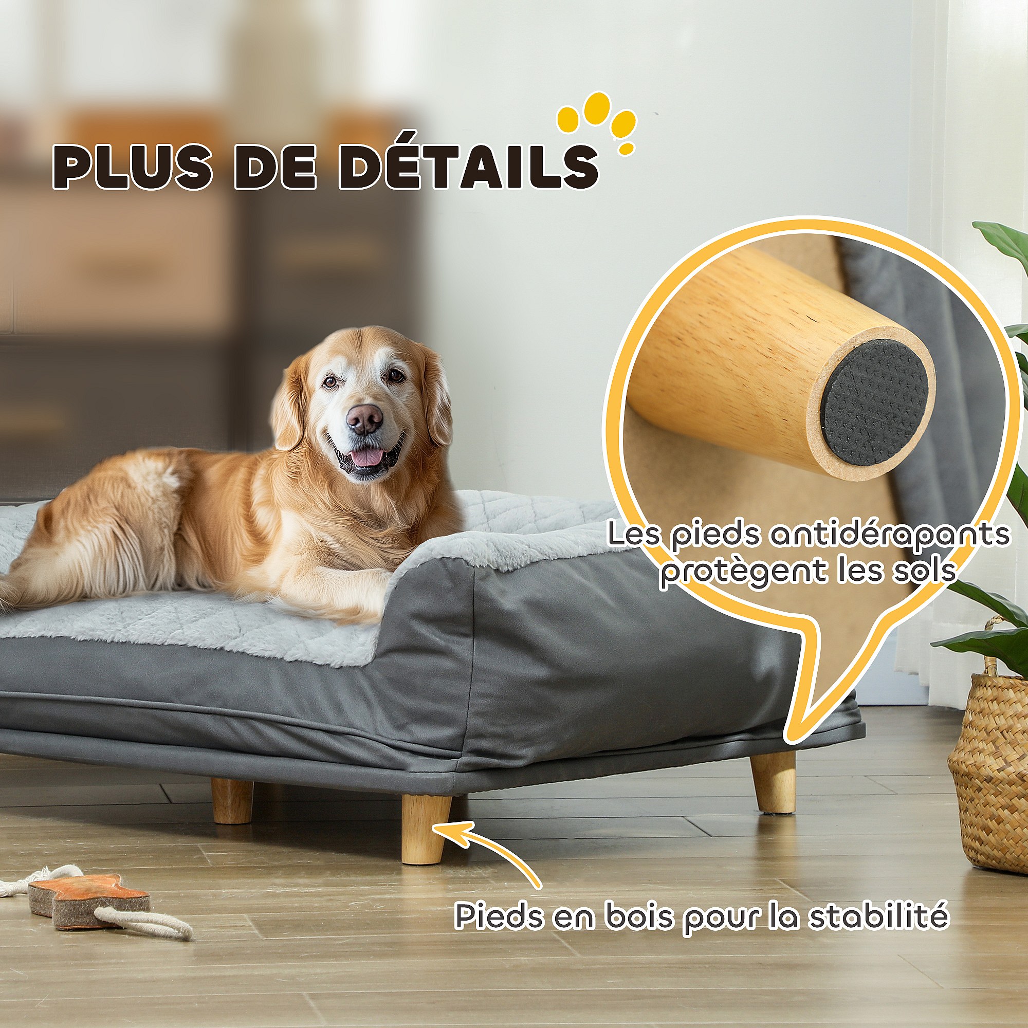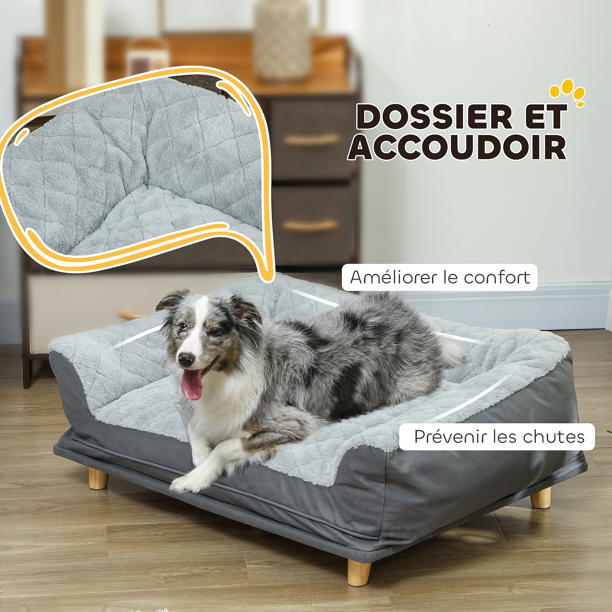 Canapé pour chien grande taille dim. 100L x 70l x 30H cm - housse zippée lavable - bois polyester gris