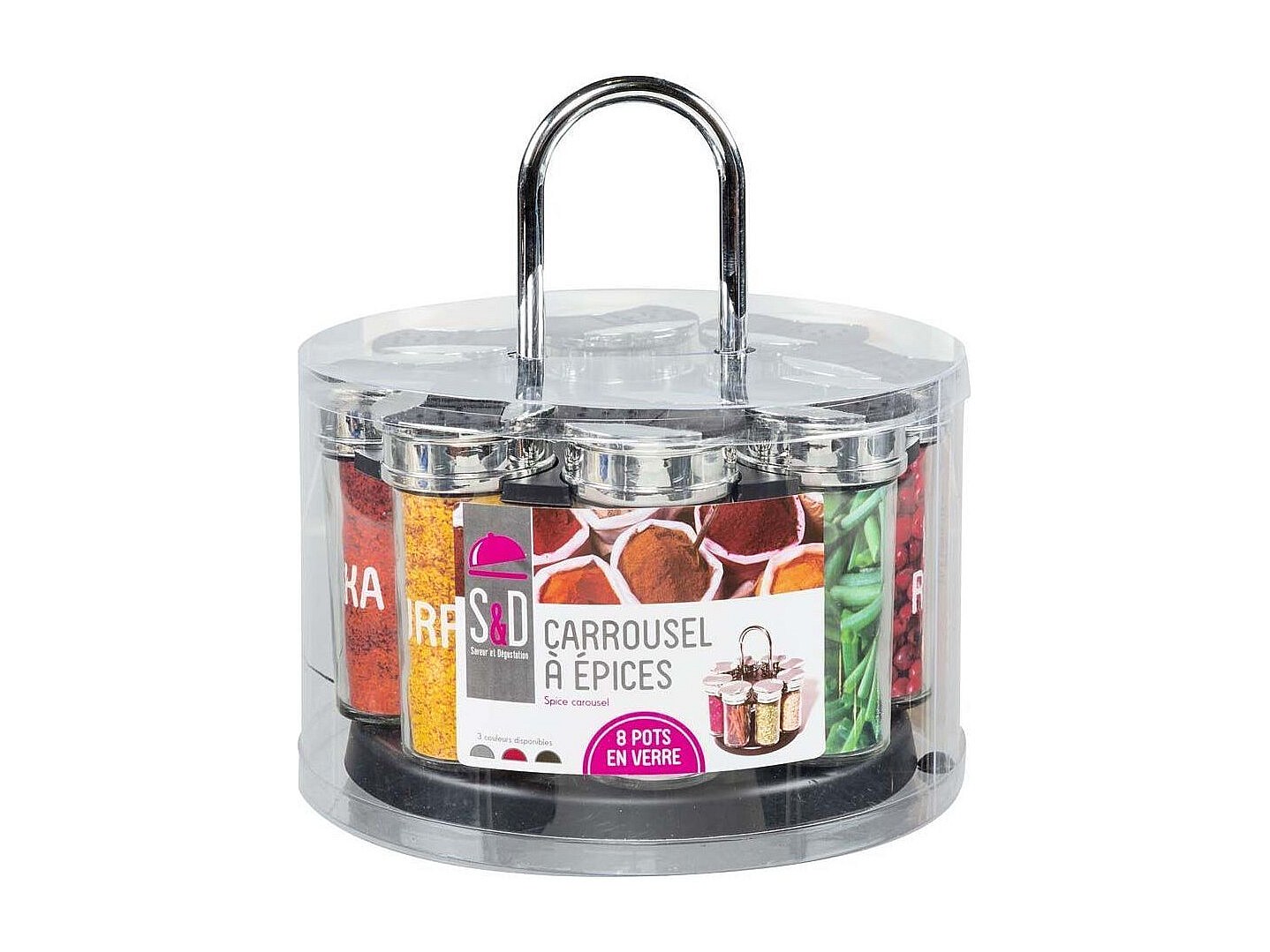 Carrousel Epices 8 Pots Couvercle Plastique Noir, Transparent
