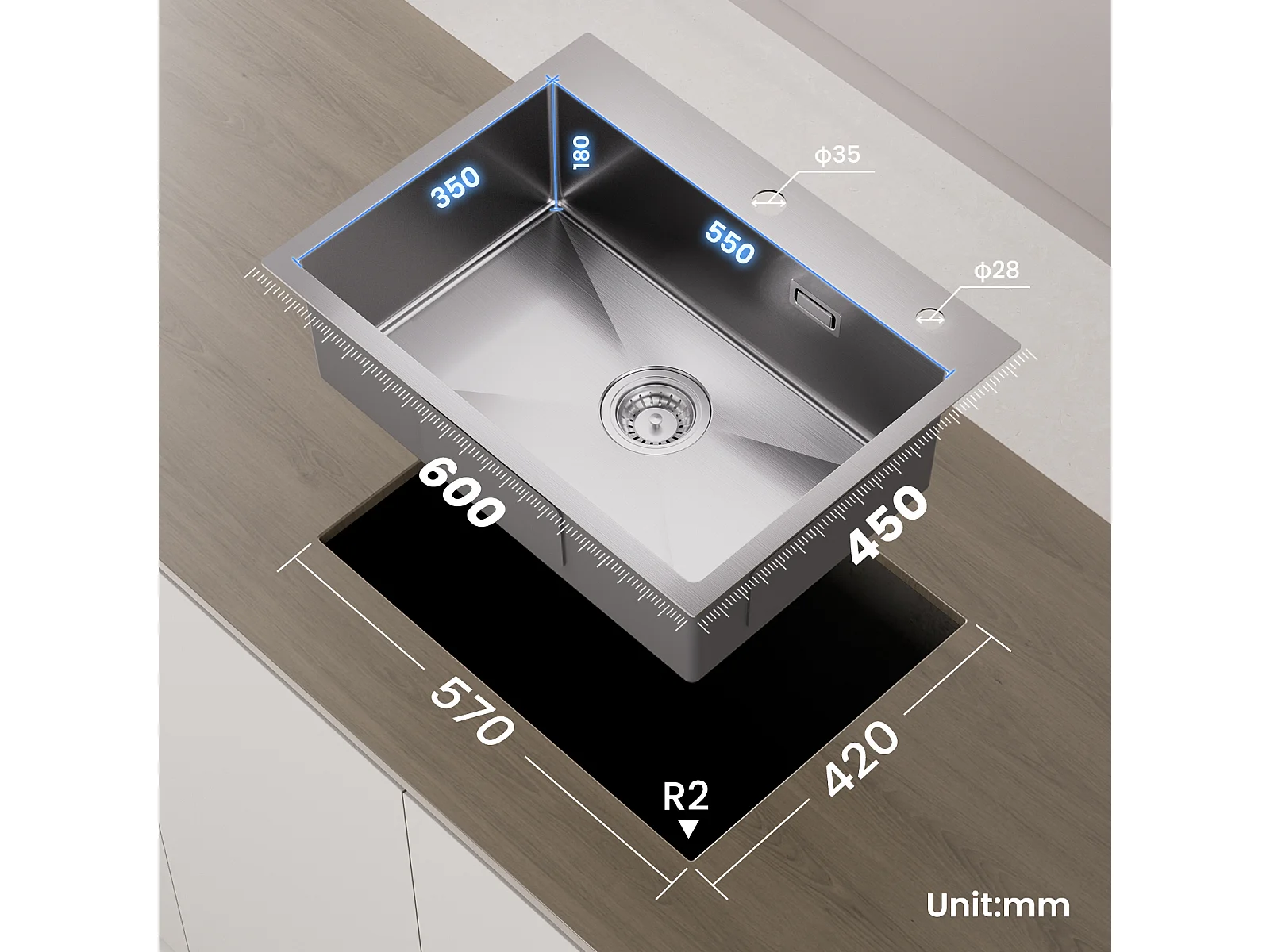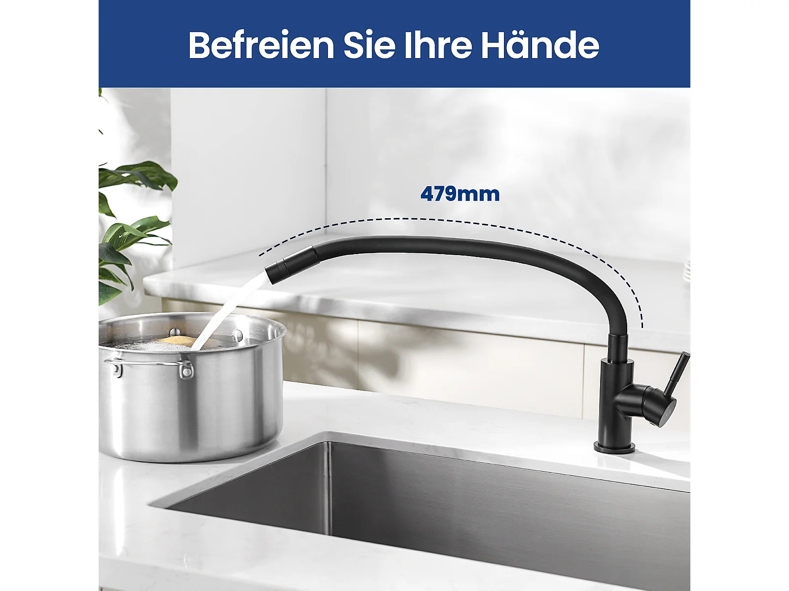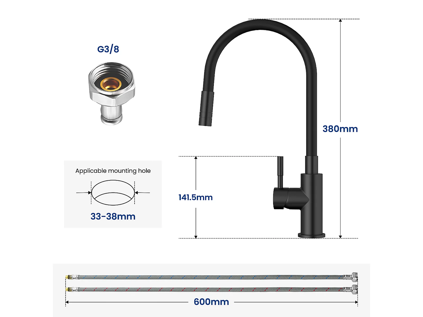 CECIPA MAX Évier 1 Bac 60×45cm Évier Inox Brossé avec Panier de Drainage + Flexible Mitigeur de Cuisine, 2 Types de Jets Robinet Extractible Noir