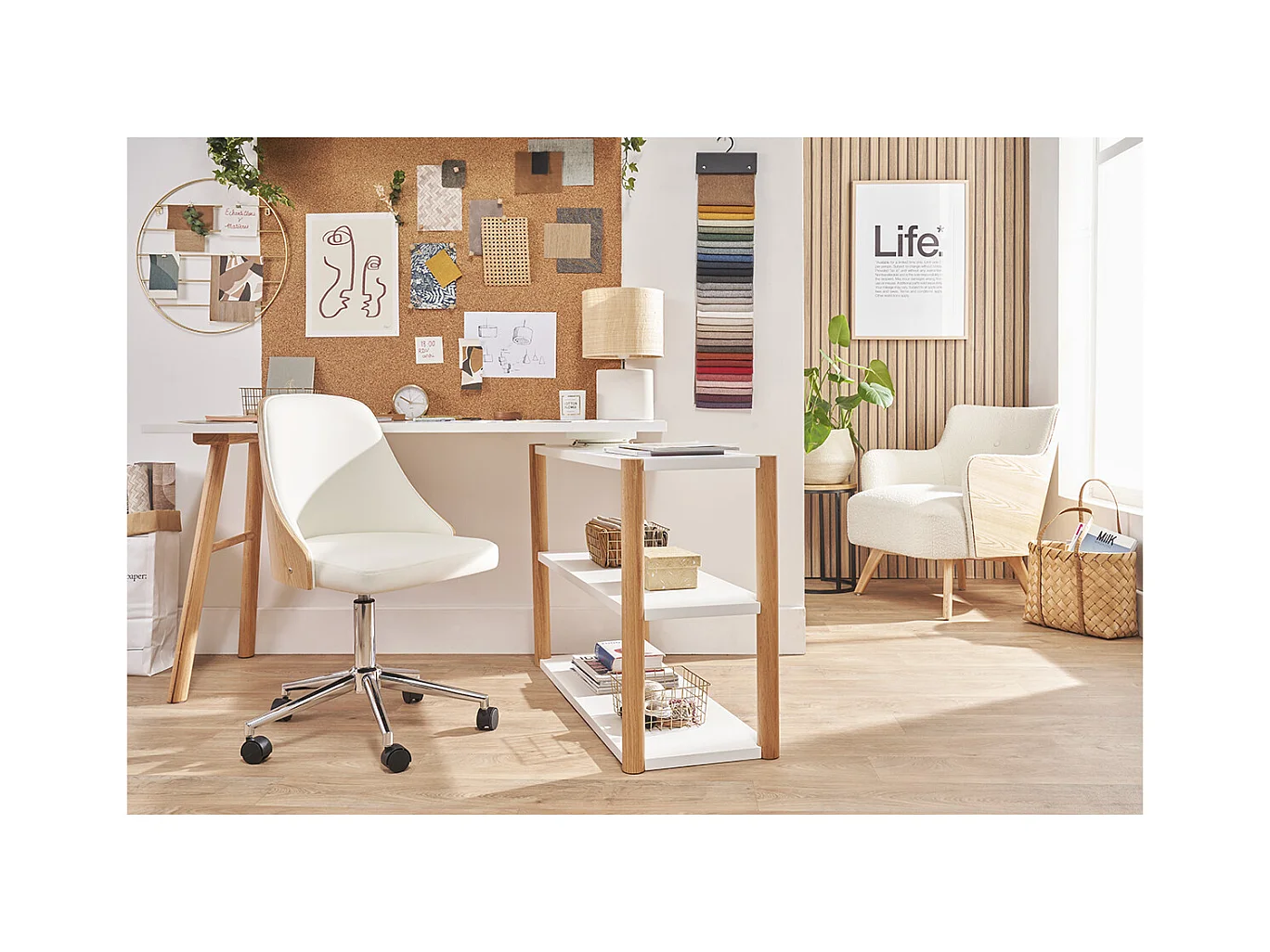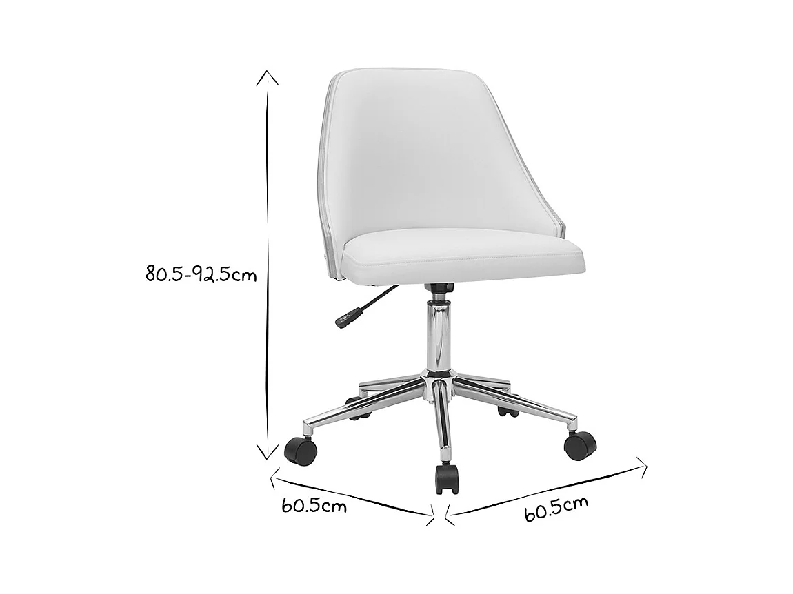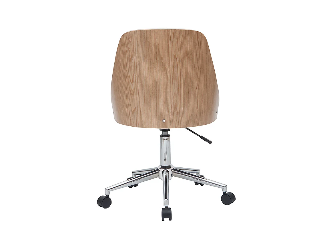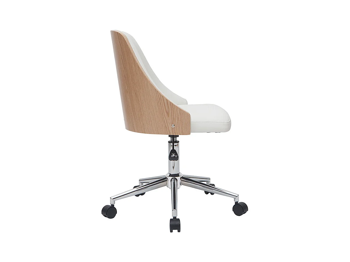 Chaise de bureau à roulettes design blanc, bois clair et acier chromé QUINO