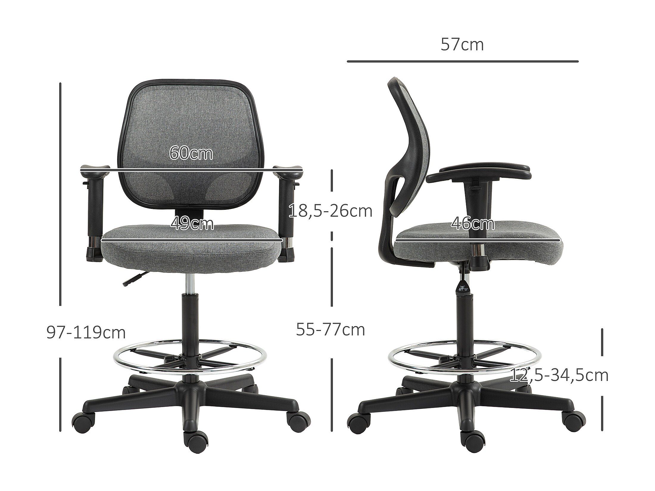 Chaise de bureau assise haute réglable accoudoirs réglables pivotante 360° tissu gris chiné