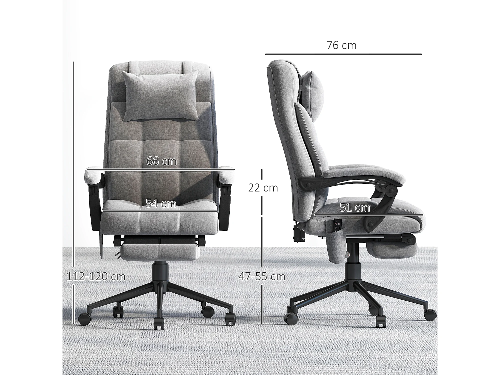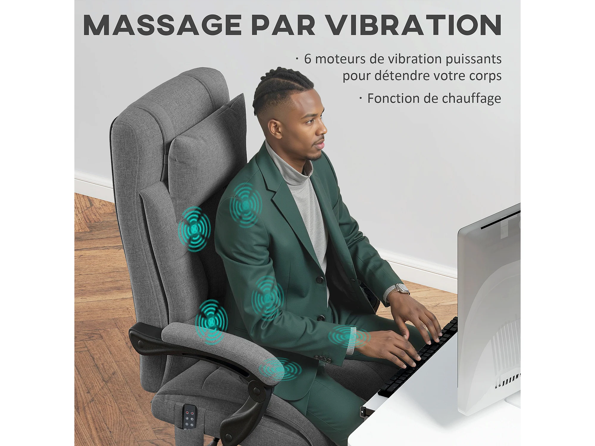 Chaise de bureau ergonomique design - fonctions massante et chauffante - inclinable, réglable - repose-pied - tissu gris