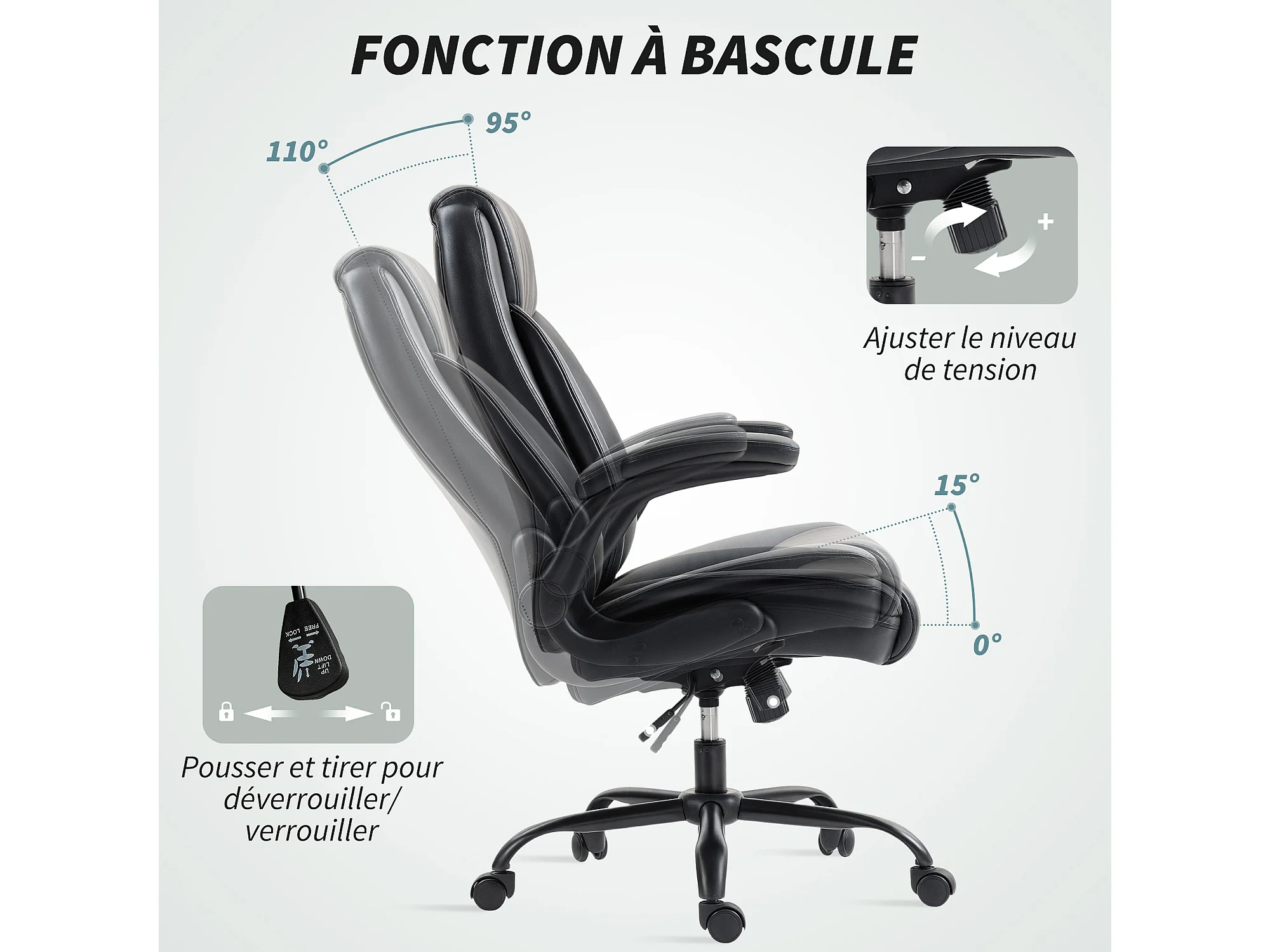 Chaise bureau ergonomique assise haute réglable 53-78cm pivotant accoudoirs relevables noir