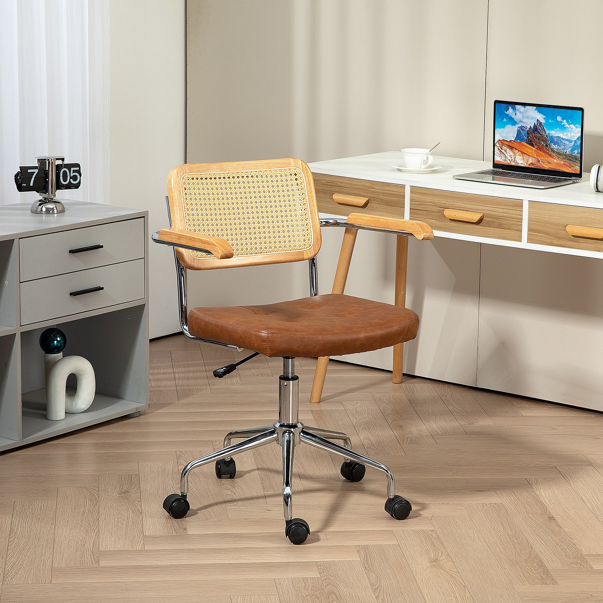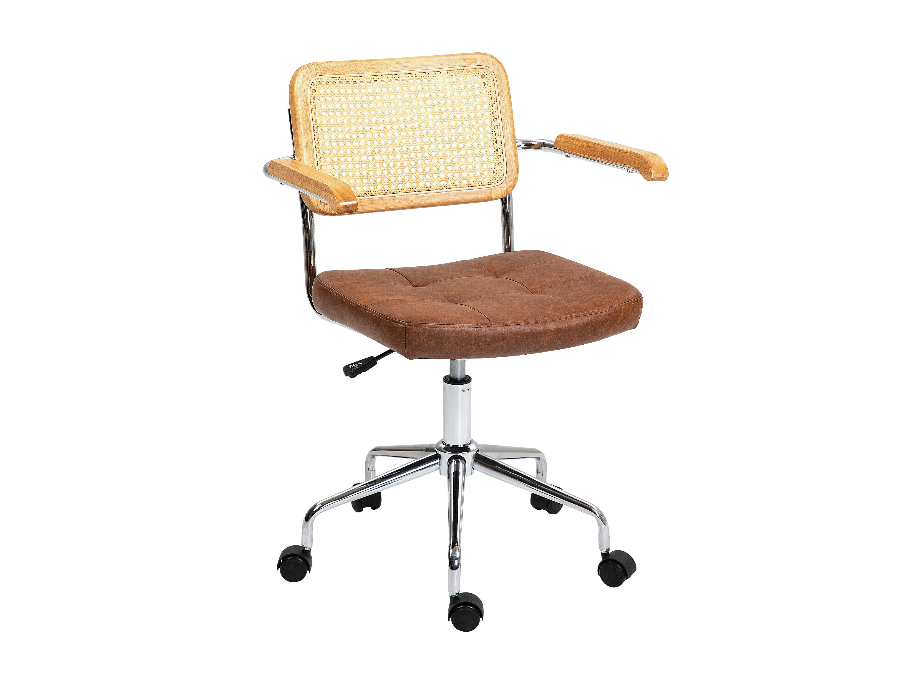 Chaise de bureau style vintage - réglable, pivotante - acier chromé bois aspect rotin assise effet capitonné