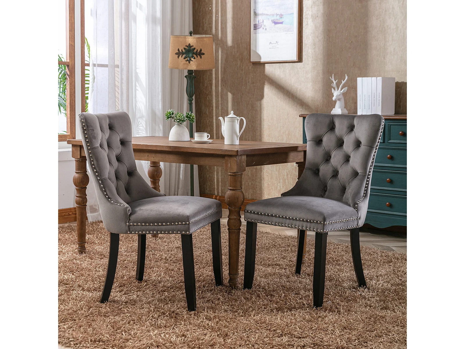 Chaise de salle à manger capitonnée, bois massif, piètement bois, rivets décoratifs, velours, gris (65x50x95 cm)