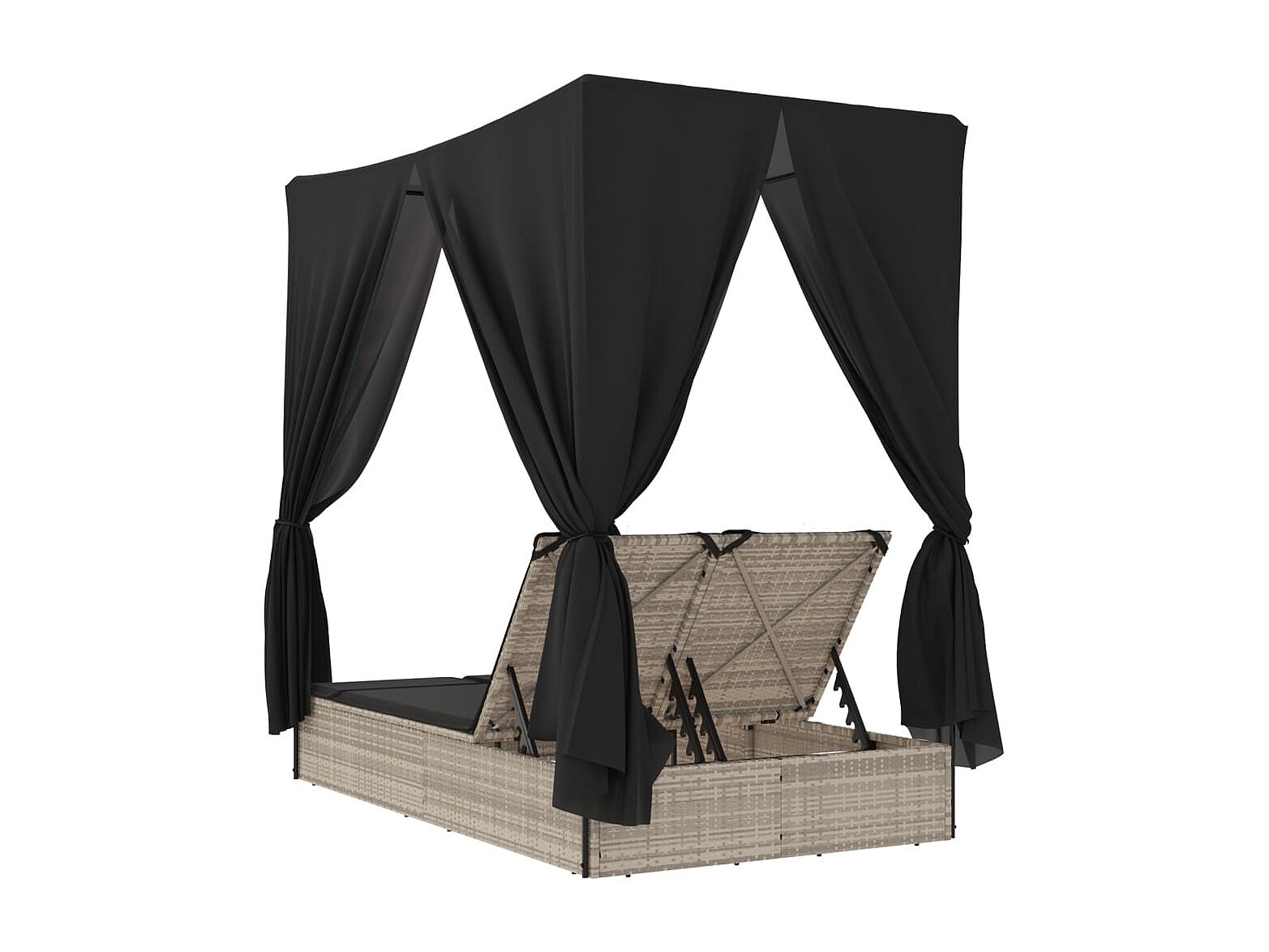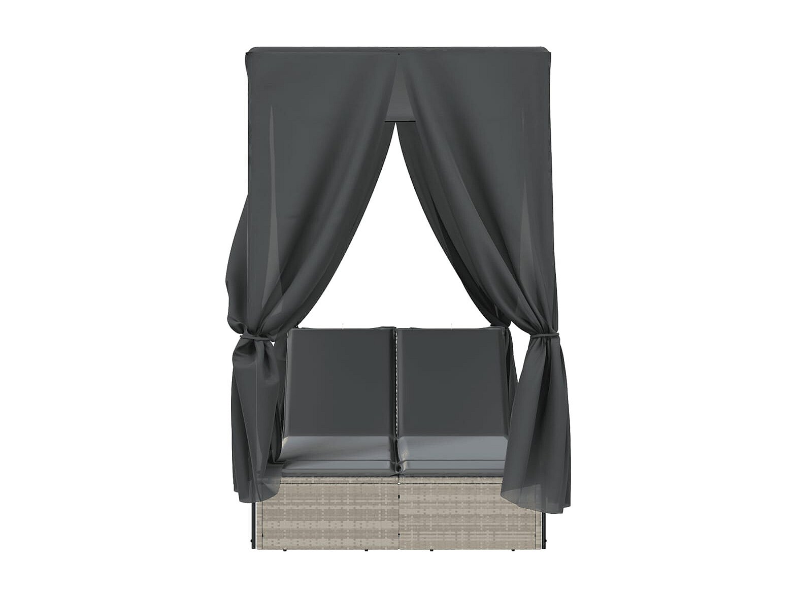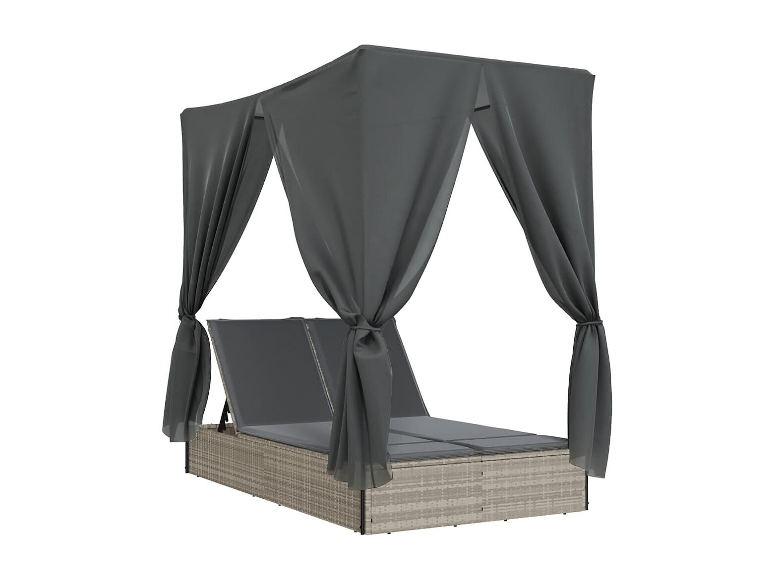 Chaise longue double avec toit et rideaux gris clair poly rotin