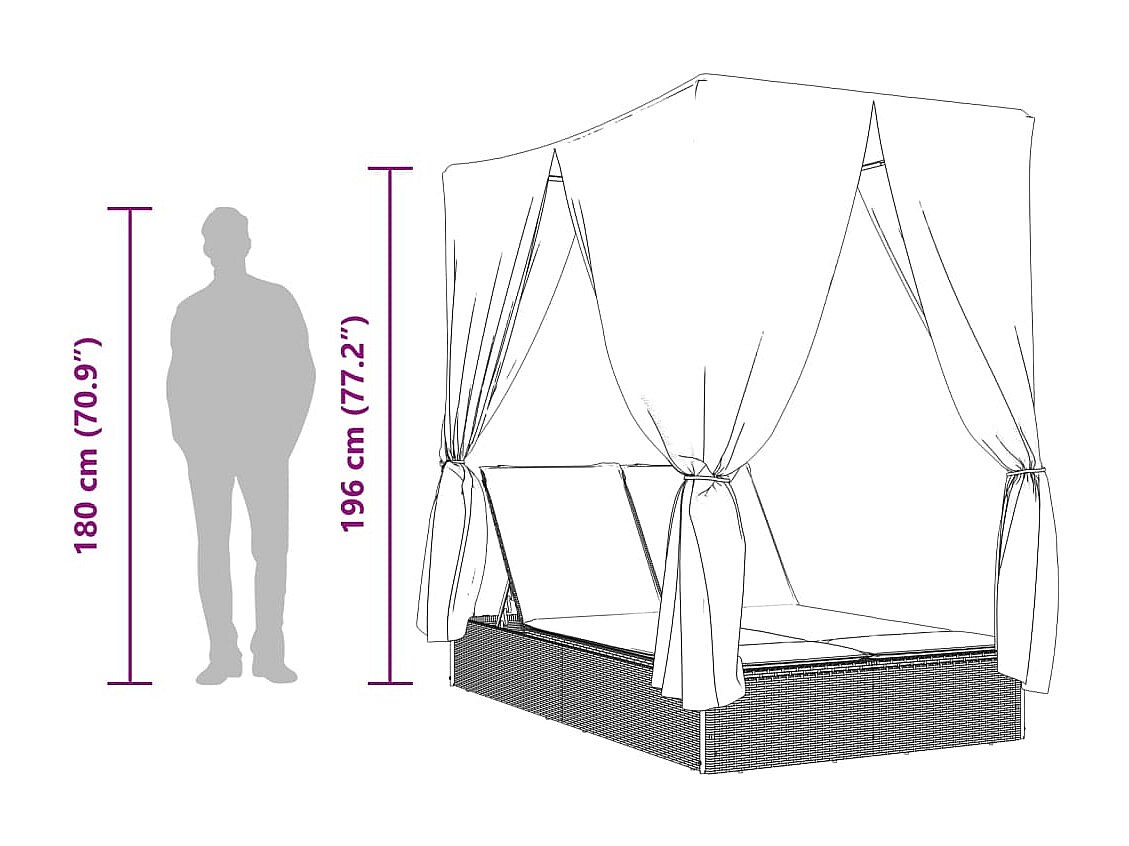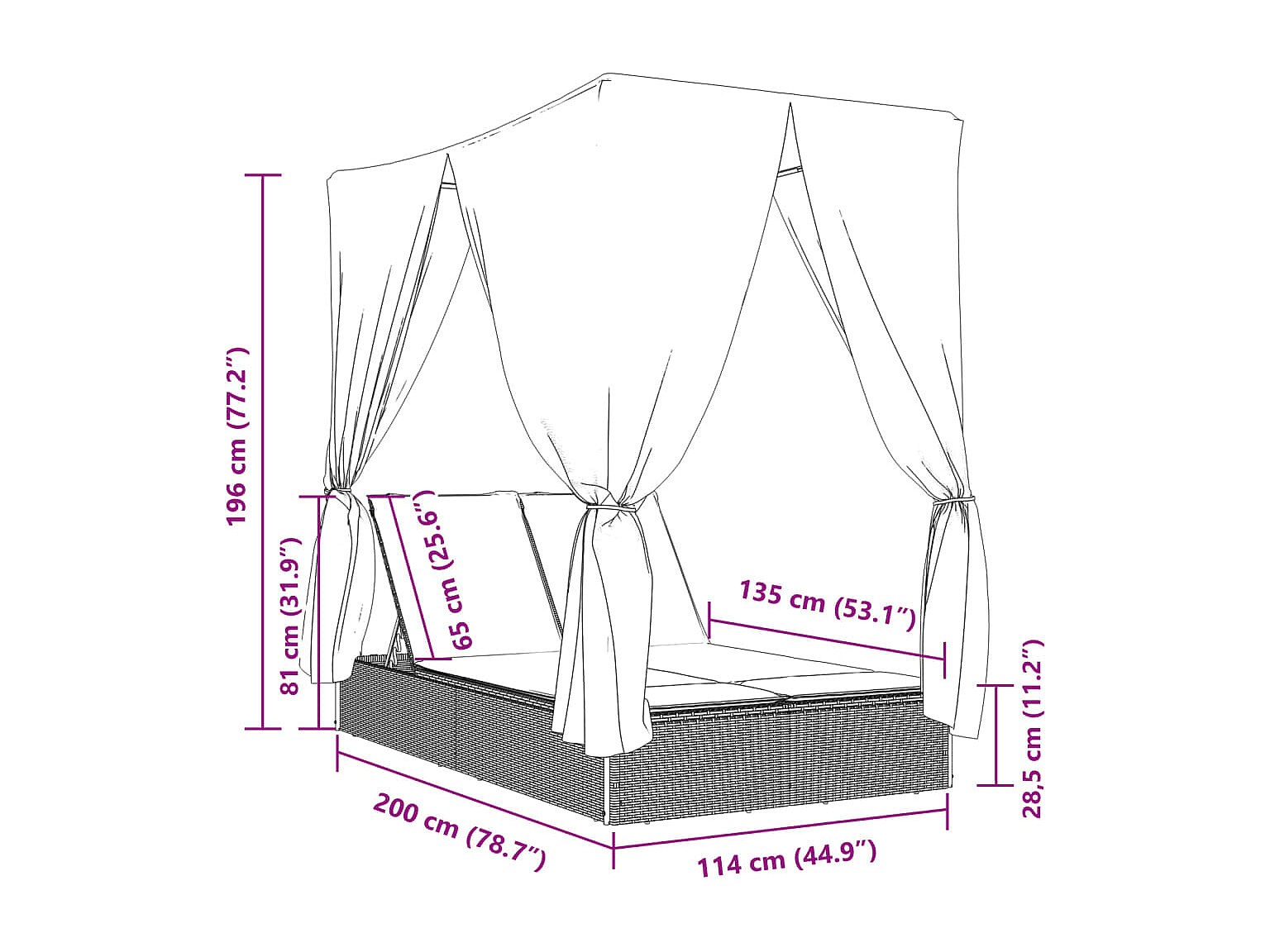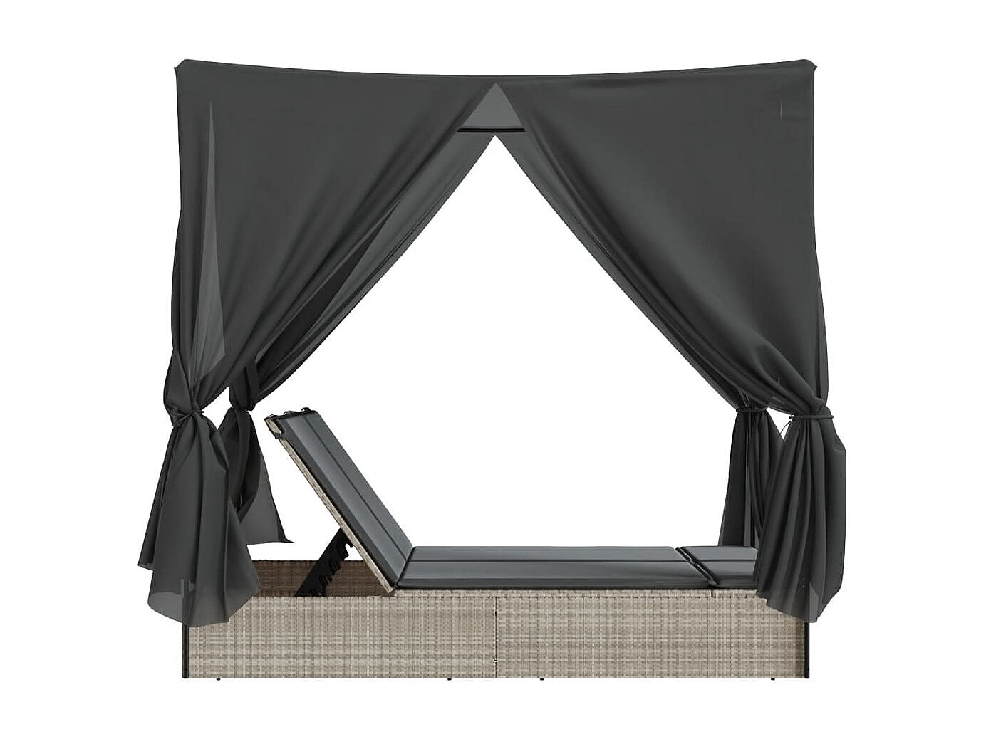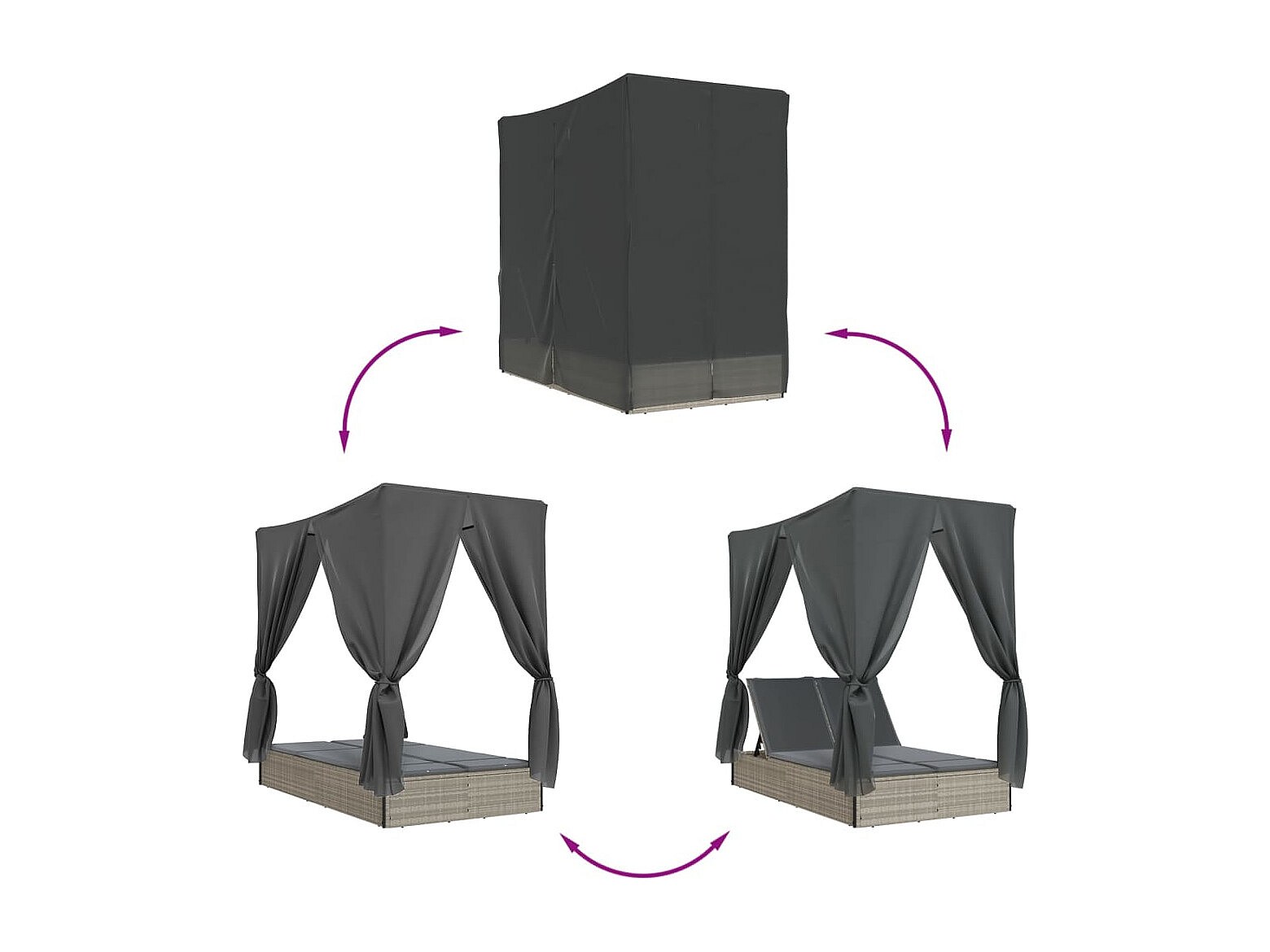 Chaise longue double avec toit et rideaux gris clair poly rotin