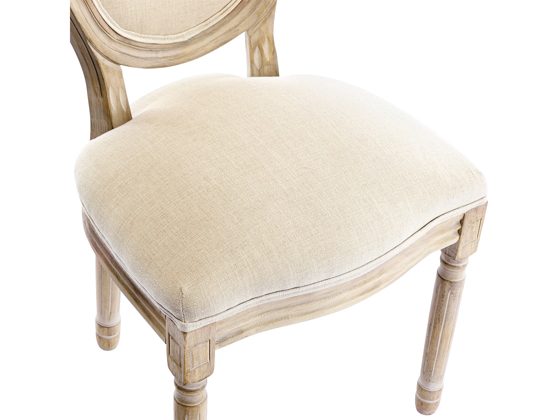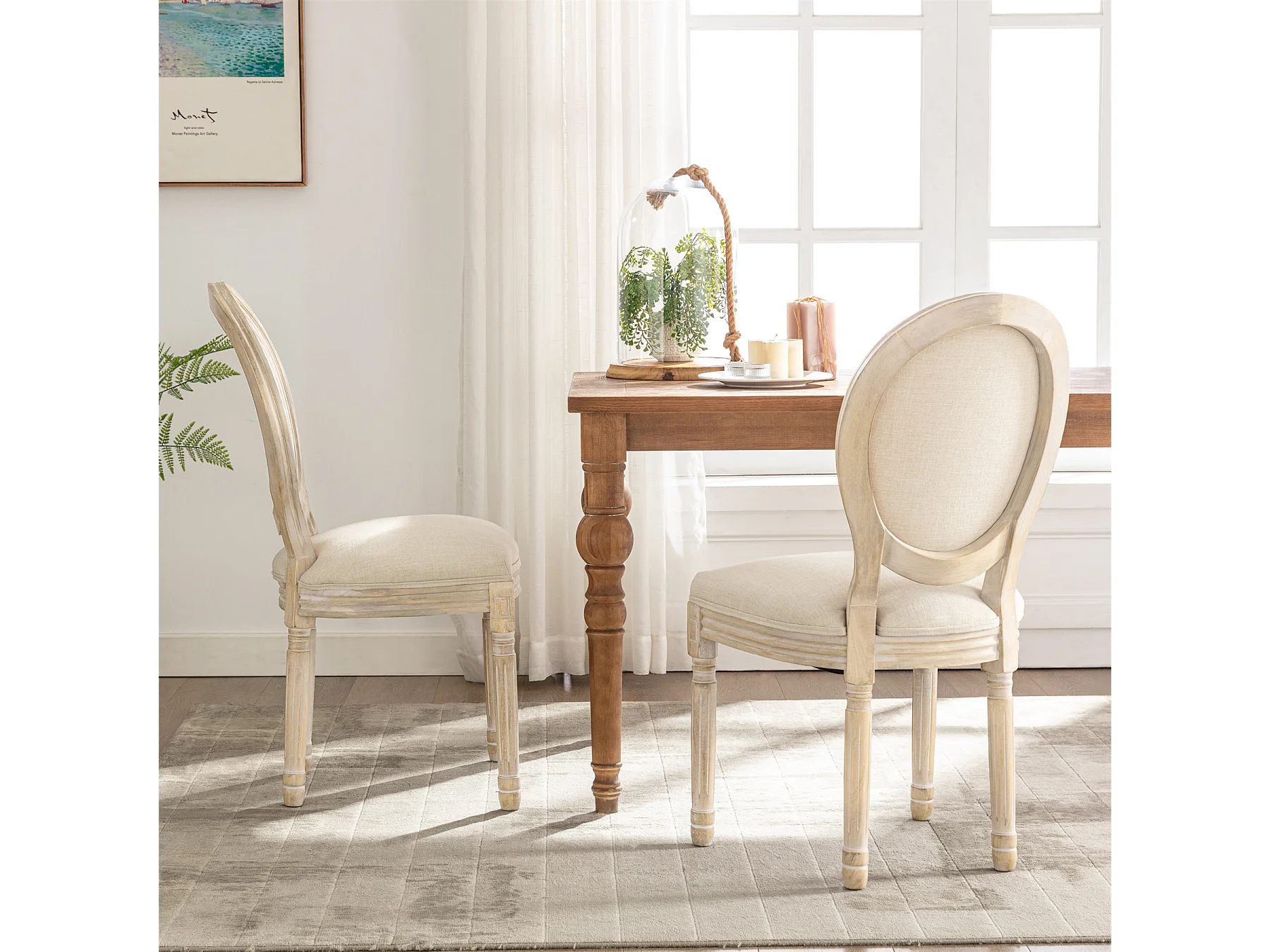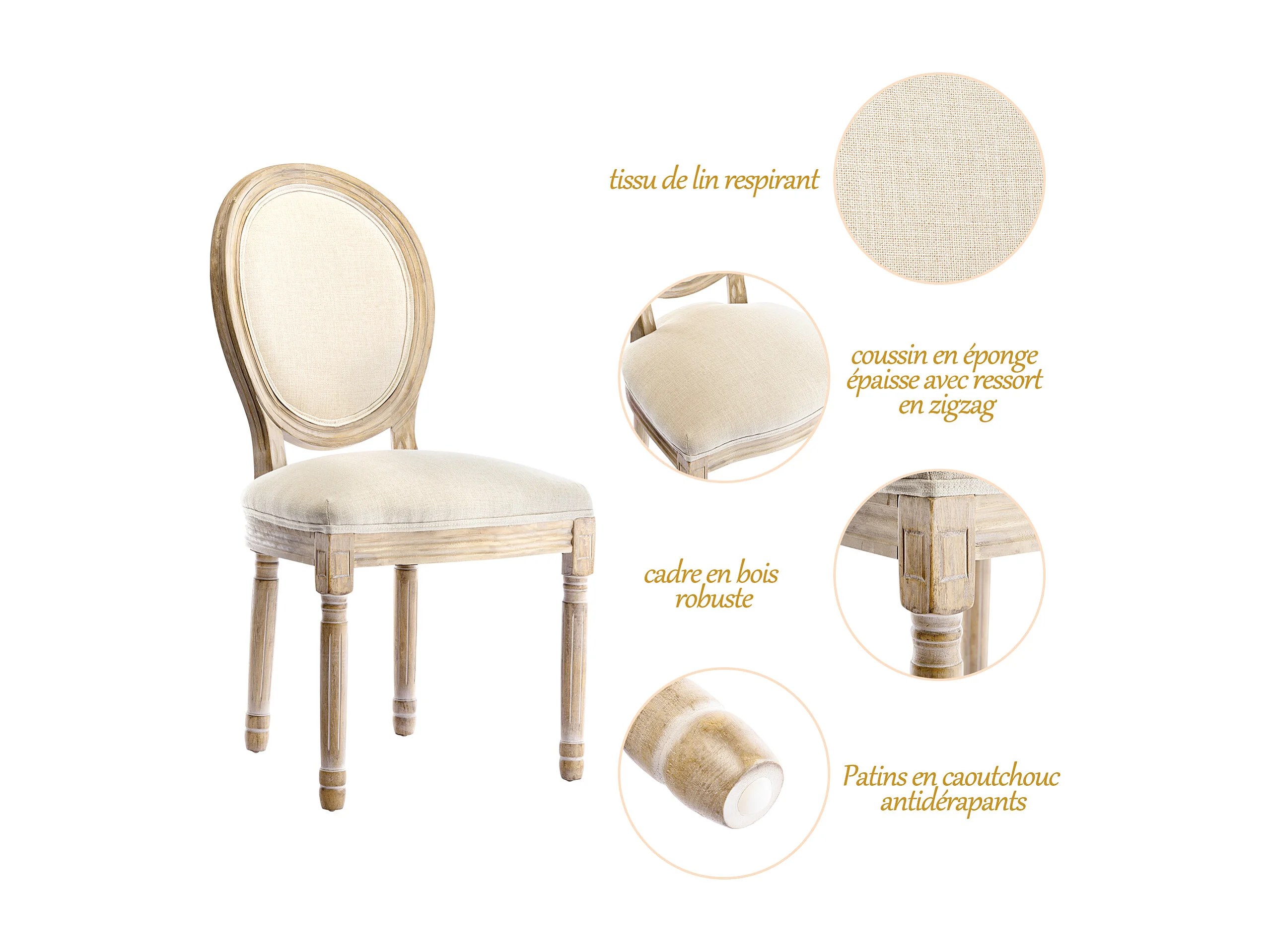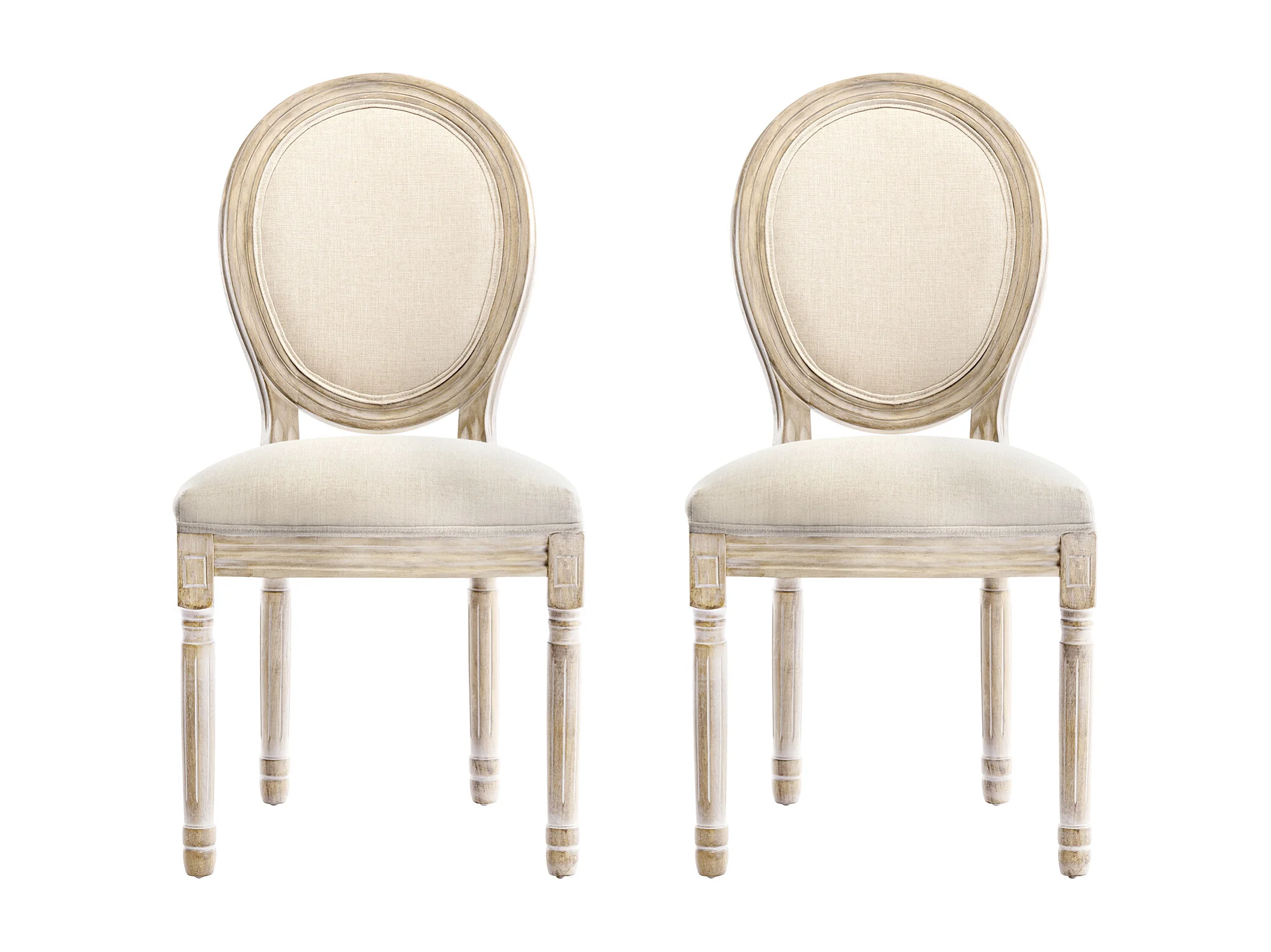 Lot de 2 chaises de salle à manger - Chaise médaillon style Louis XVI en bois massif sculpté et patiné - Tissu lin beige - Style rétro élégant