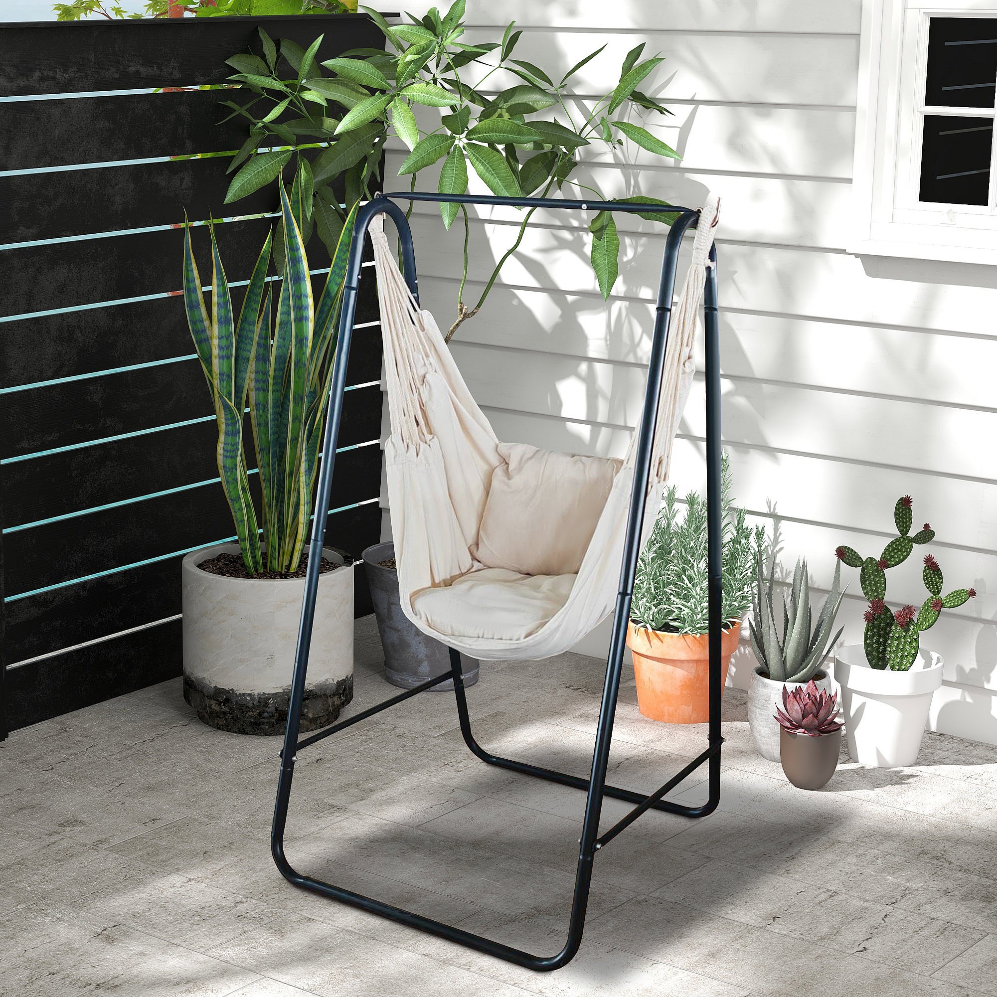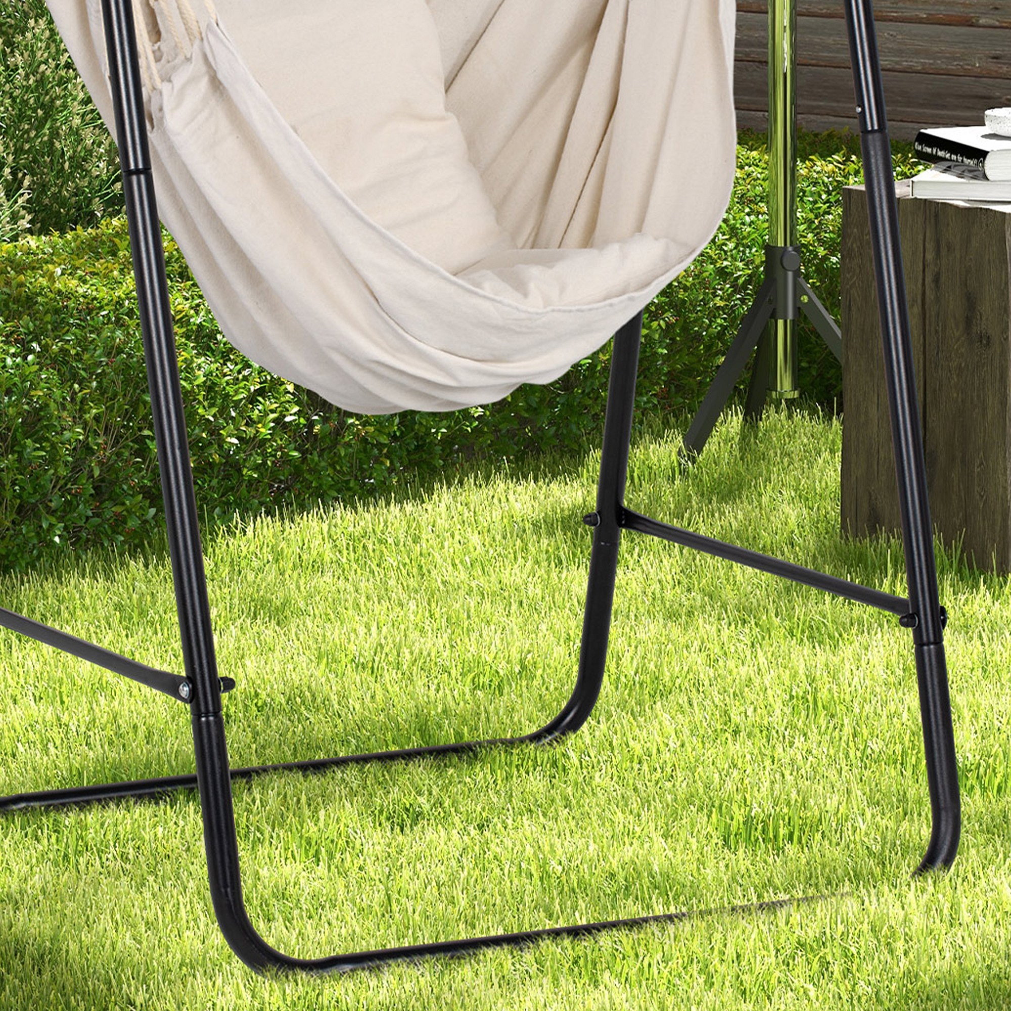 Chaise suspendue de jardin avec support et coussin acier noir coton beige