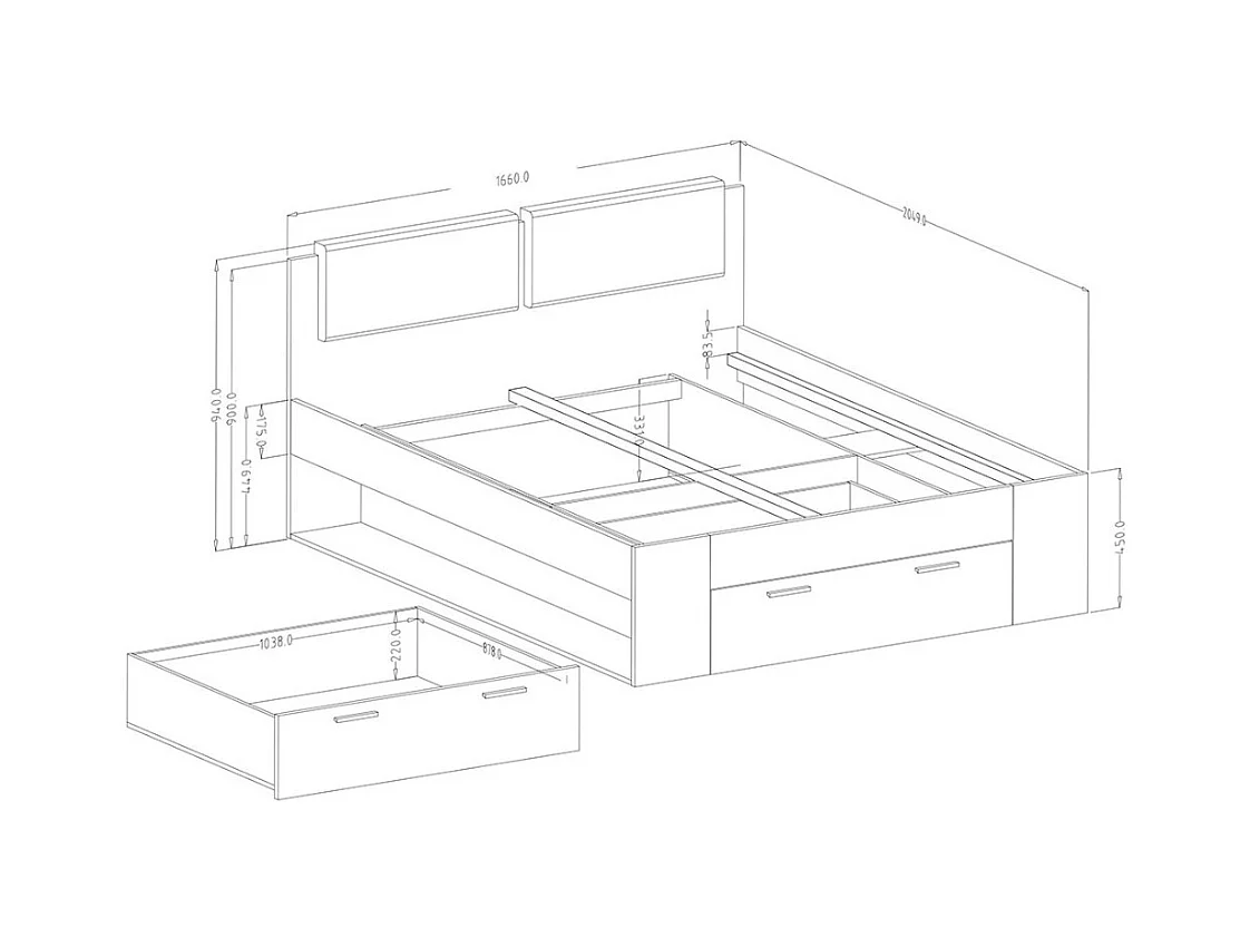Chambre à coucher FLOYD : Armoire 220cm, Lit 160x200, commode, chevets. Couleur chêne foncé et noir brillant