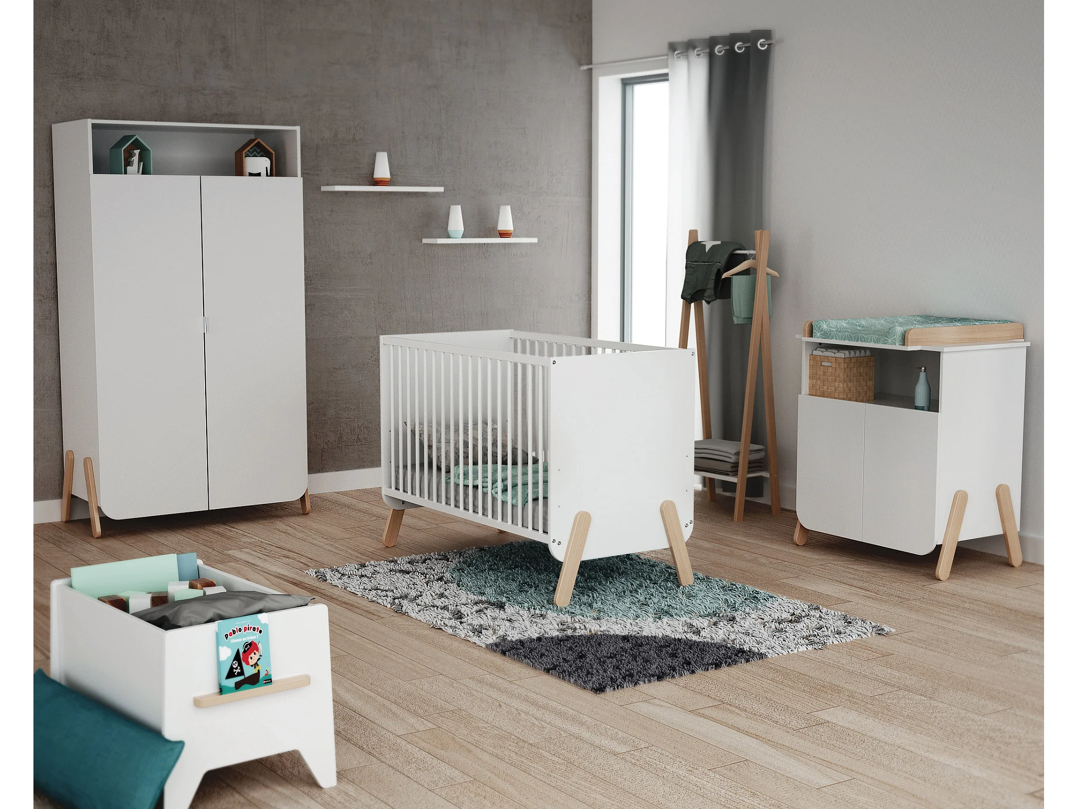 Chambre bébé lit, meuble à langer et armoire Blanc et Hêtre Verni
