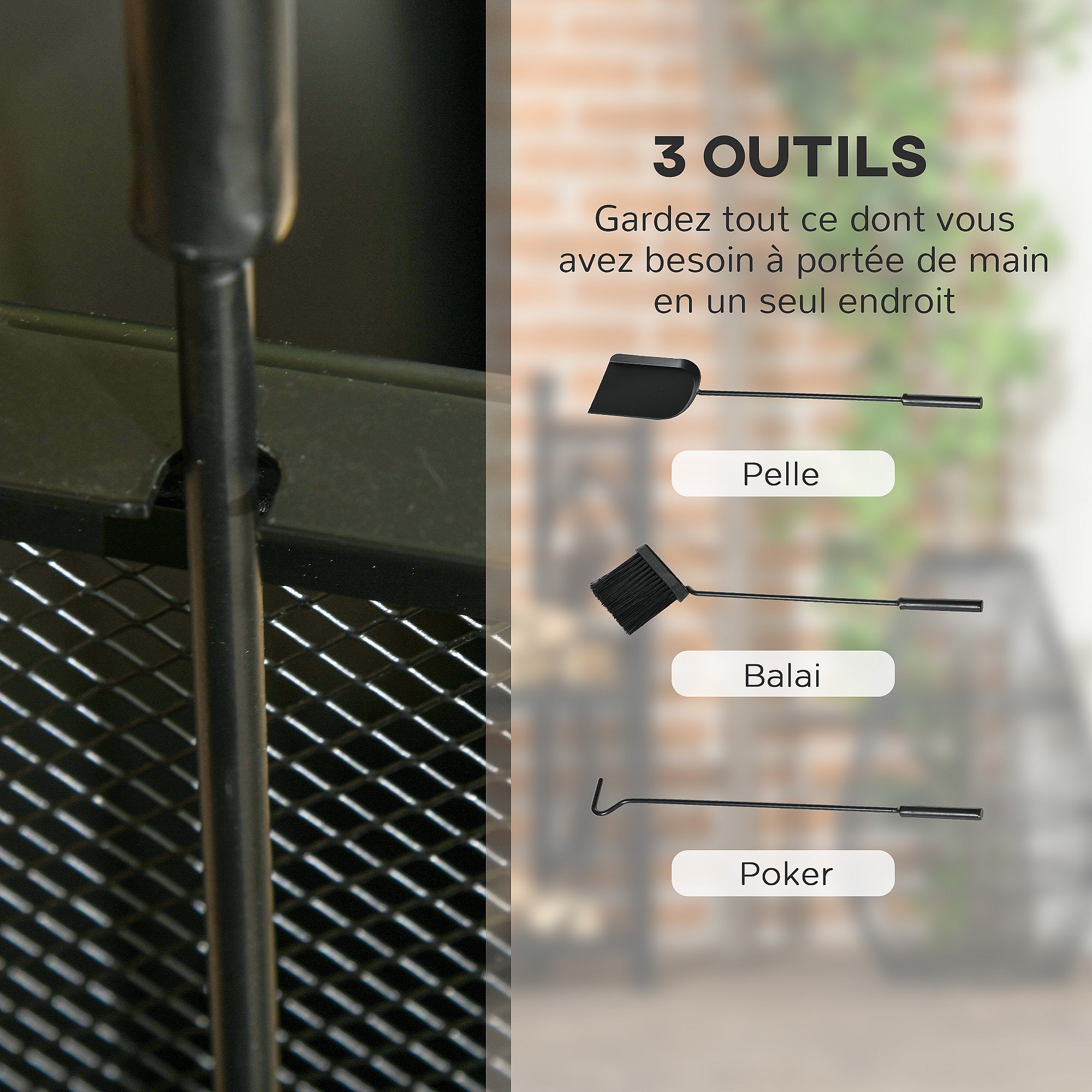 Serviteur de cheminée colonne - porte bûches - range bûches multi accessoires dim. 34L x 34l x 111H cm métal noir