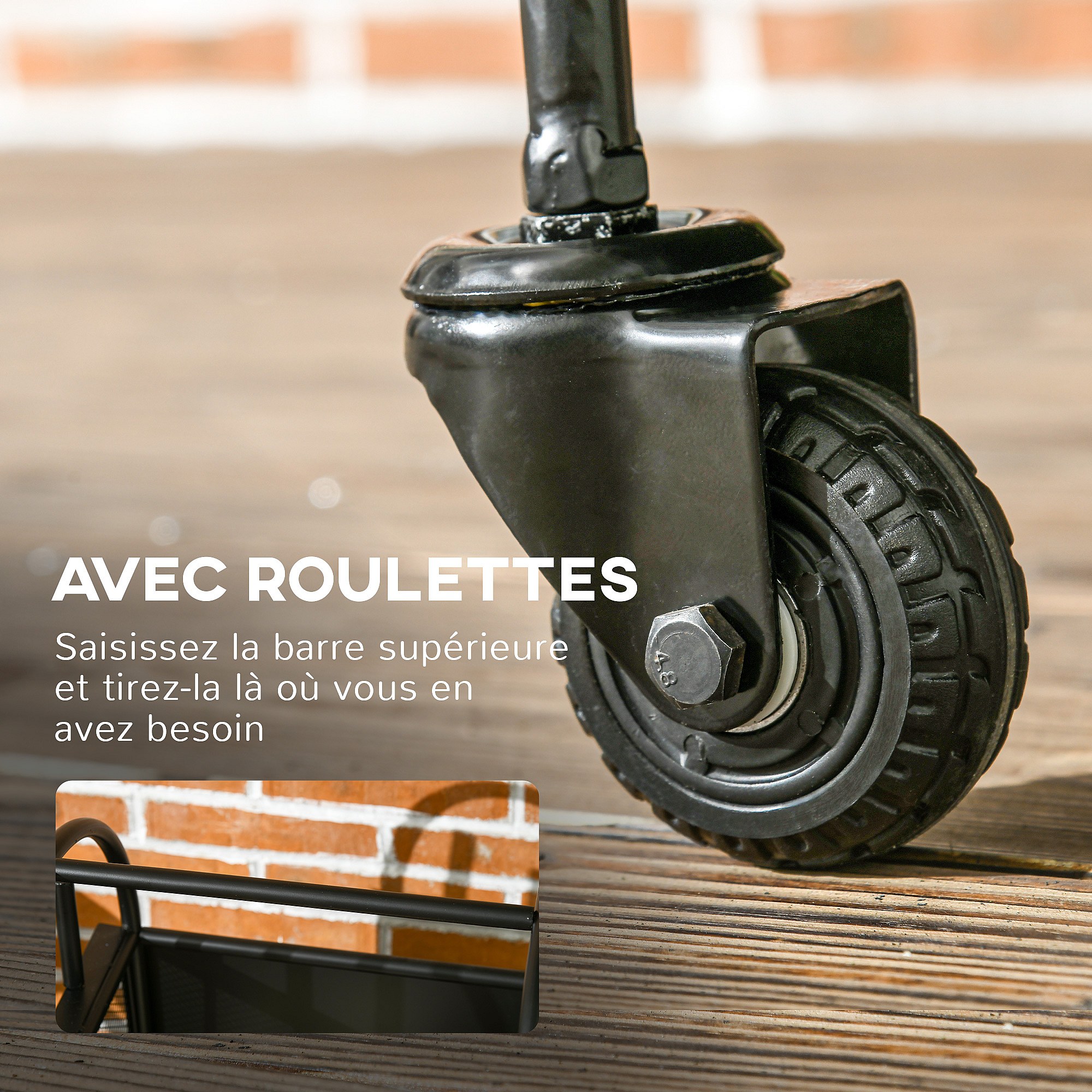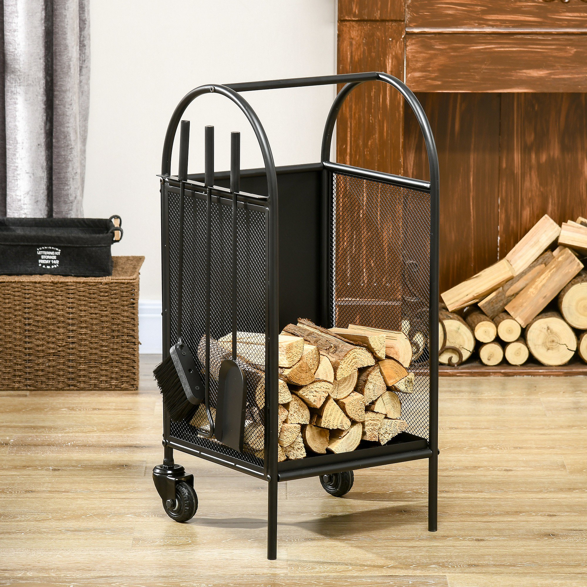 Chariot - porte bûches - range bûches - multi-accessoires avec 2 roulettes métal noir
