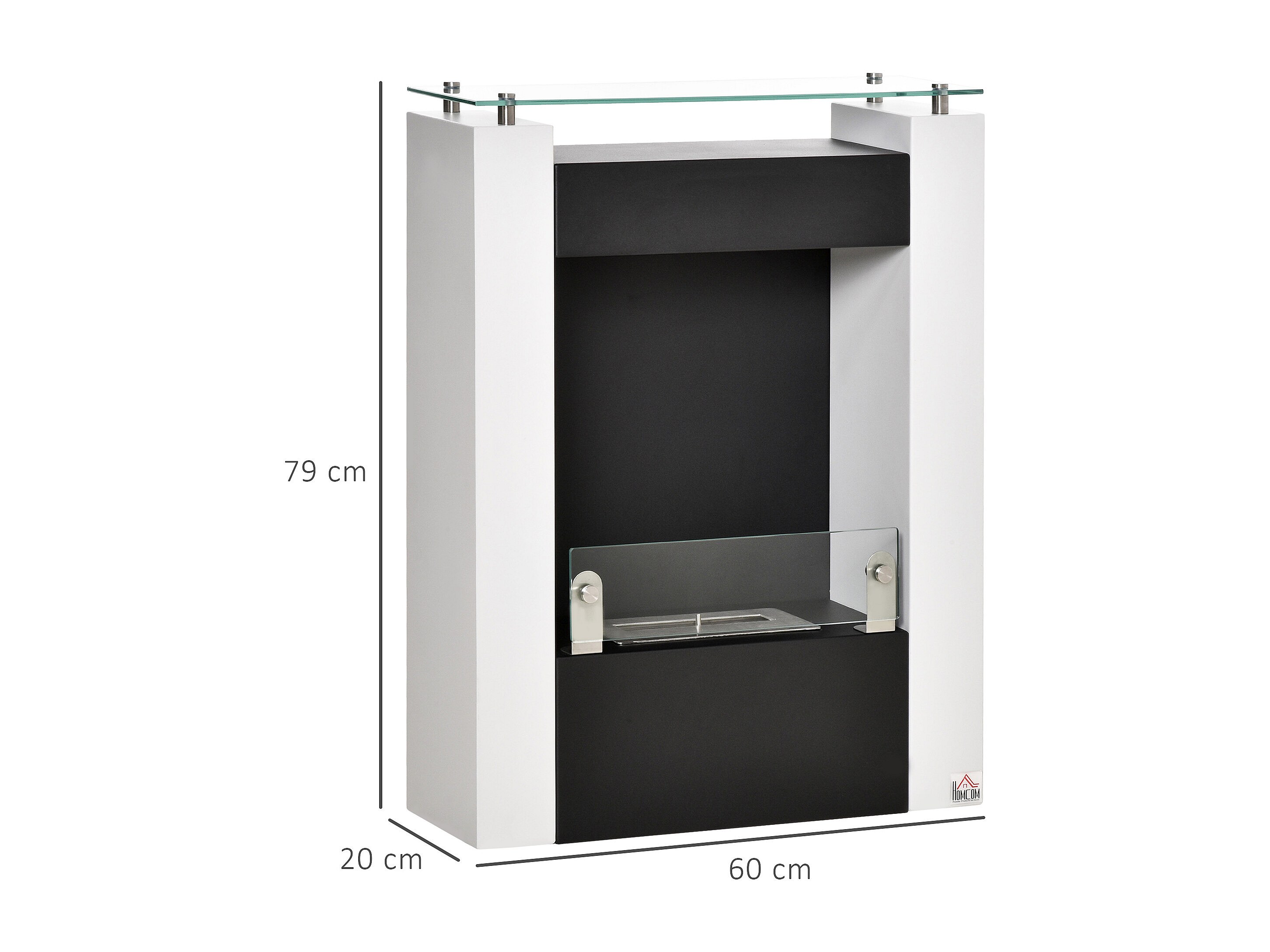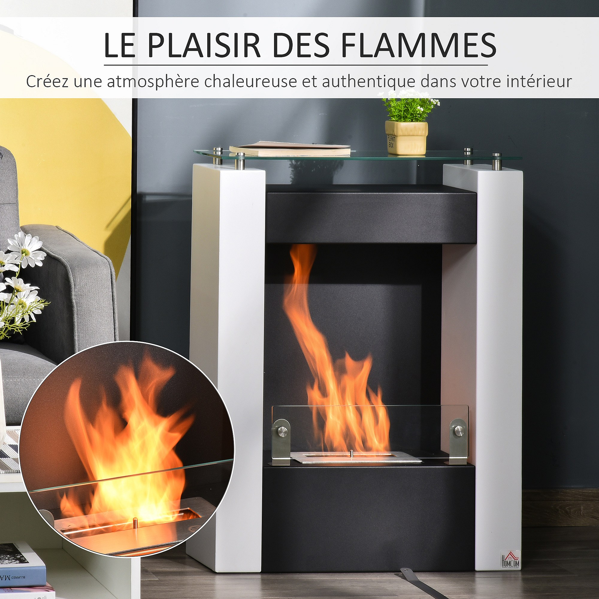 Cheminée bioéthanol design contemporain - étagère, pare-feu verre trempé 6 mm - brûleur 1,5 L - contrôle de flamme et manche inclus - acier noir blanc