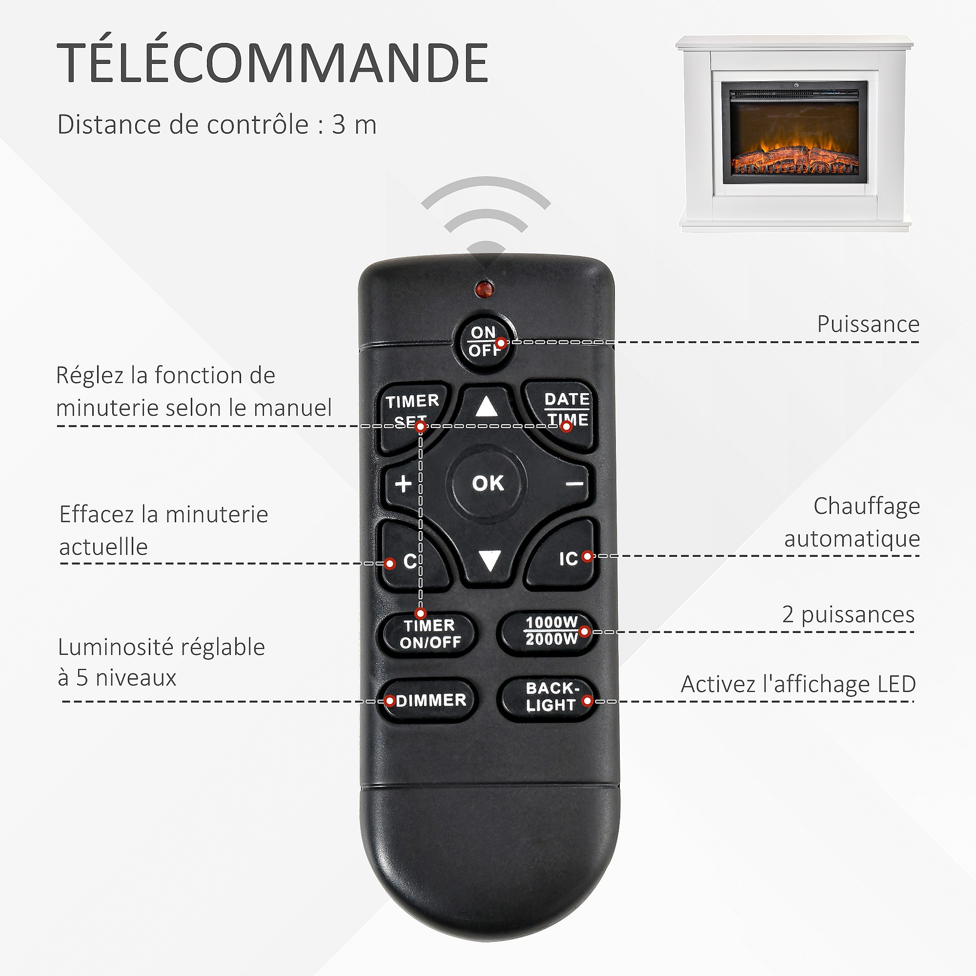 Cheminée électrique grande taille 2000 W effet flammes LED minuterie température luminosité réglables télécommande fournie blanc