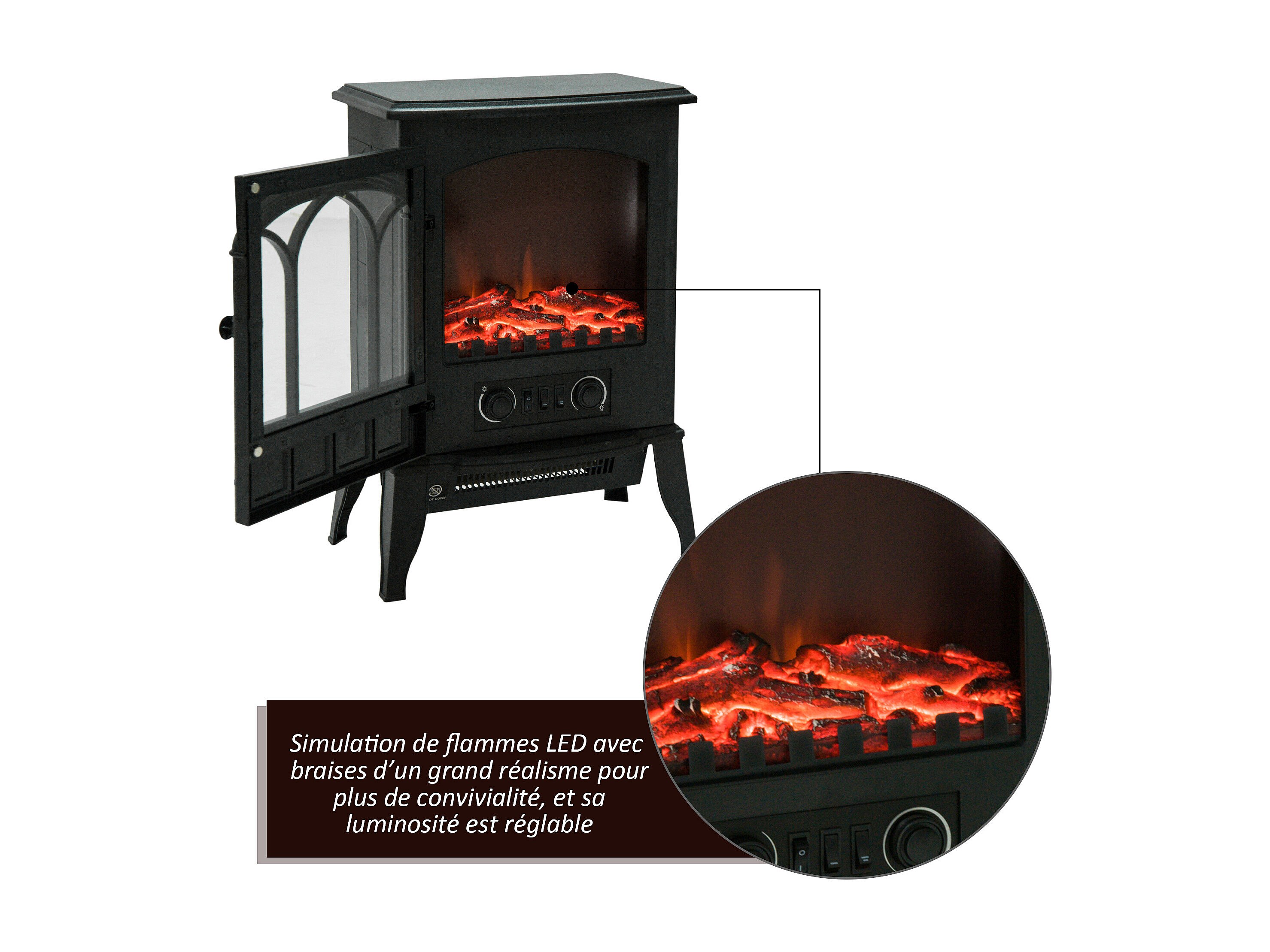Cheminée électrique poêle style rétro 1000-2000 W simulation flammes LED porte noir
