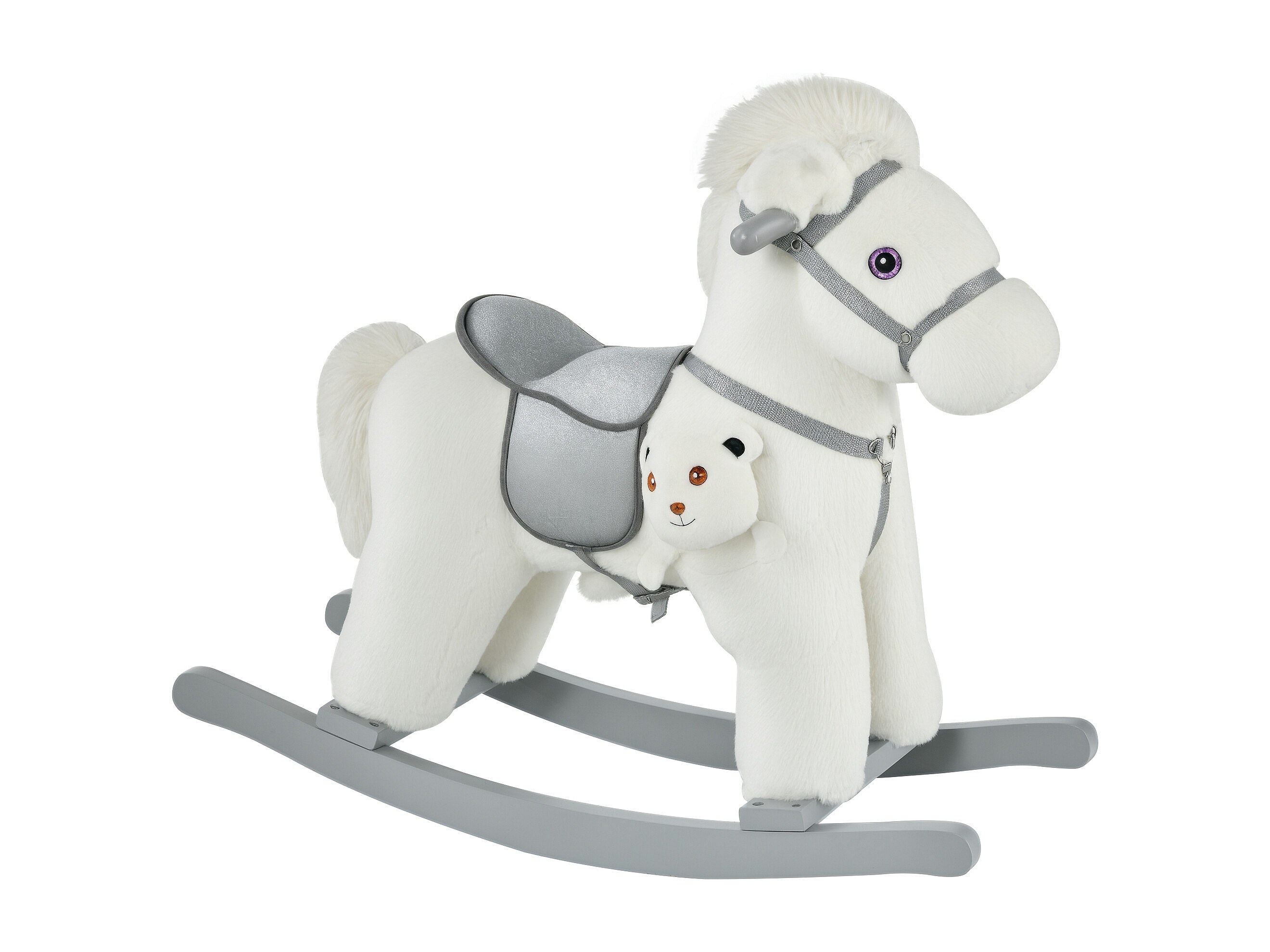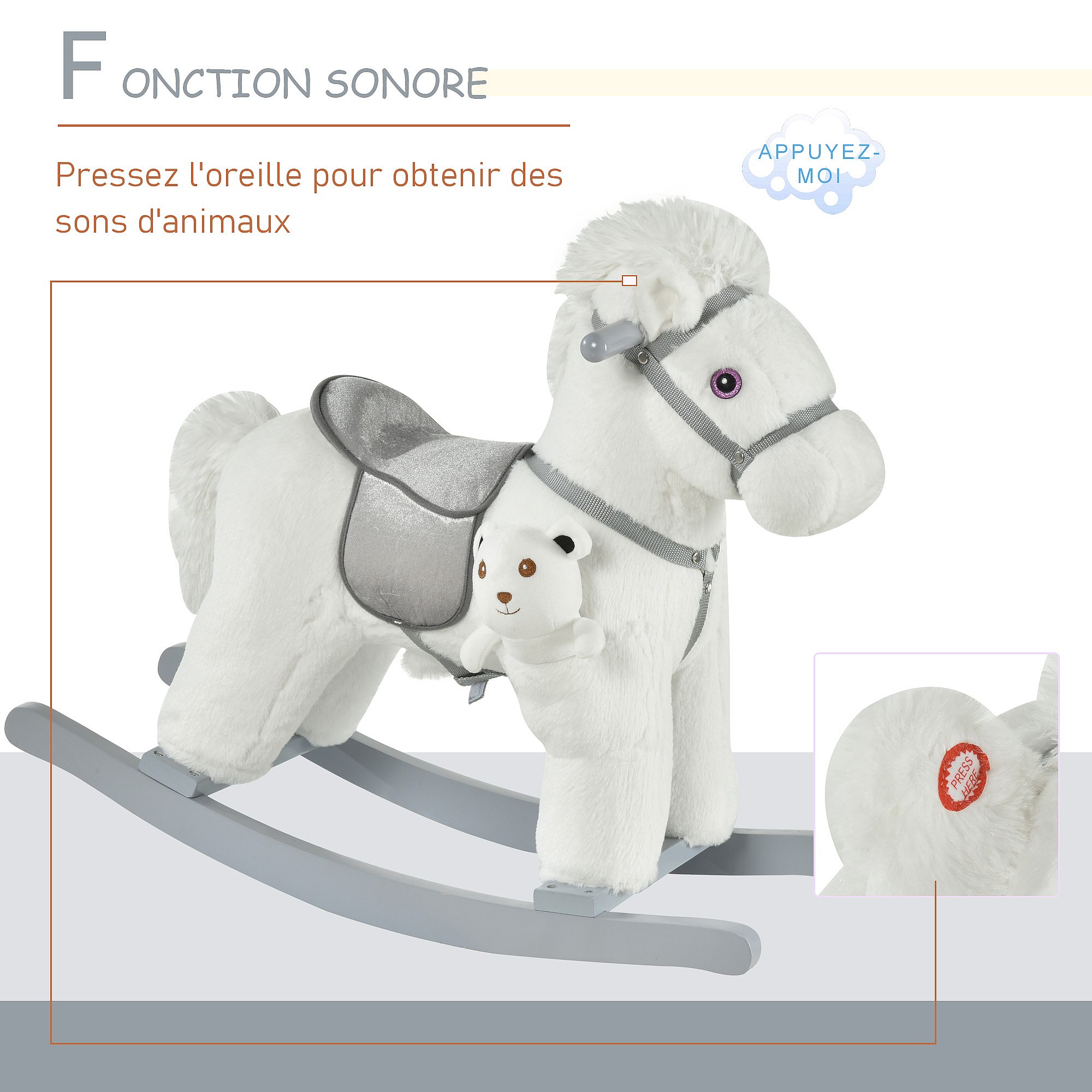 Cheval à bascule - effets sonores, peluche ourson inclus - poignées structure bois peuplier gris peluche courte douce blanc