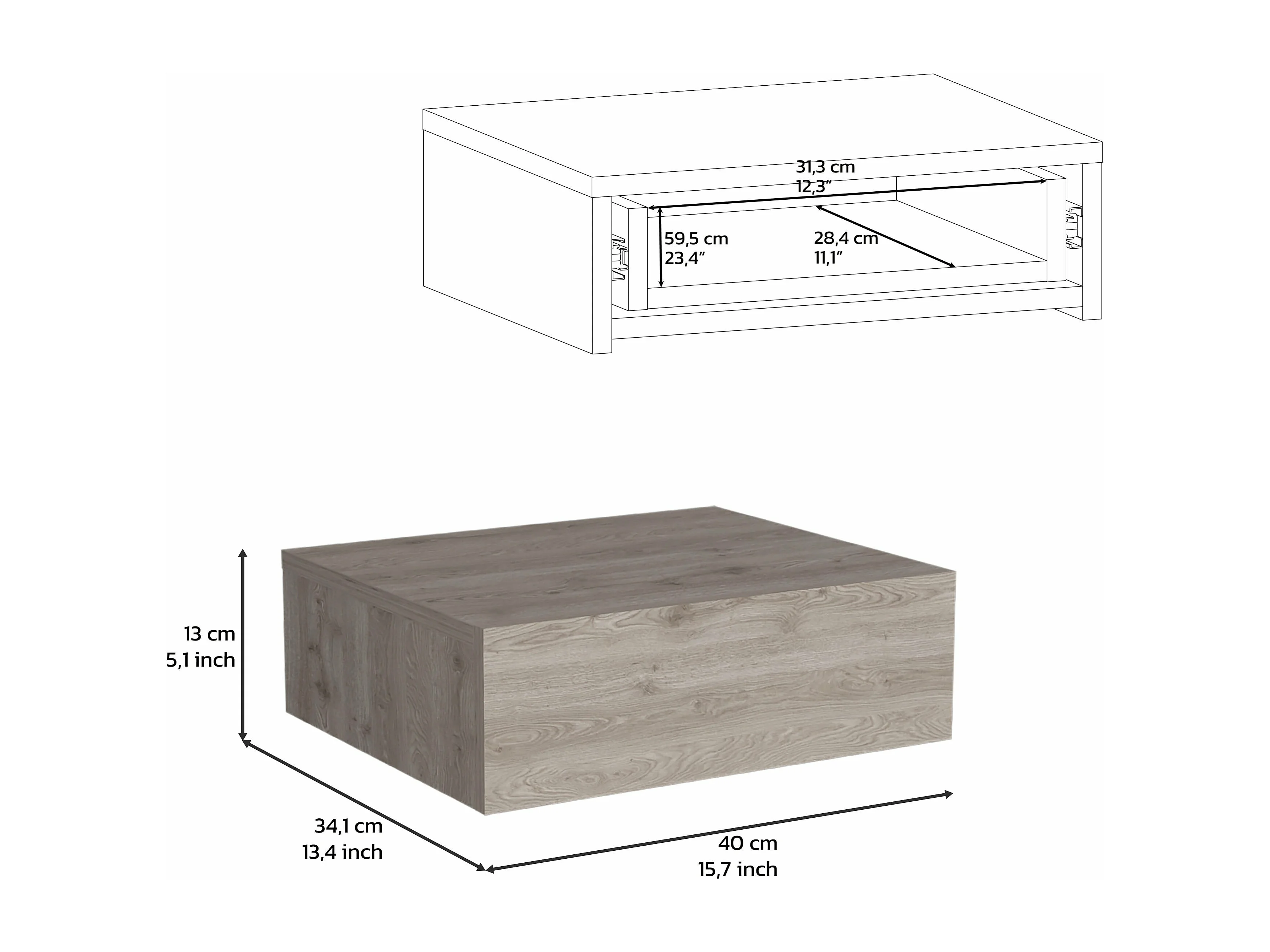 Table de chevet flottante Augusta avec deux tablettes ouvertes et un tiroir sur rail métallique , 29.5 cm X 35.6 cm X 33.6 cm , Macadamia
