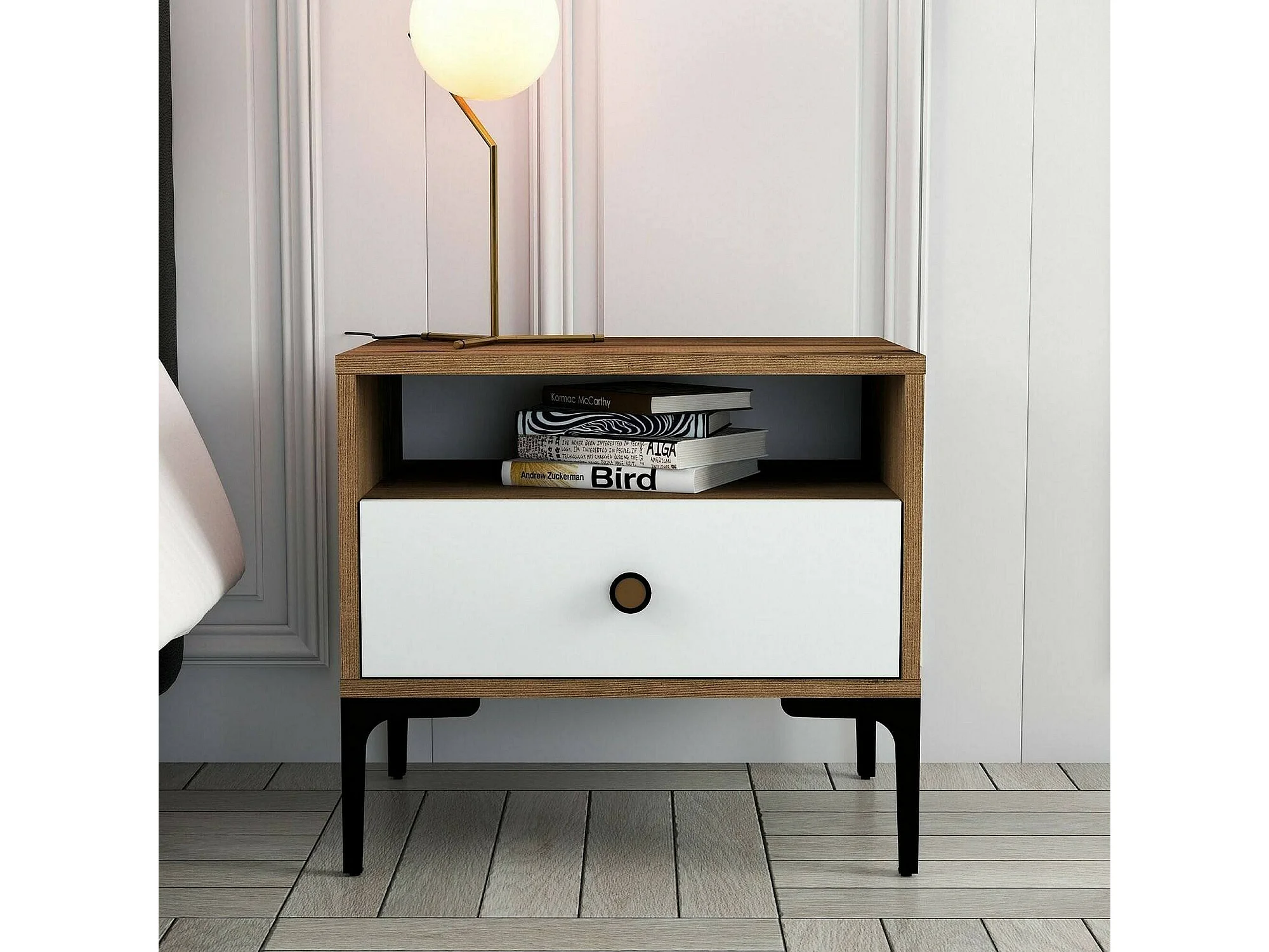 Chevet Seraph, Commode basse, Table de nuit, Étagère de chevet, 56x40h51 cm, Noyer et Blanc