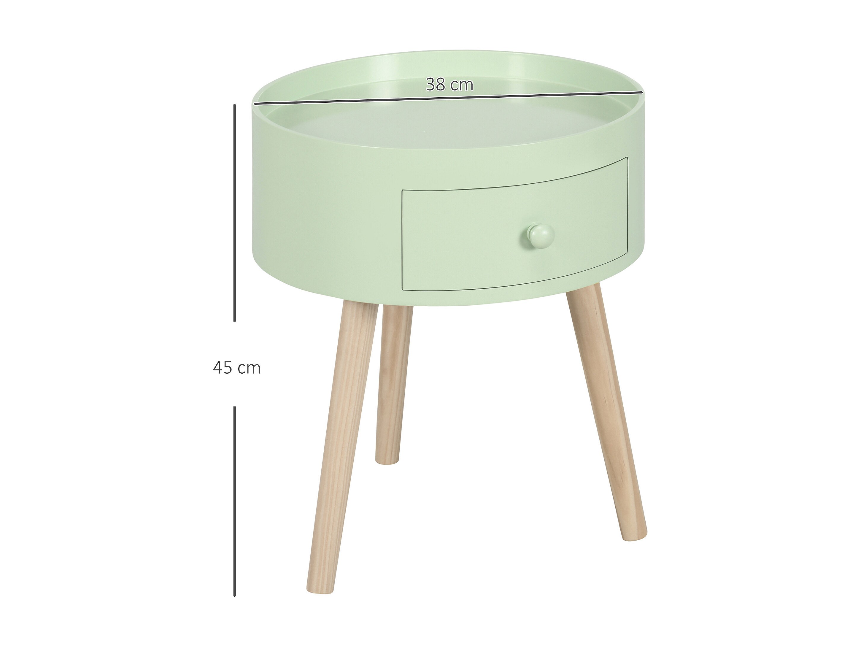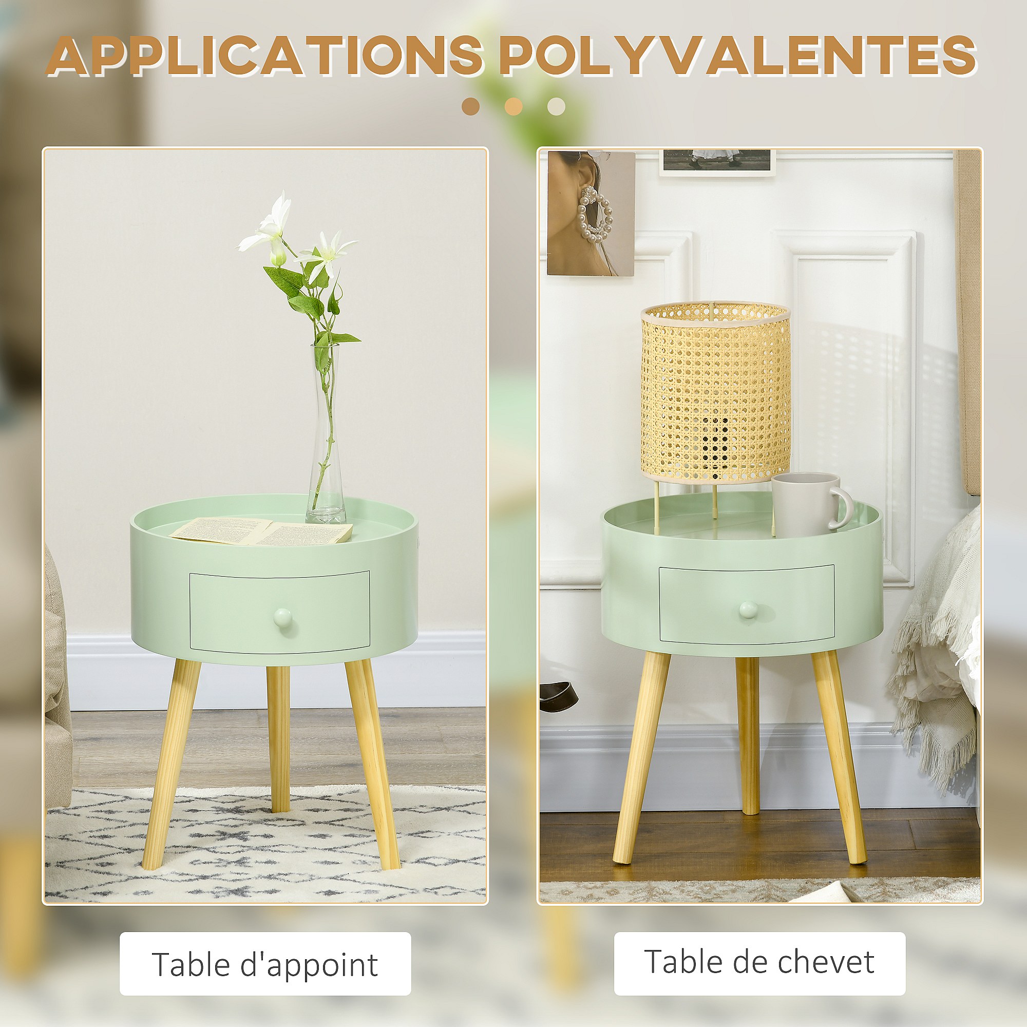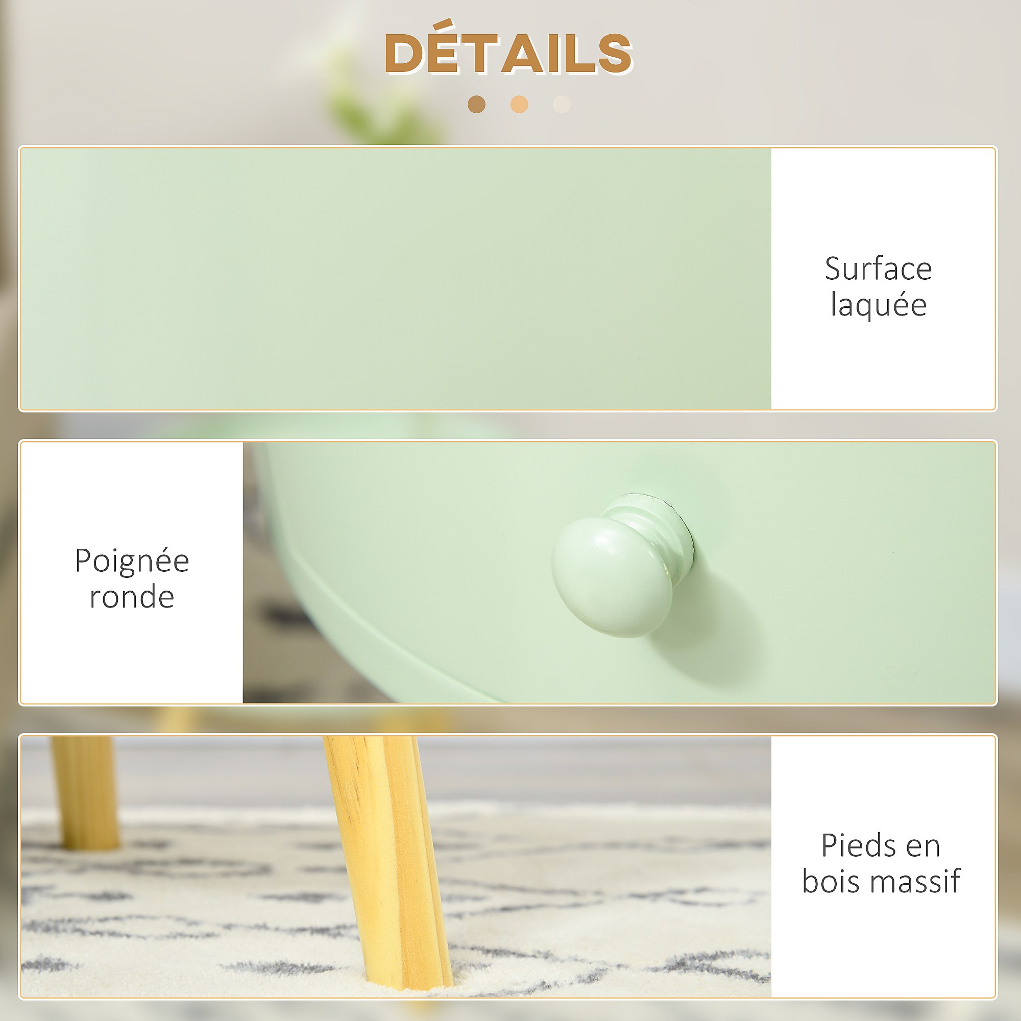 Chevet table de nuit ronde design scandinave tiroir bicolore pieds effilés inclinés bois massif chêne clair vert
