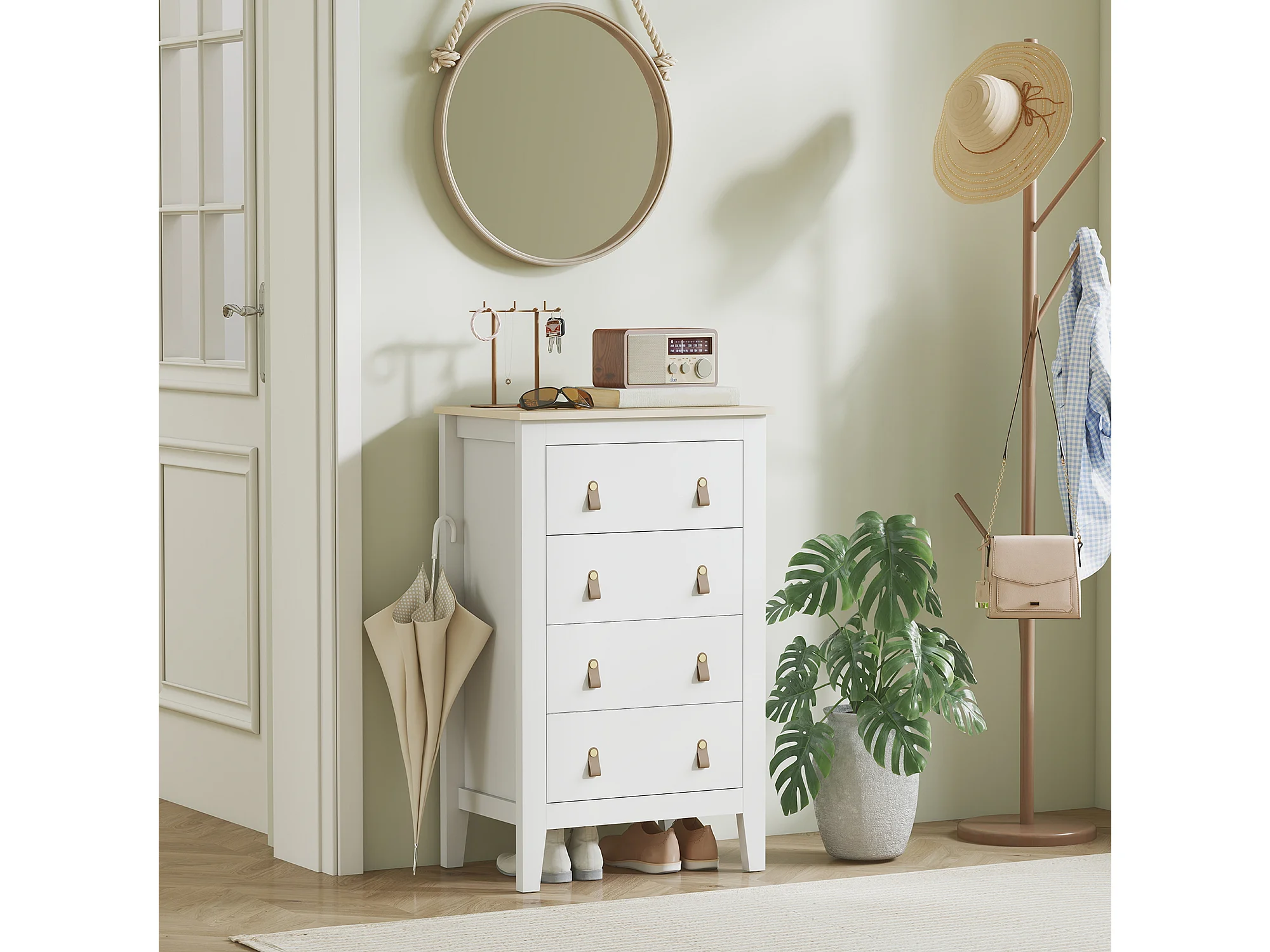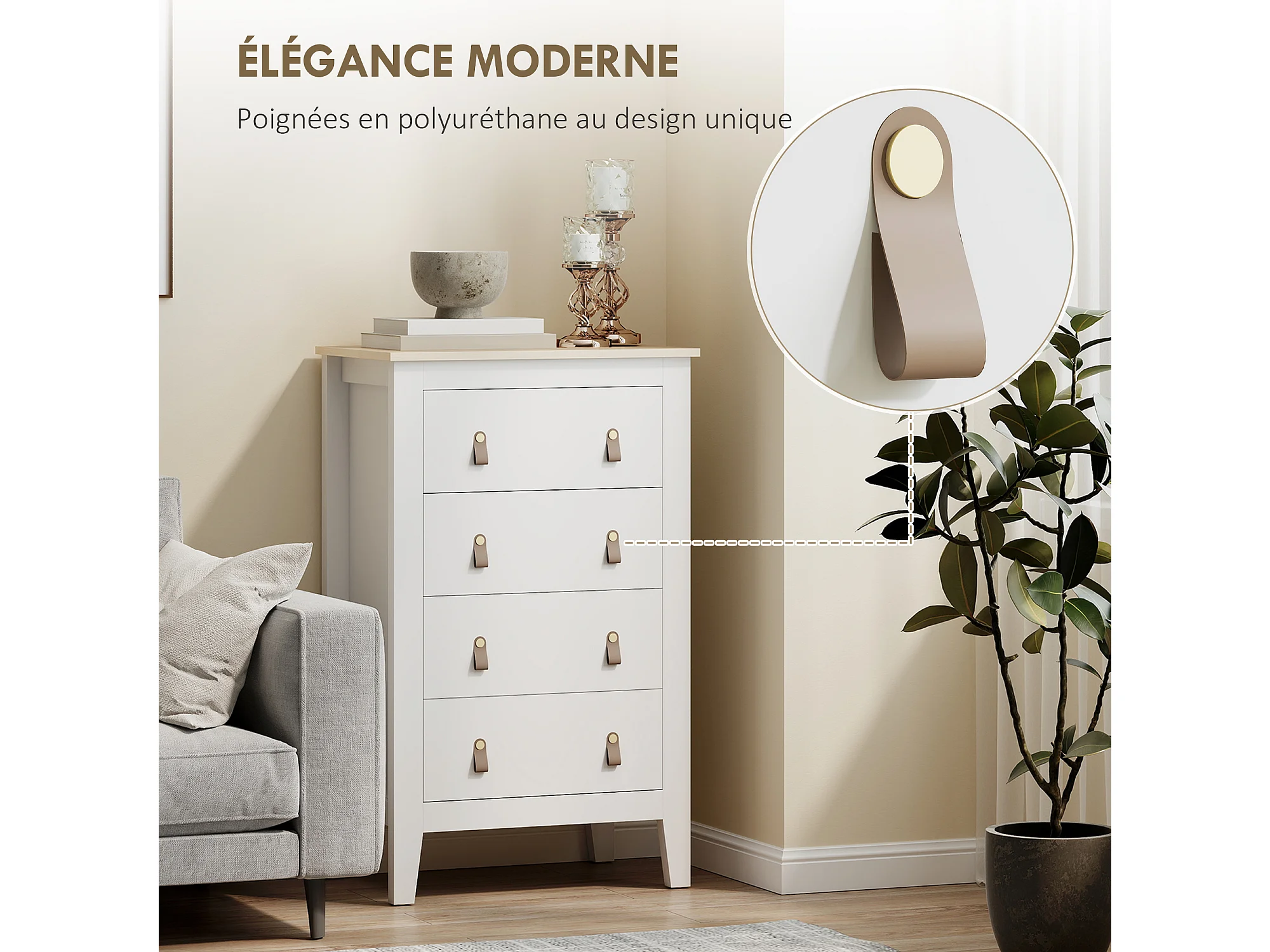 Chiffonnier 4 tiroirs sur pieds dim. 60 x 40 x 98 cm poignées PU métal doré blanc effet bois clair