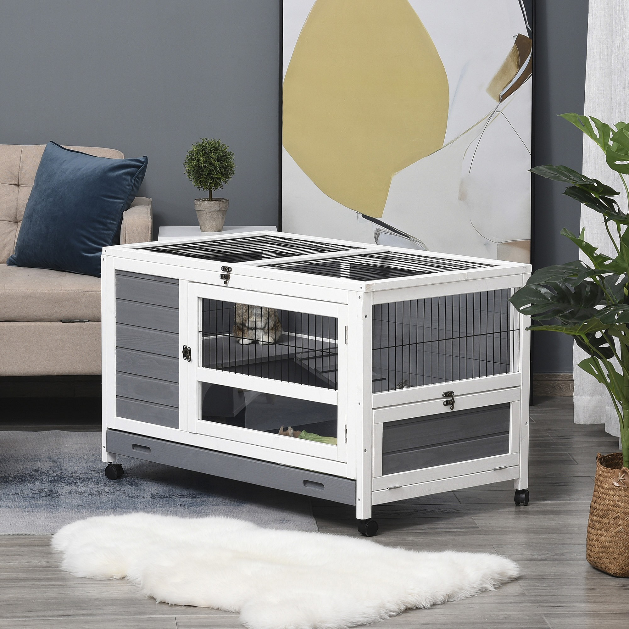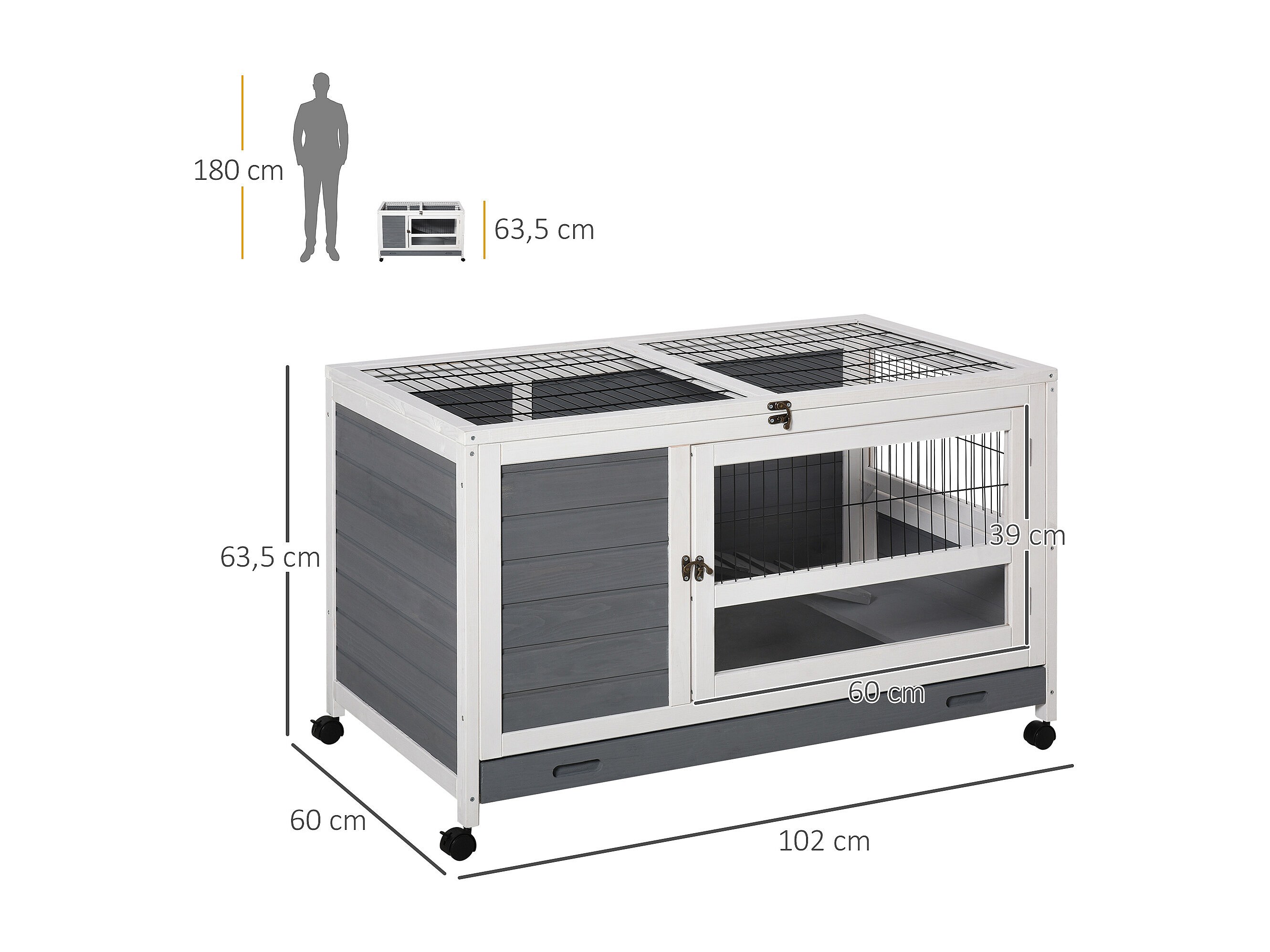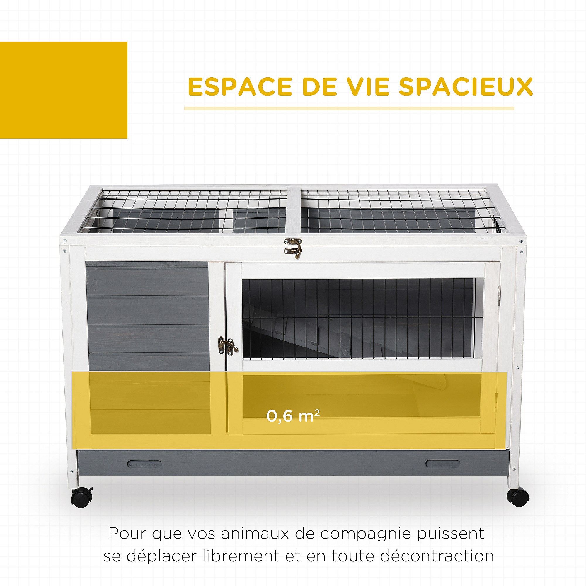 Clapier à lapin sur roulettes cage à lapin 2 étages porte verrouillable toit ouvrant plateau coulissant rampe bois de sapin gris blanc