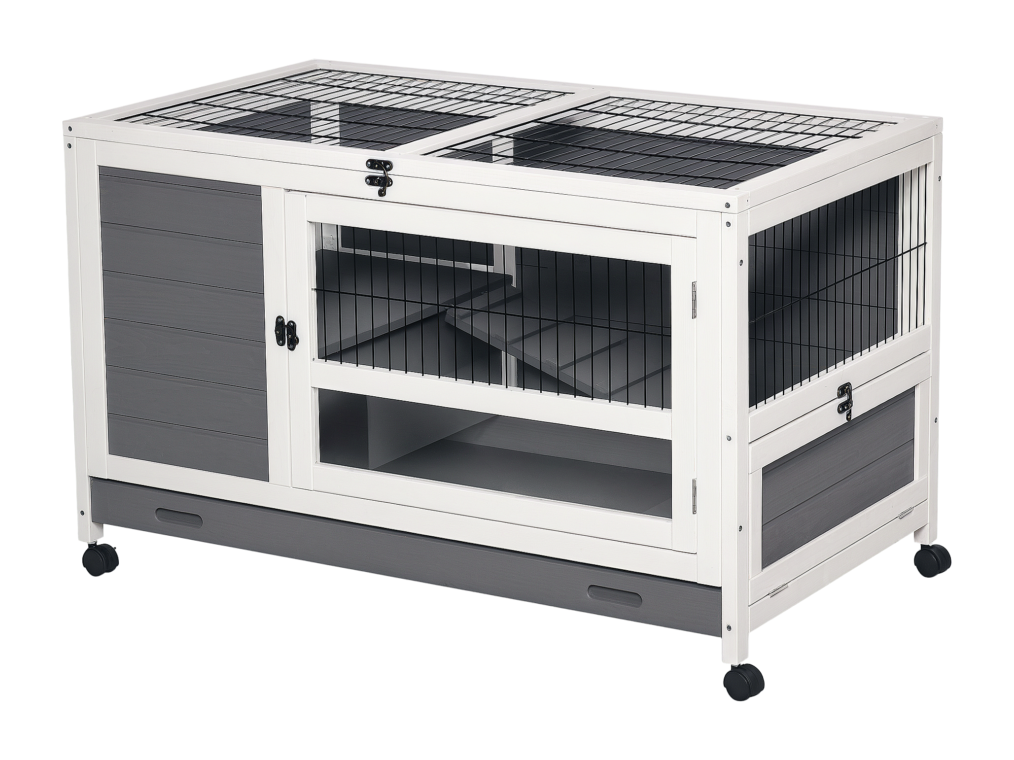Clapier à lapin sur roulettes cage à lapin 2 niveaux toit ouvrant verrouillable plateau déjection coulissant rampe niche bois de sapin gris blanc