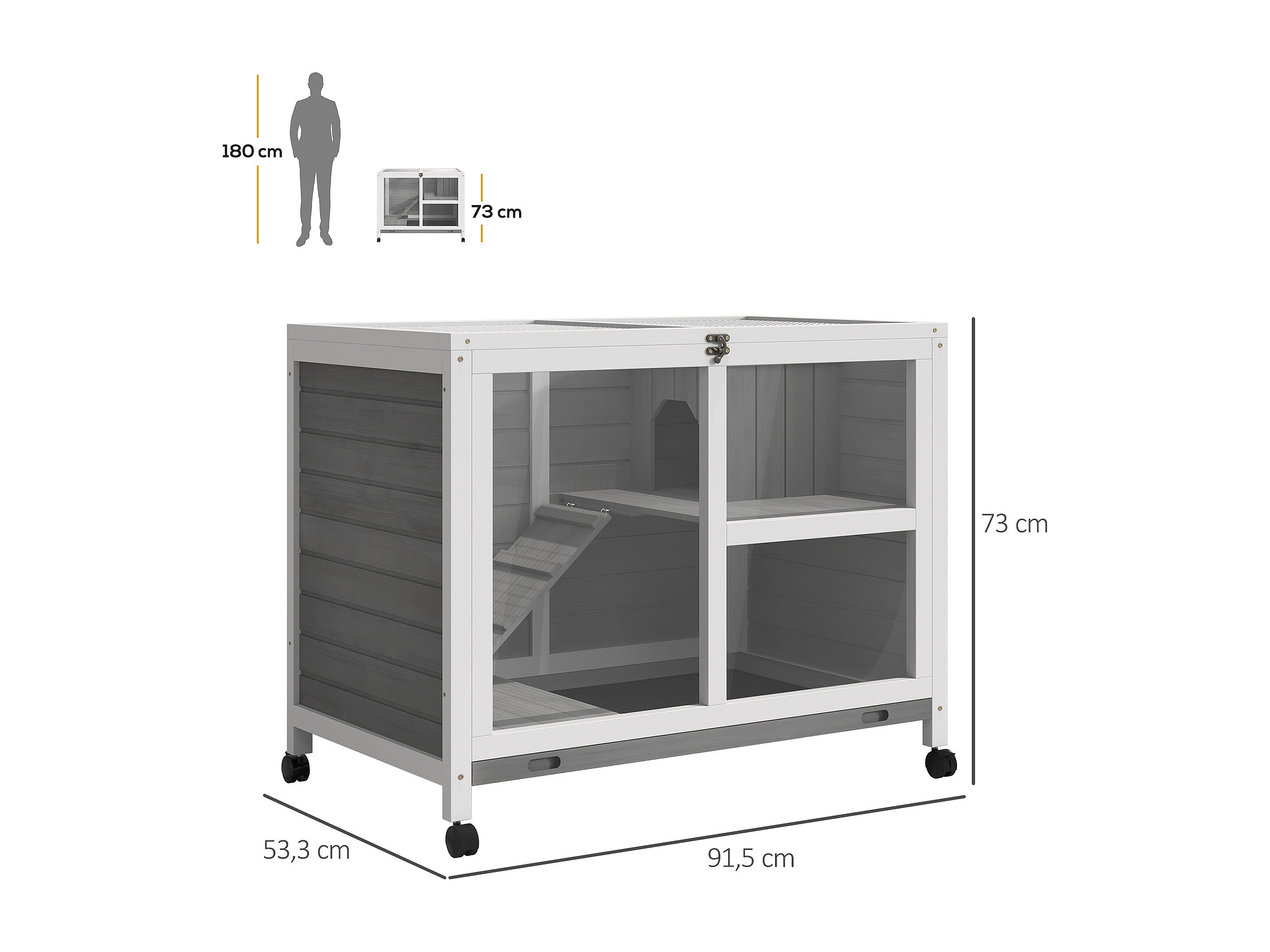 Clapier à lapin sur roulettes cage à lapin 2 étages porte verrouillable toit ouvrant plateau coulissant rampe bois de sapin gris blanc