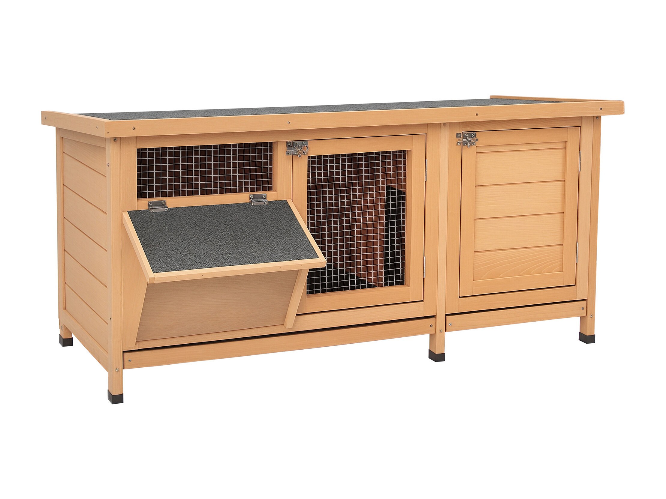 Clapier sur pieds - cage à lapin - 2 plateaux coulissants à excrément, 2 portes verrouillables, toit bitumé ouvrant, râtelier à foin - bois sapin pré-huilé