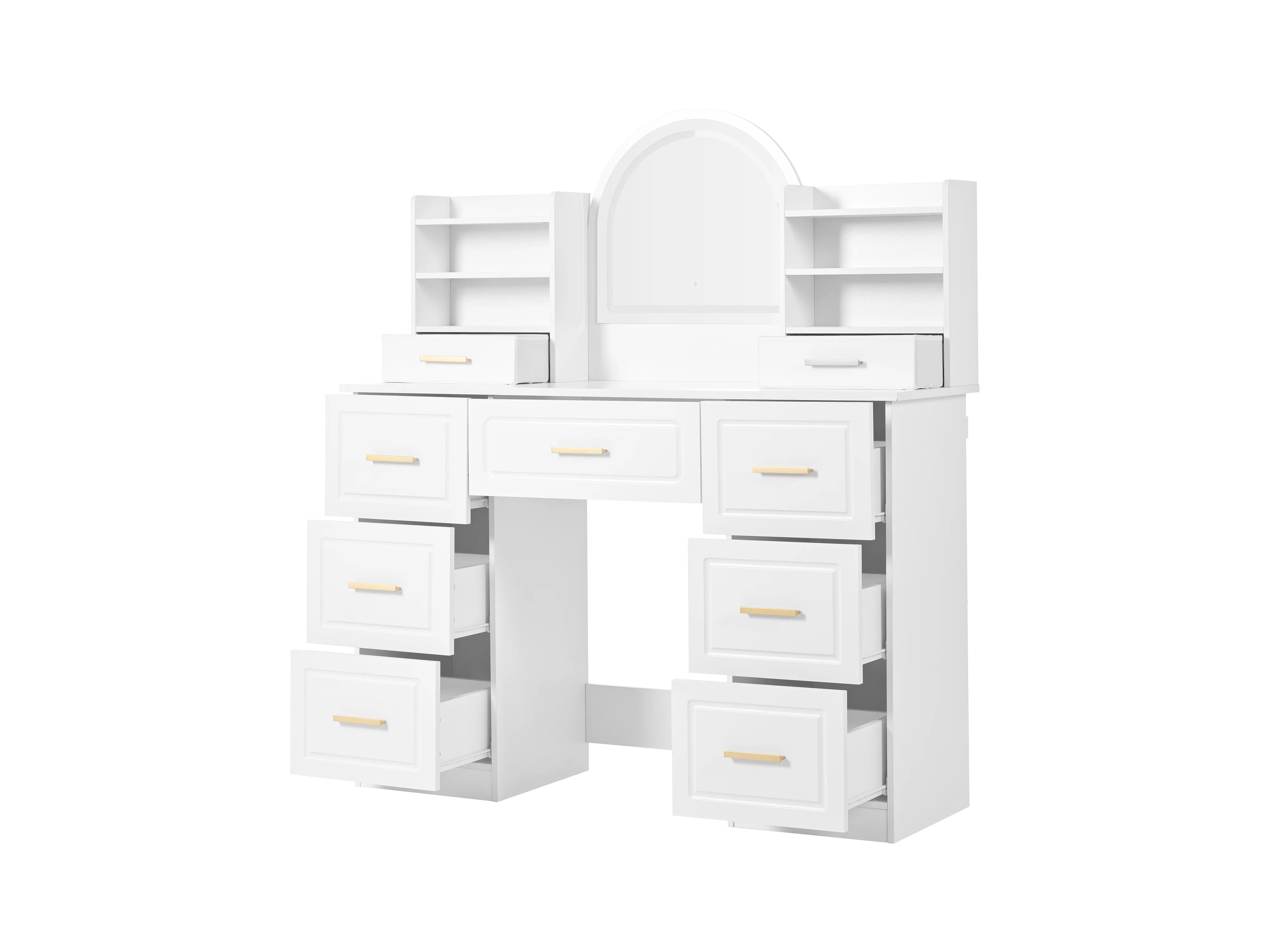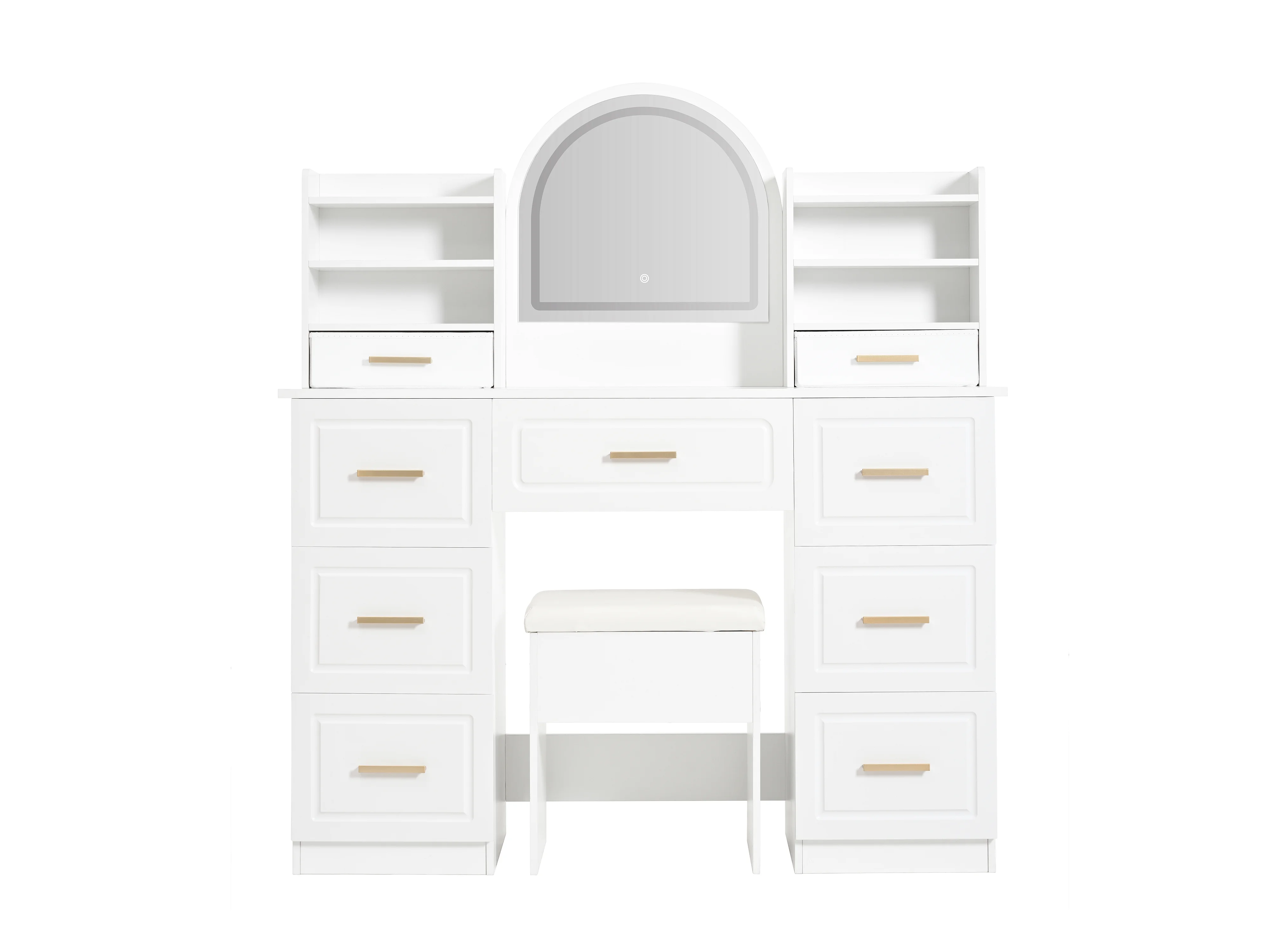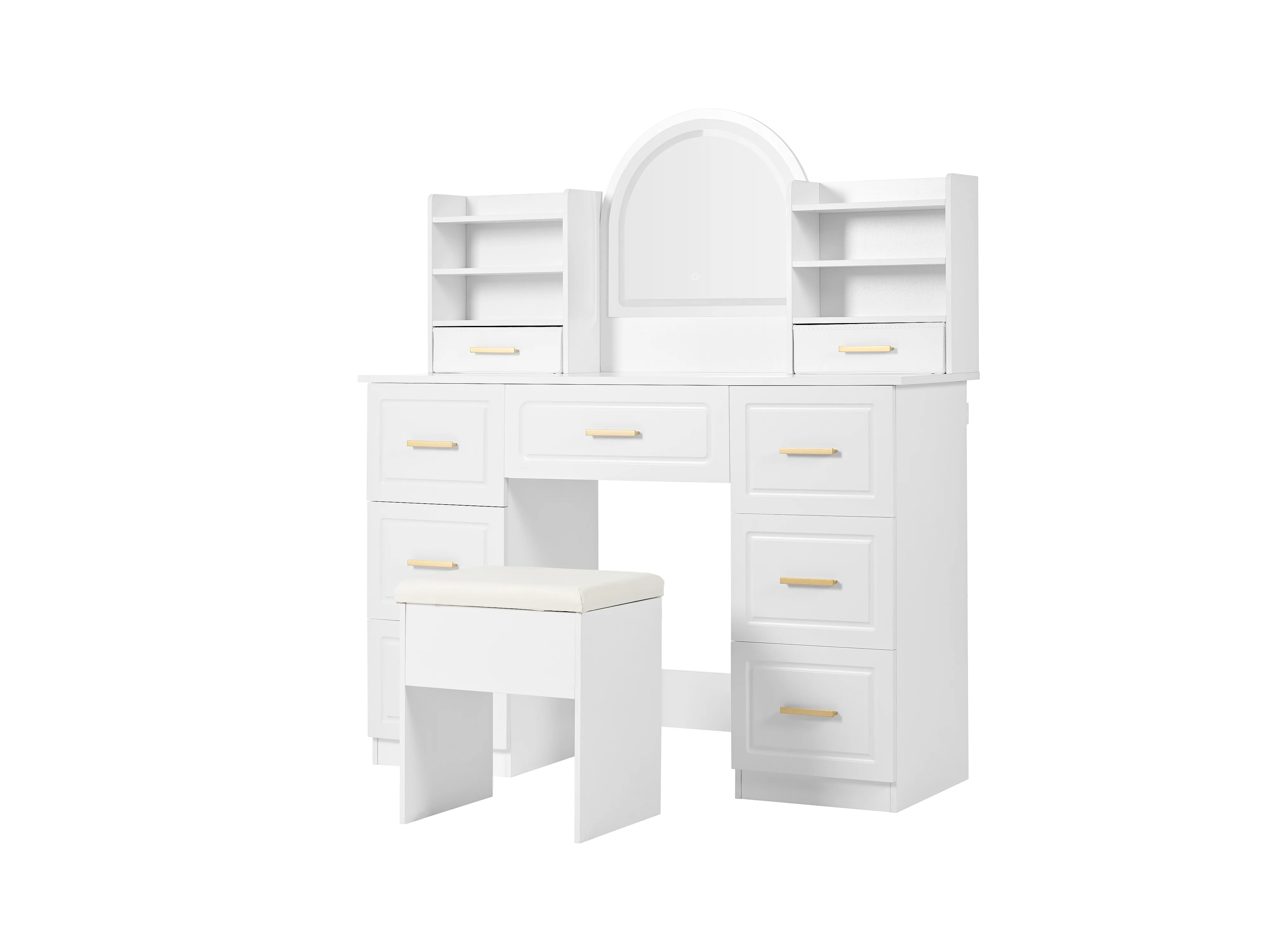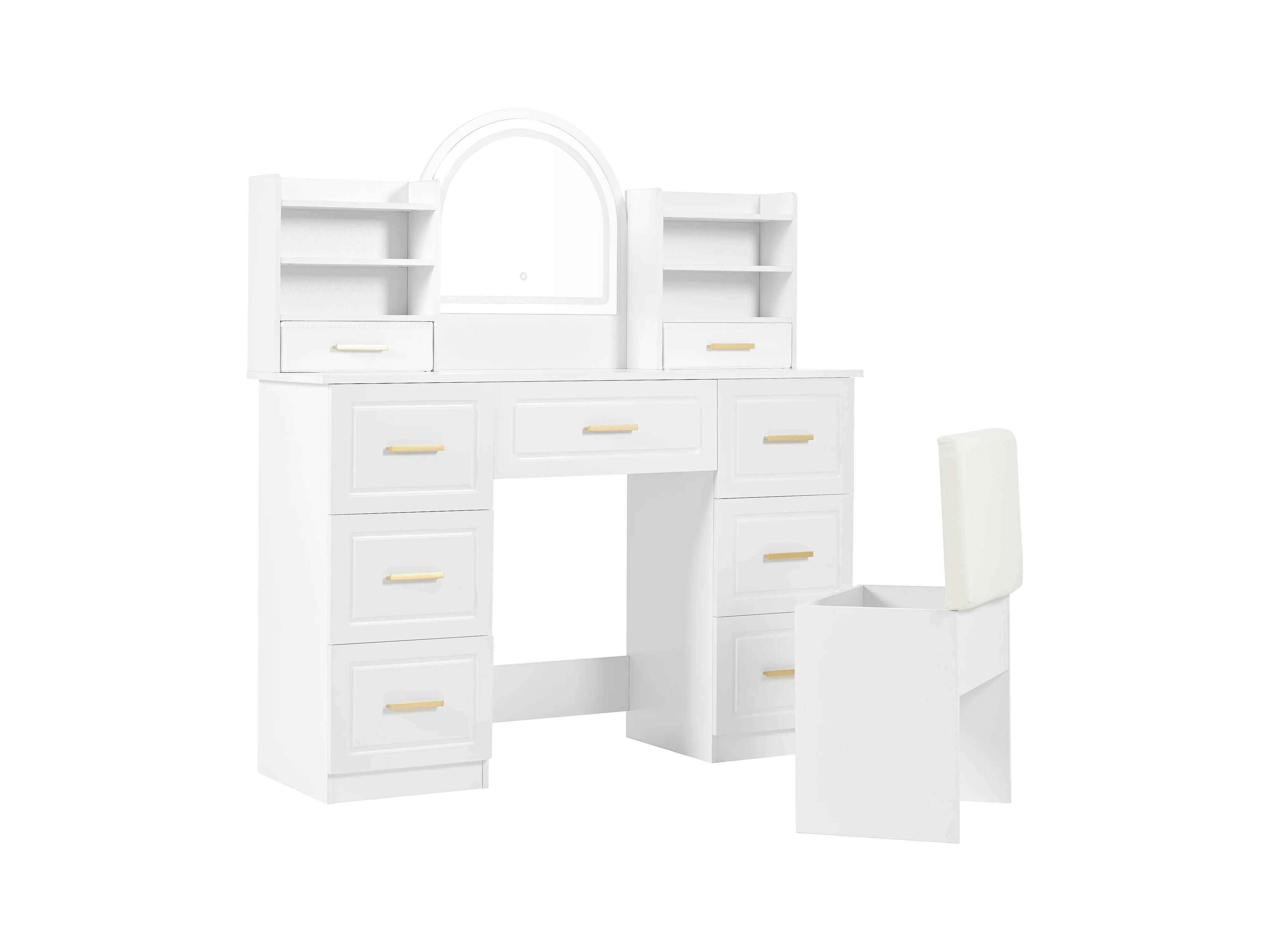 Coiffeuse avec 9 tiroirs, miroir et tabouret - 120 x 40 x 135 cm - LEDs - Panneau de particules - Blanc