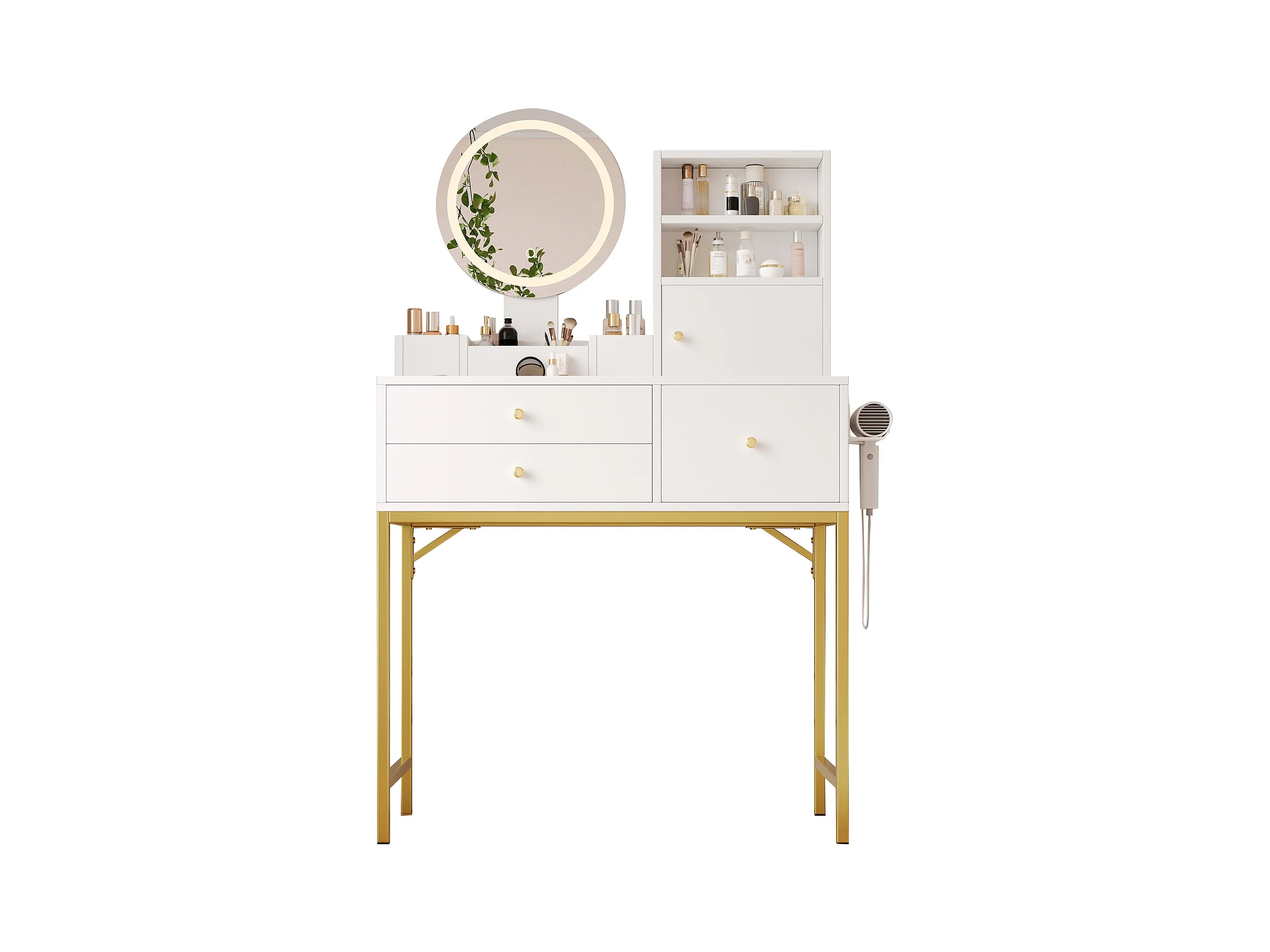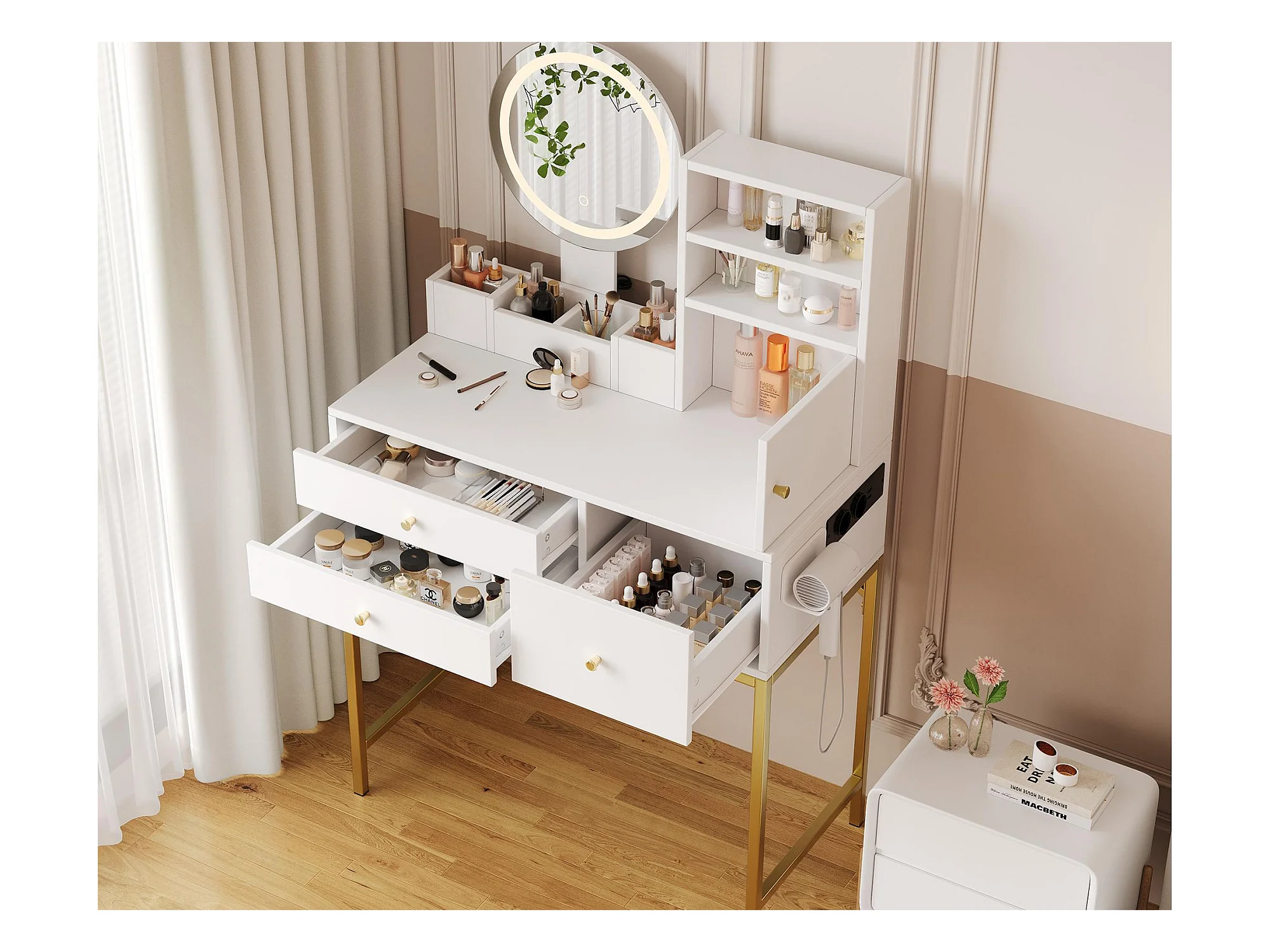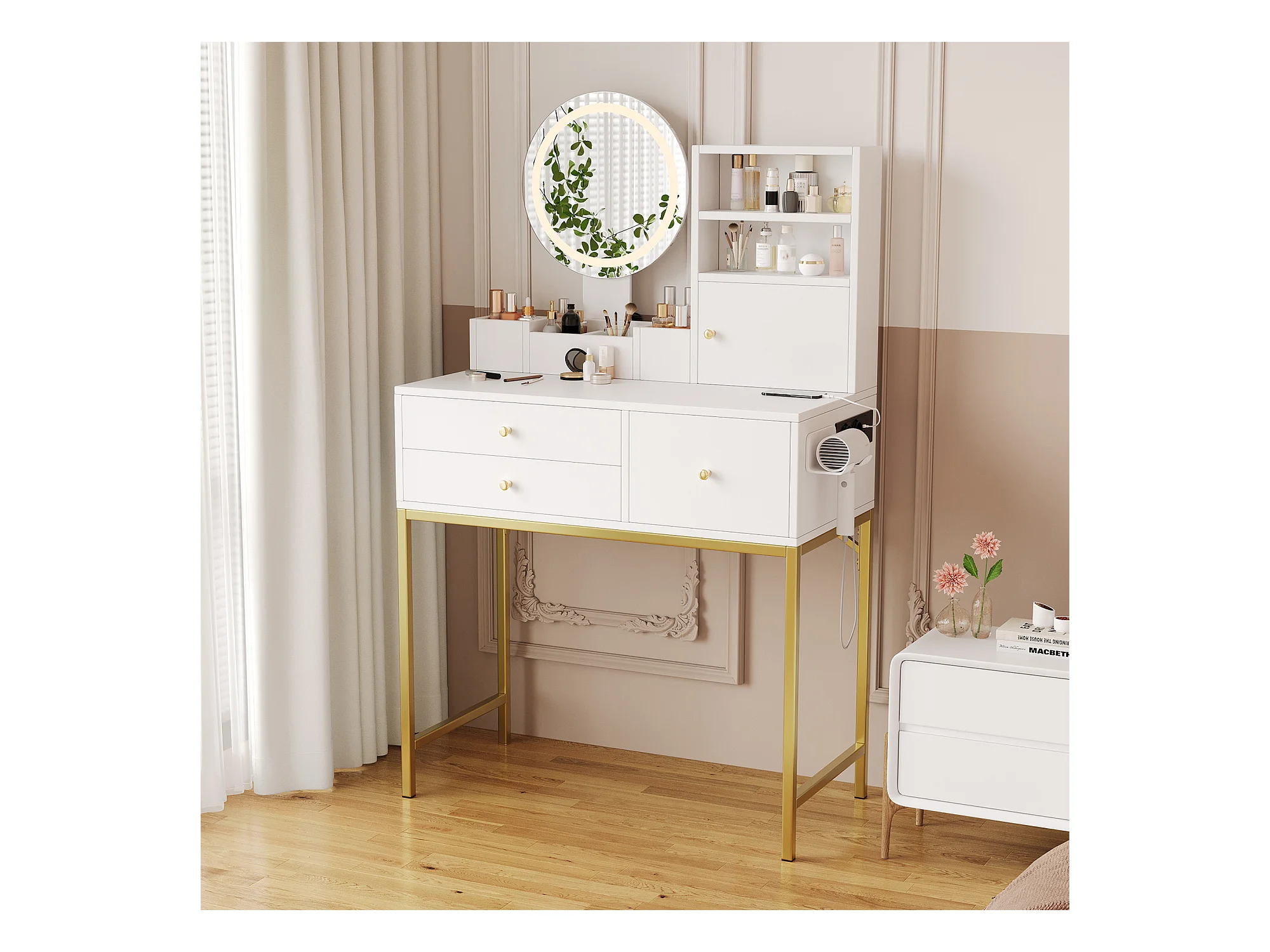 Coiffeuse avec miroir à LED - 2 tiroirs et une armoire amovible - Blanc (tabouret non inclus)