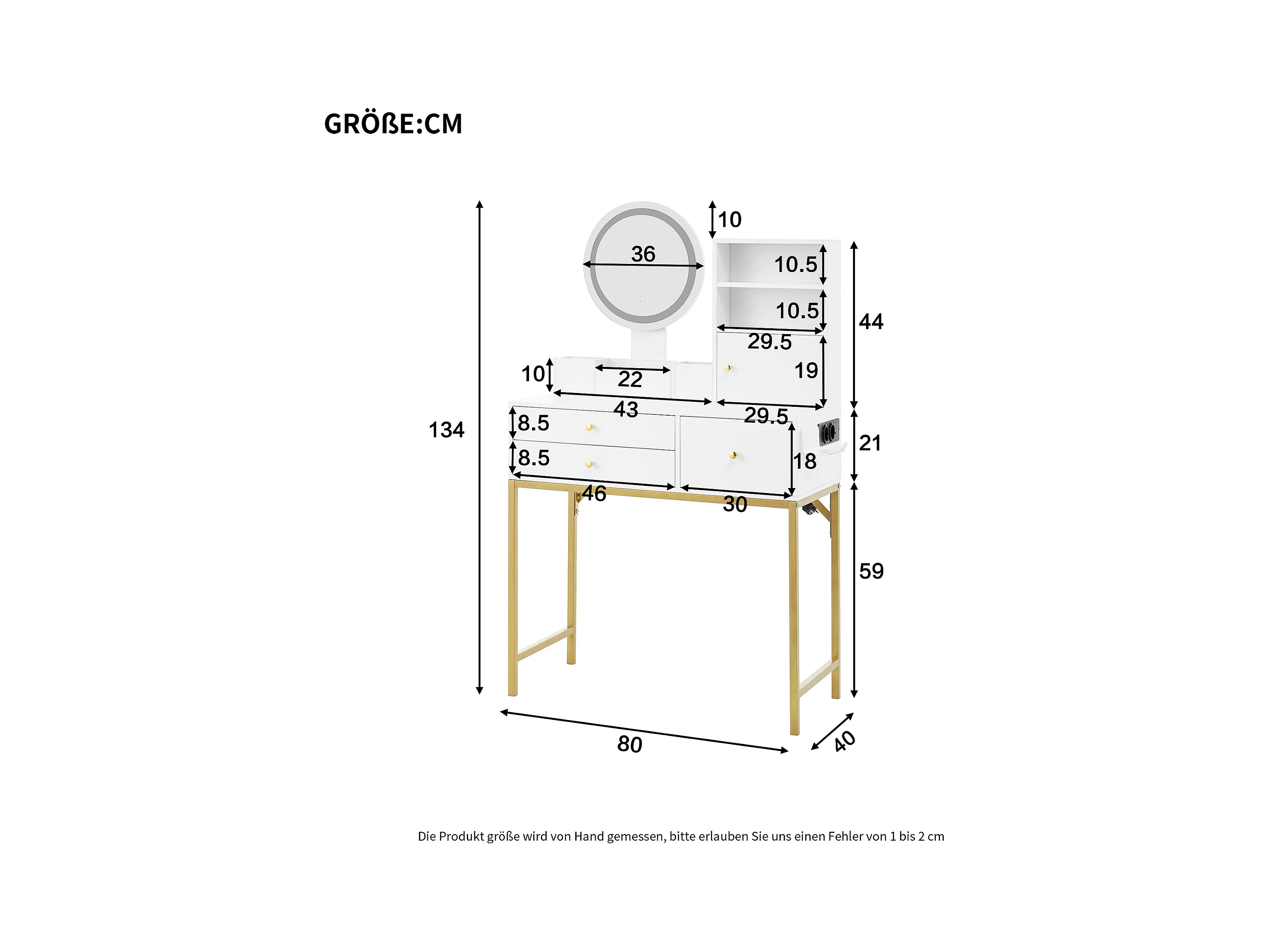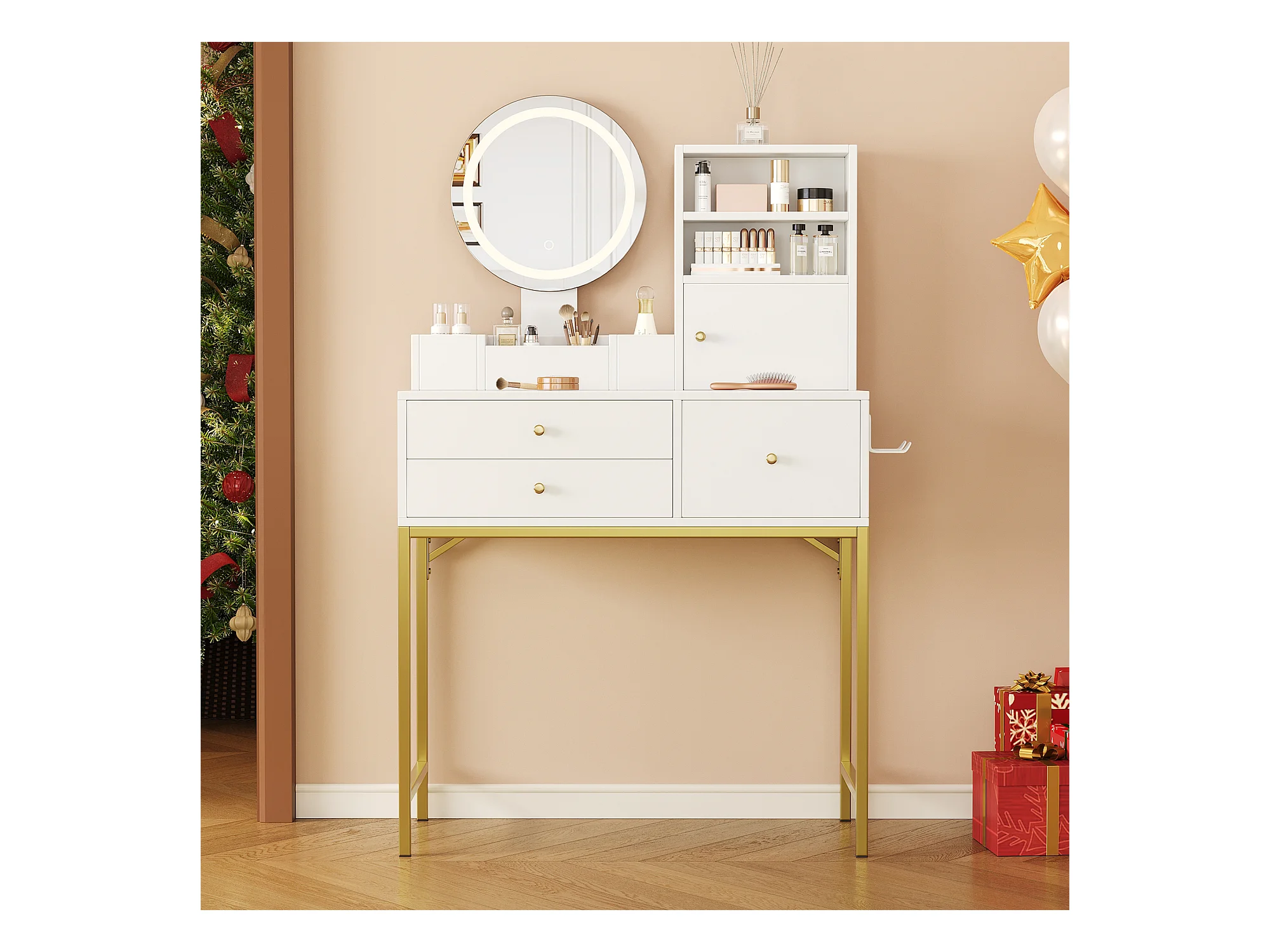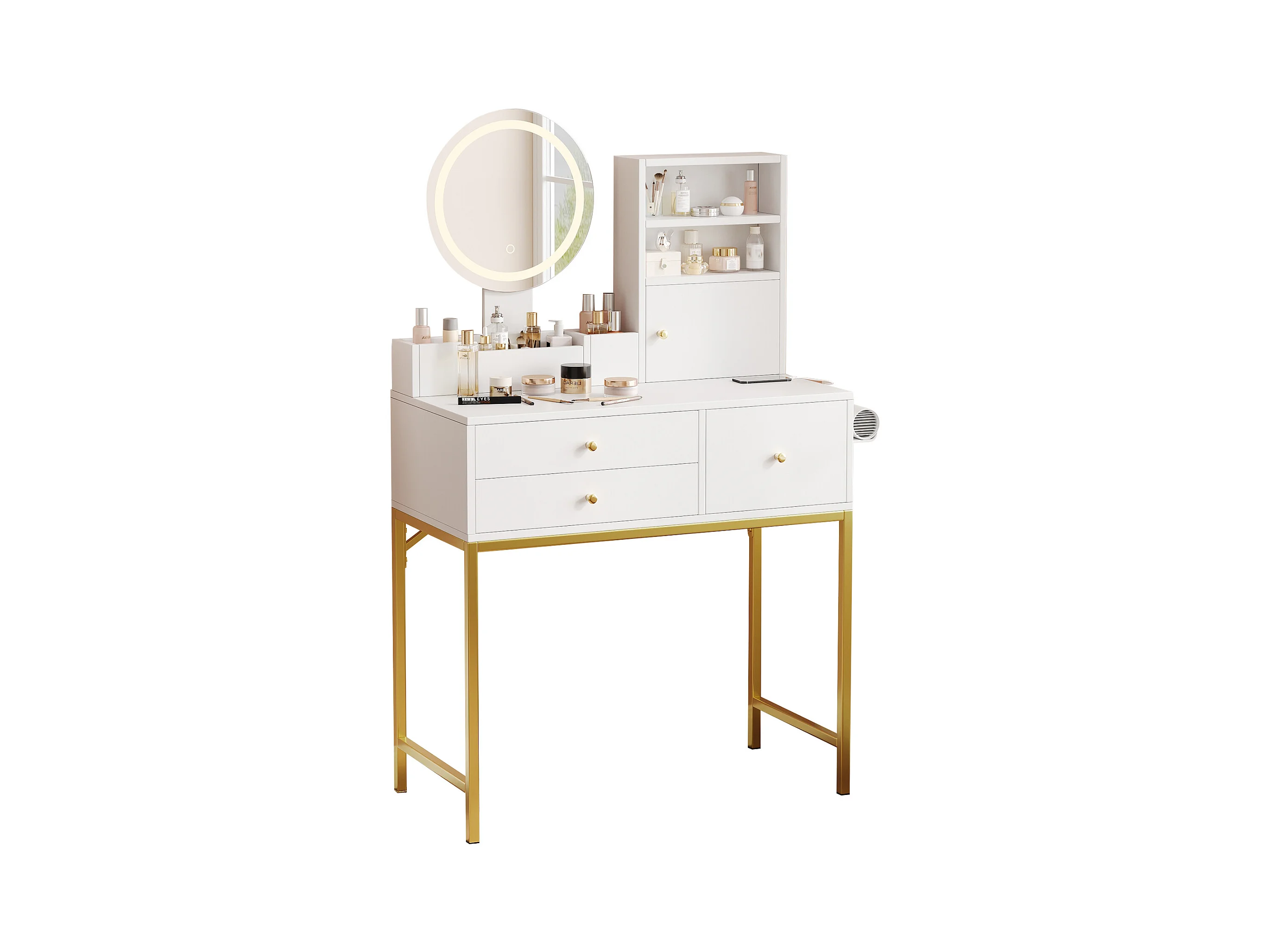 Coiffeuse avec miroir à LED - 2 tiroirs et une armoire amovible - Blanc (tabouret non inclus)