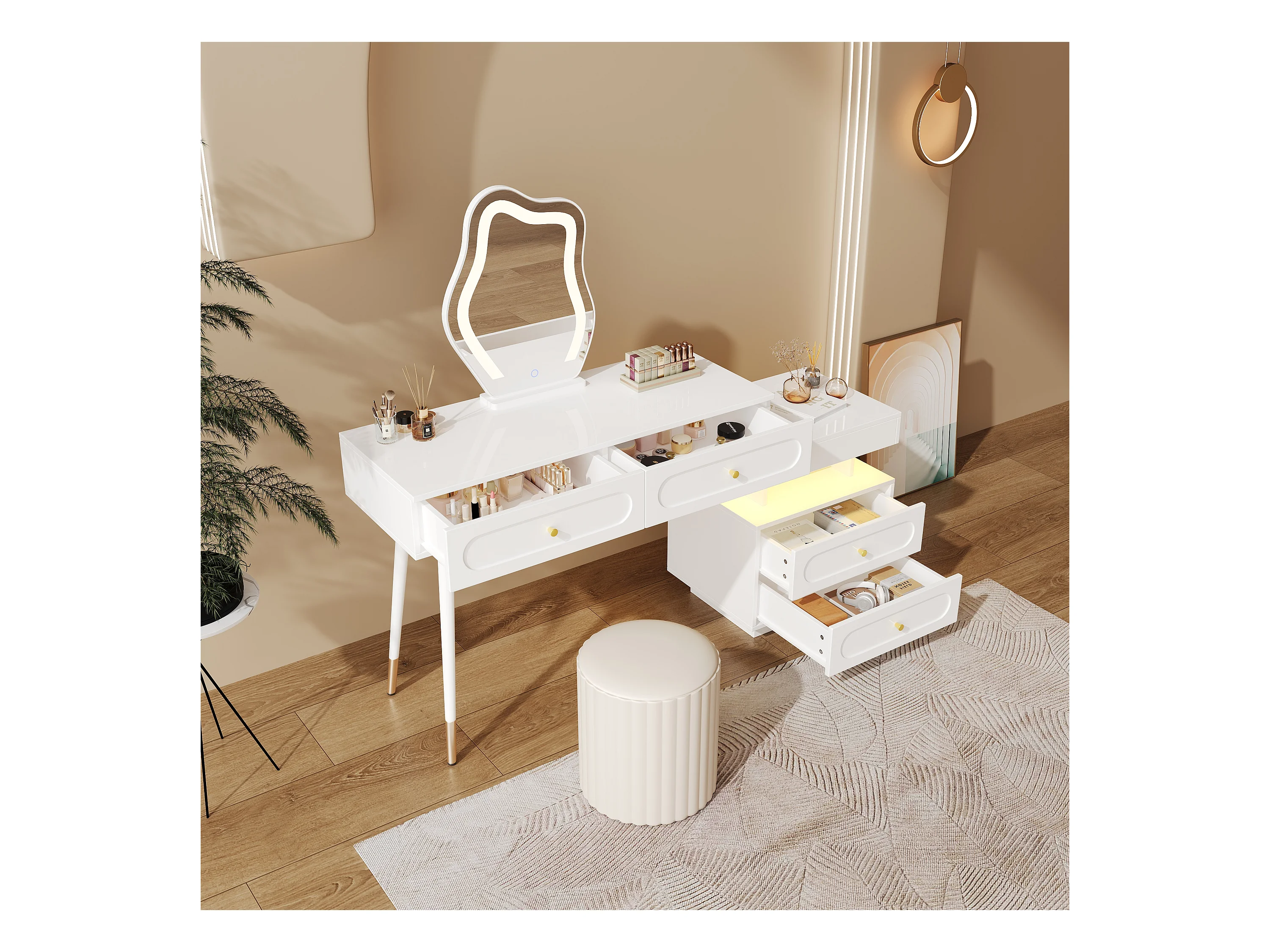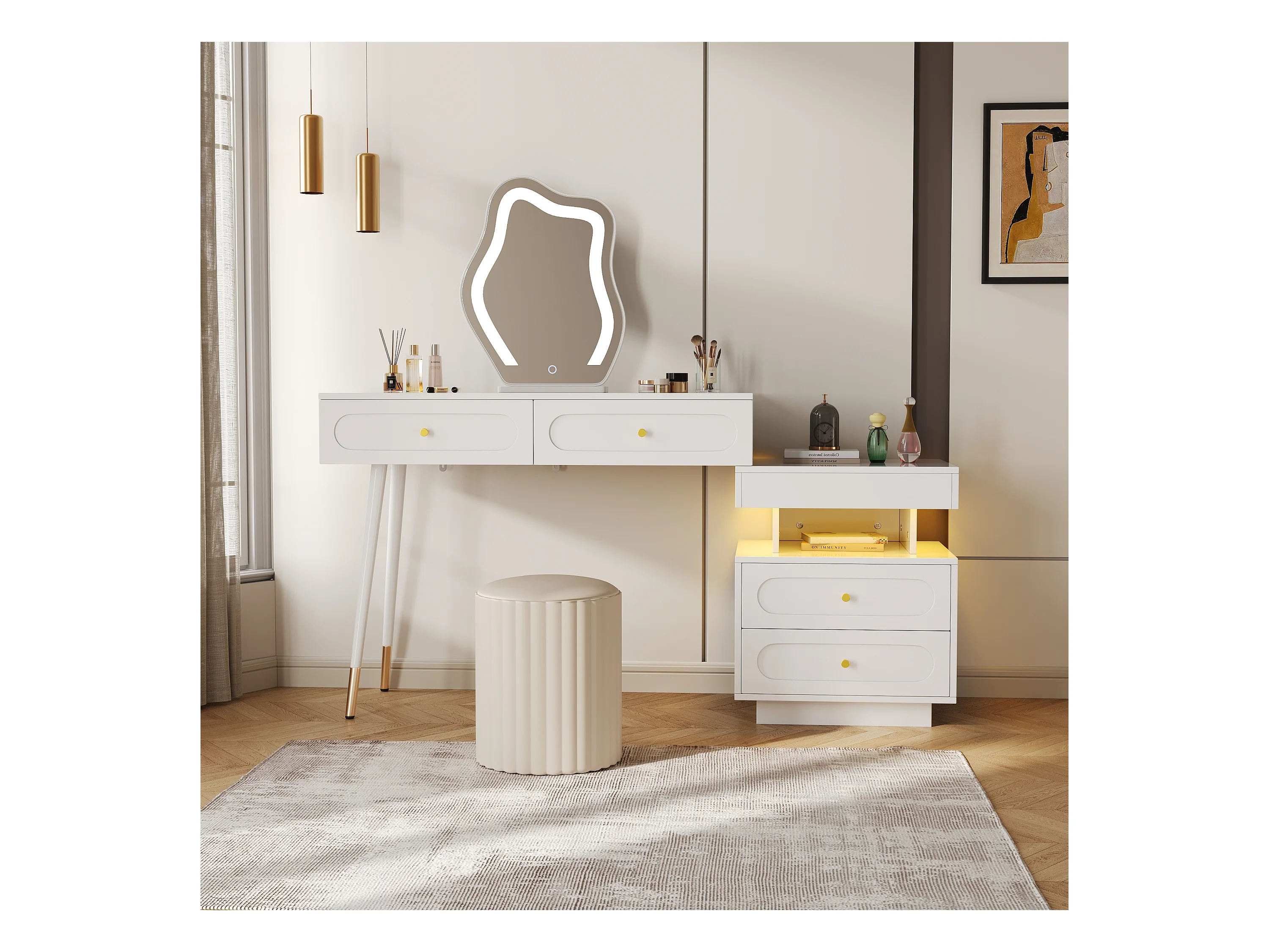 Coiffeuse avec miroir 140x40x130cm - avec éclairage LED - avec 4 tiroirs et 1 compartiment de rangement ouvert - Blanc(Sans tabouret)