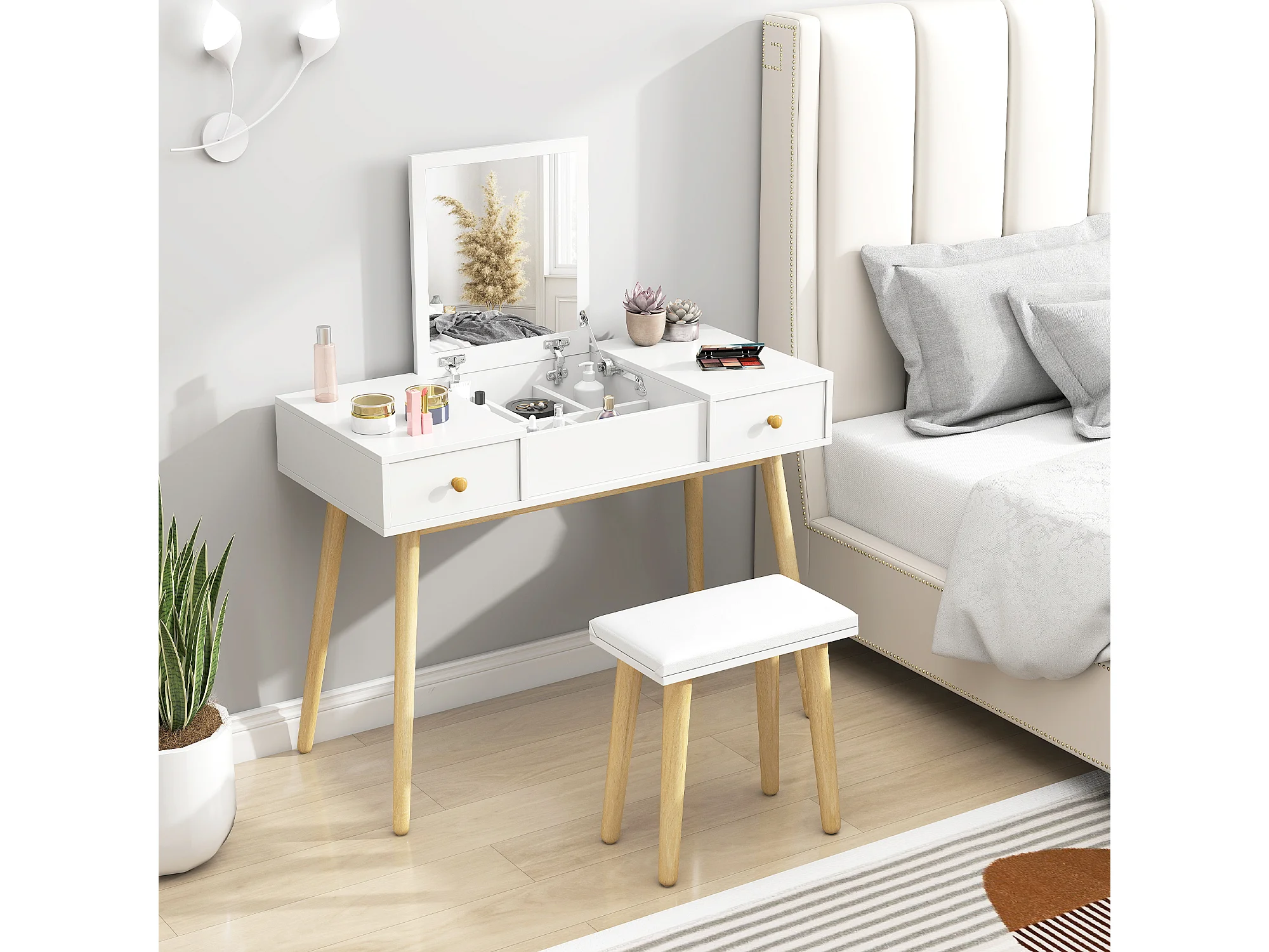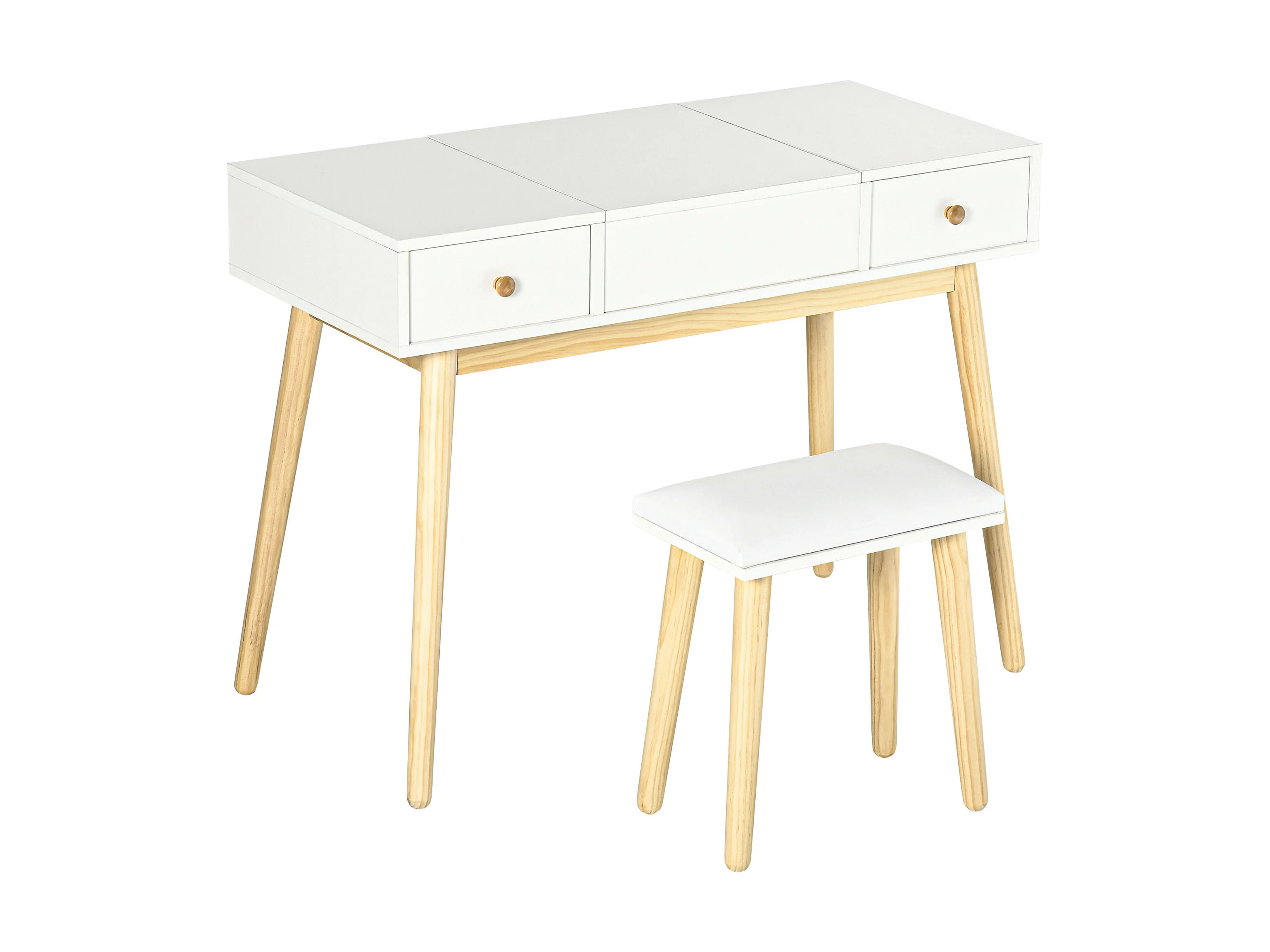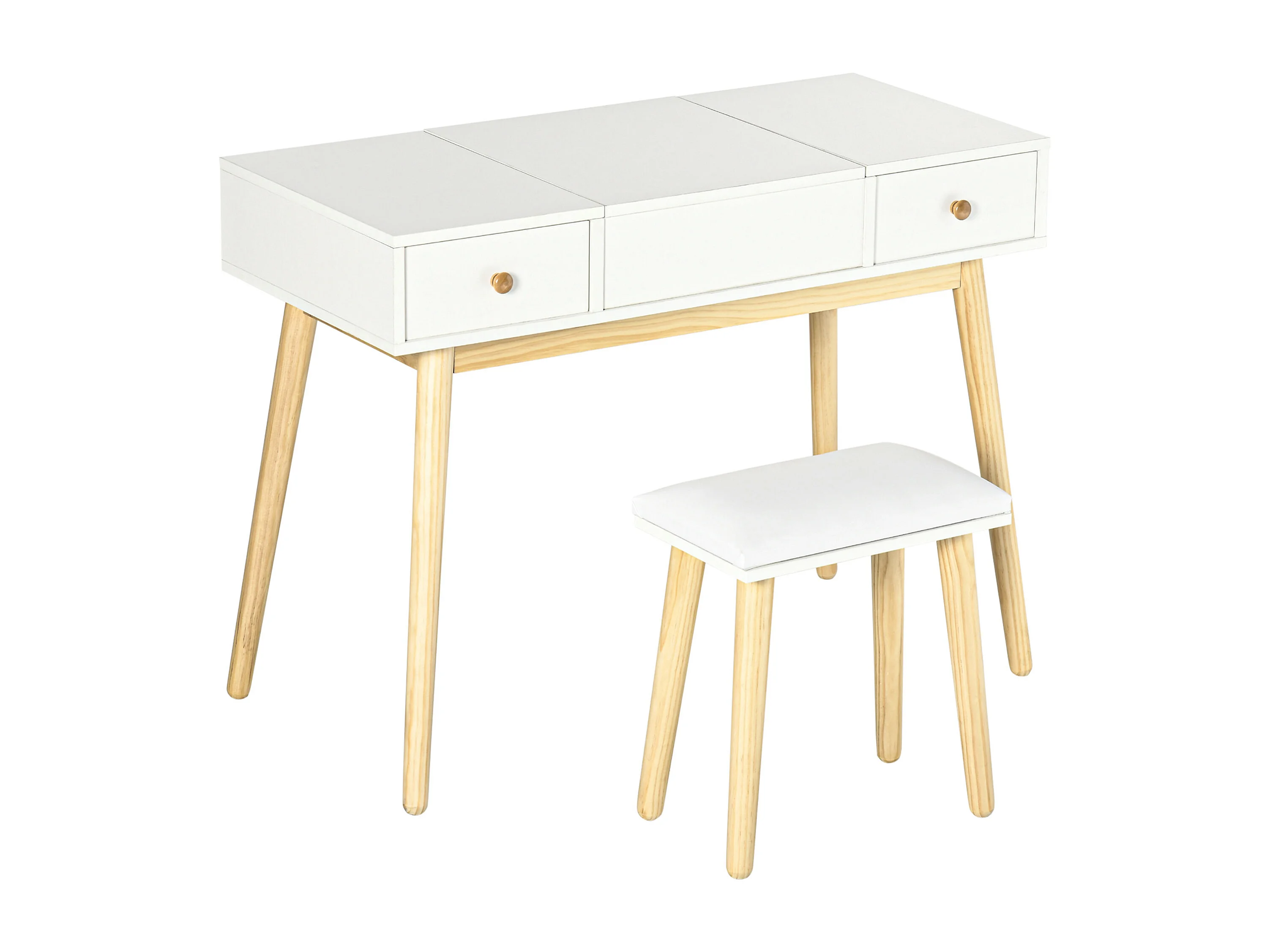 Coiffeuse avec tabouret style scandinave - 2 tiroirs, compartiment porte miroir - panneaux blanc