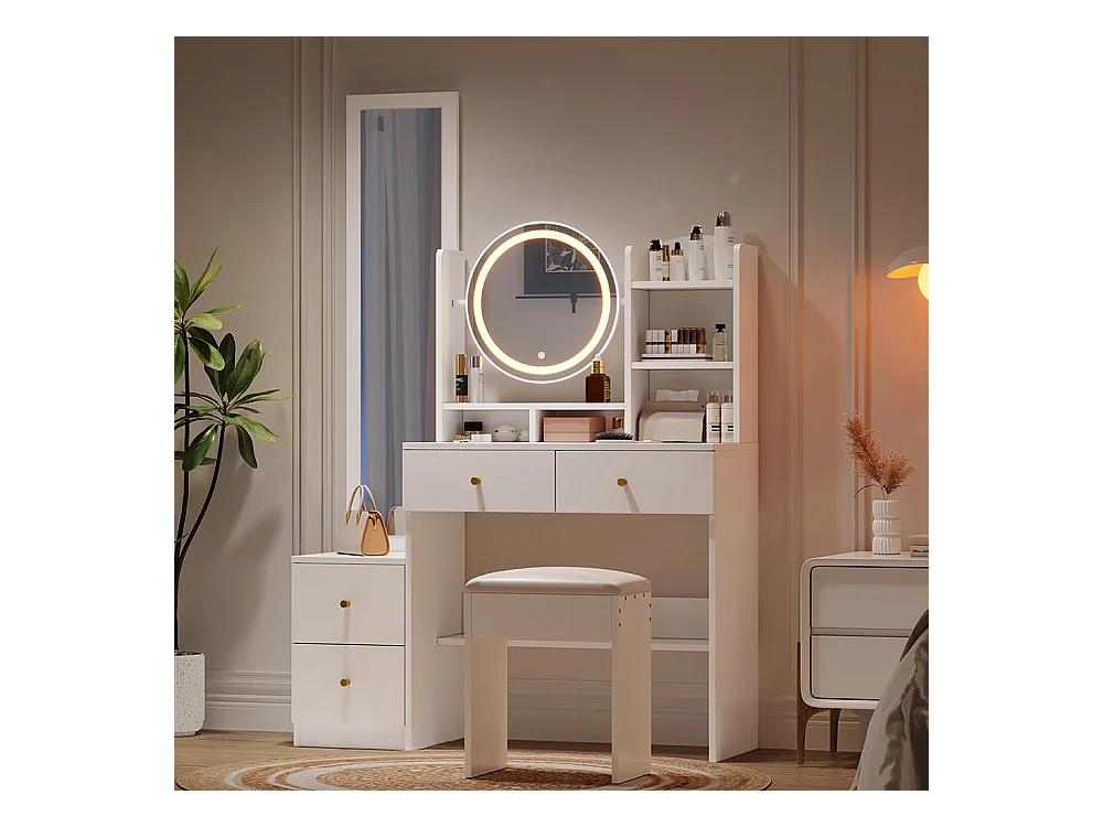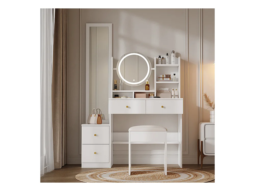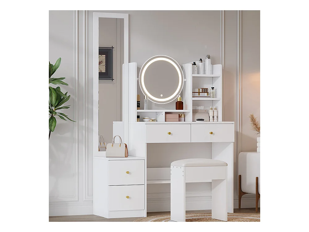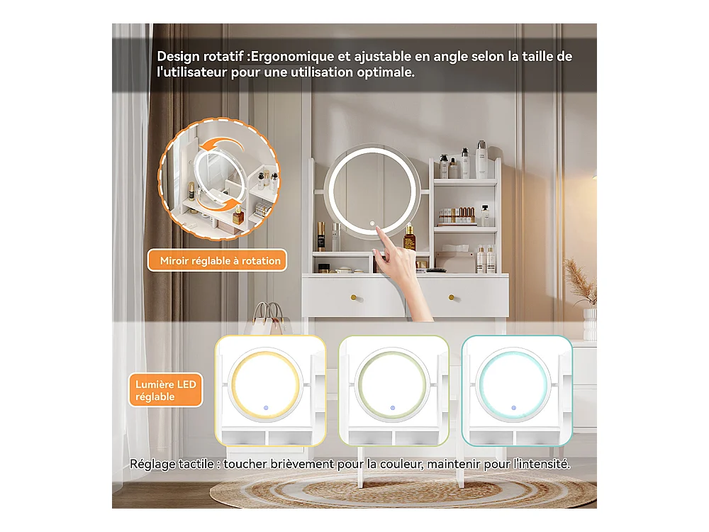 Coiffeuse blanc 4 en 1 miroir pleine longueur pivotant tabouret éclairage LED 3 couleurs poignée métal