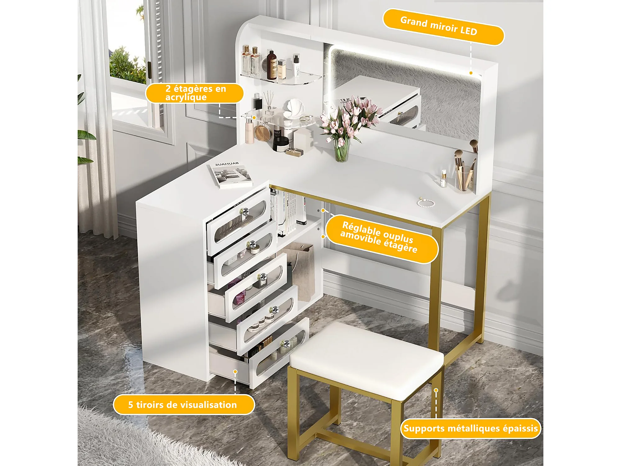 Coiffeuse d’angle en forme de L avec miroir, rangements et étagères – Table de maquillage gain de place, design moderne pour chambre