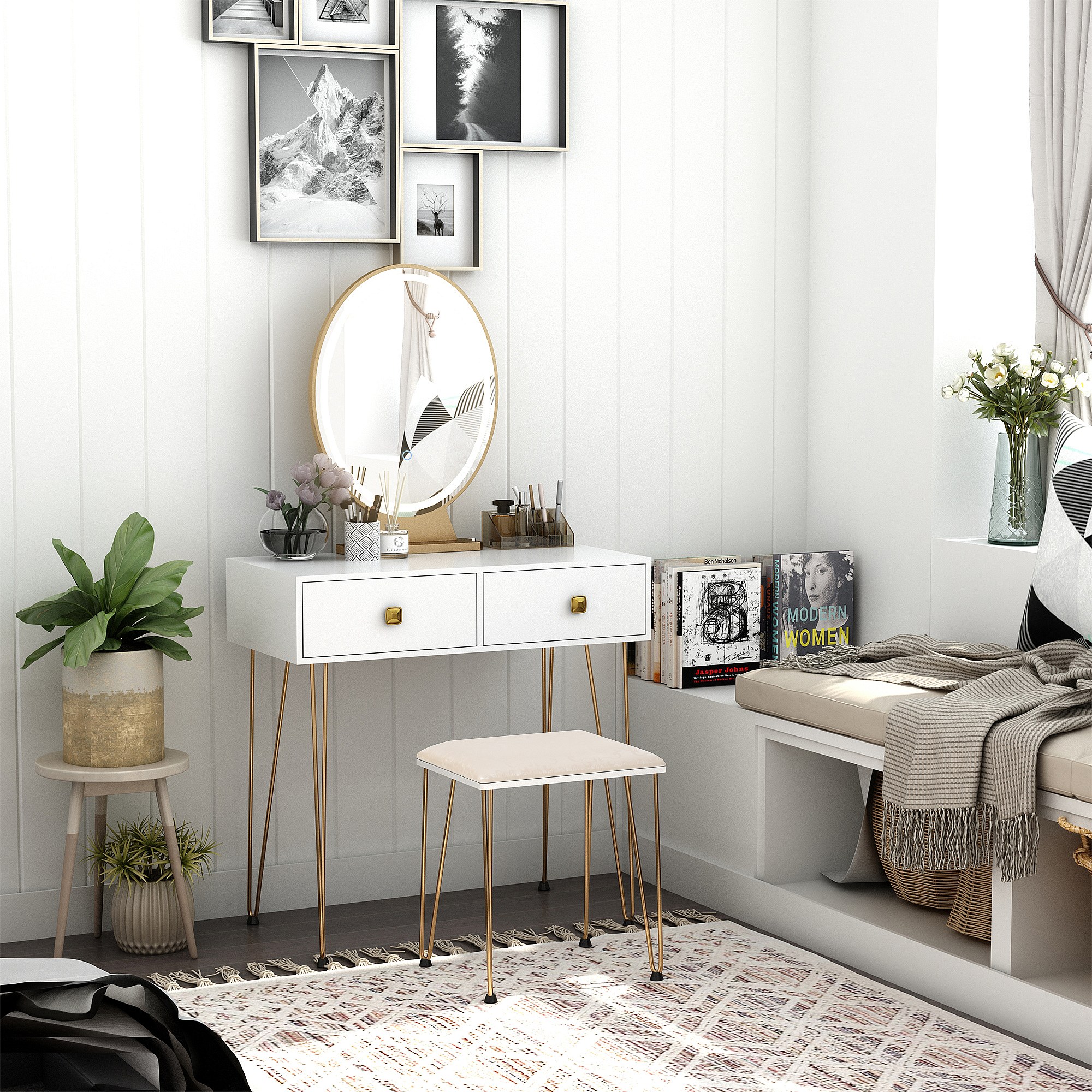 Coiffeuse Table de Maquillage 75x40x145CM avec Miroir Ovale 1 Tabouret Pieds en Pin et 4 Tiroirs Blanche