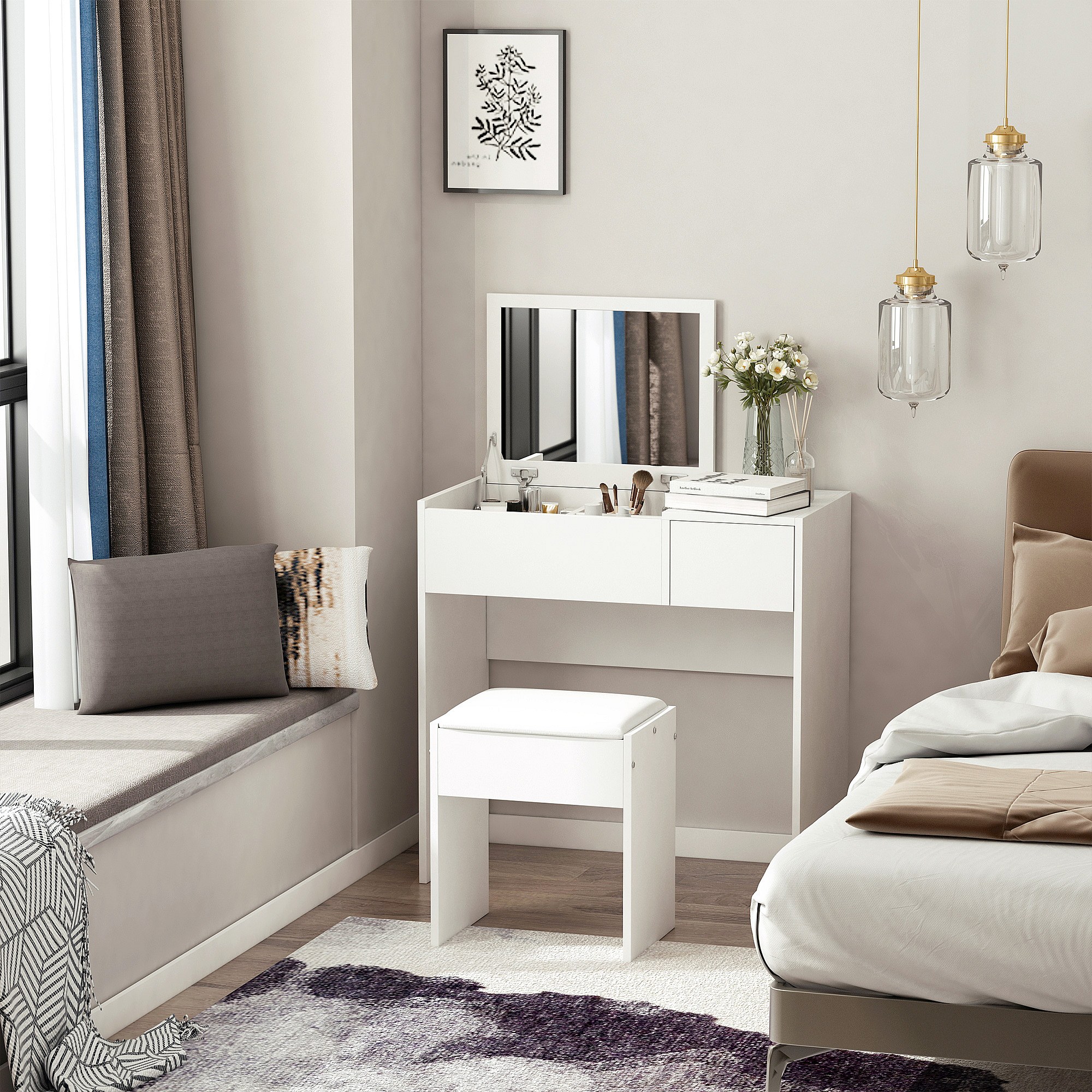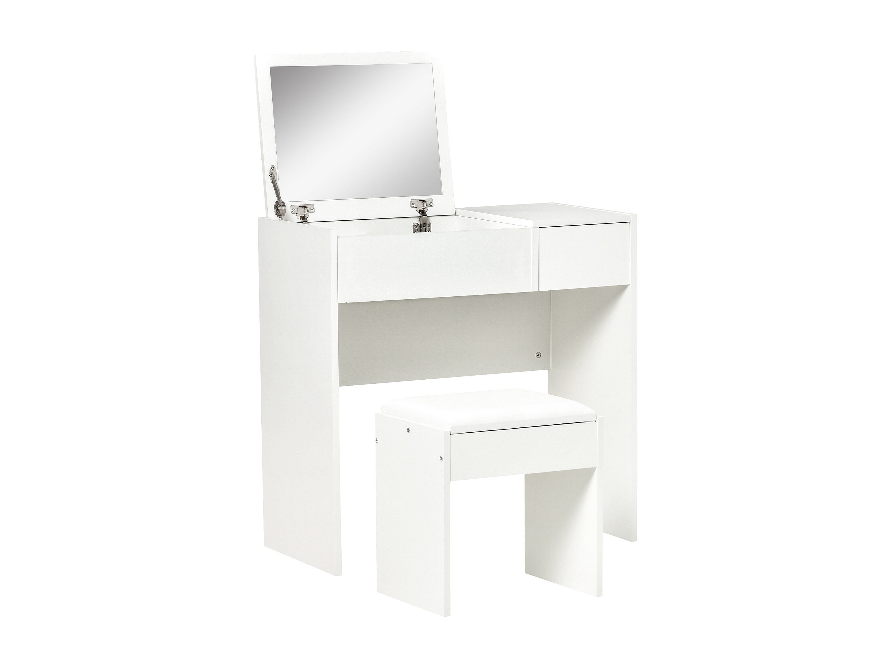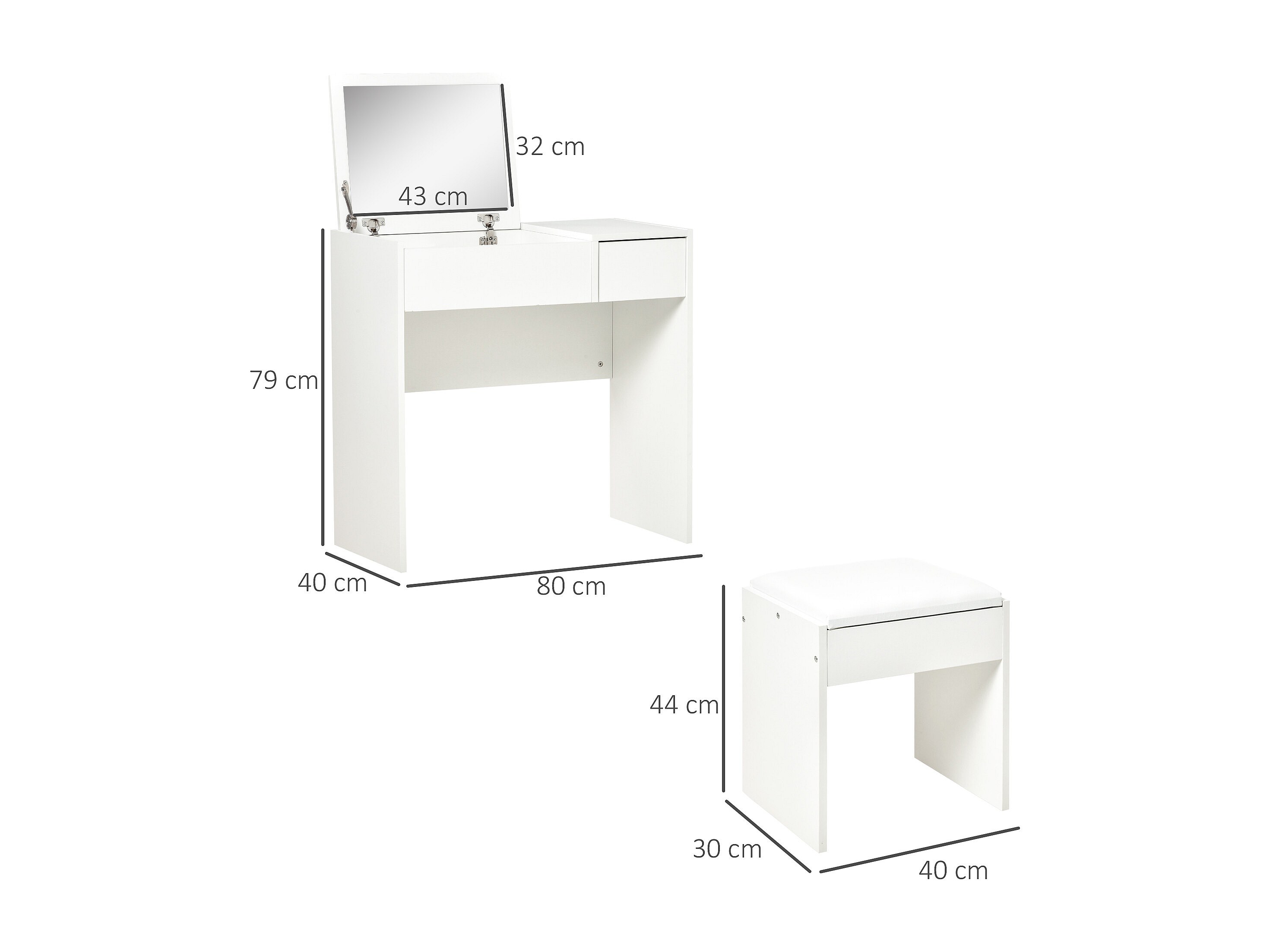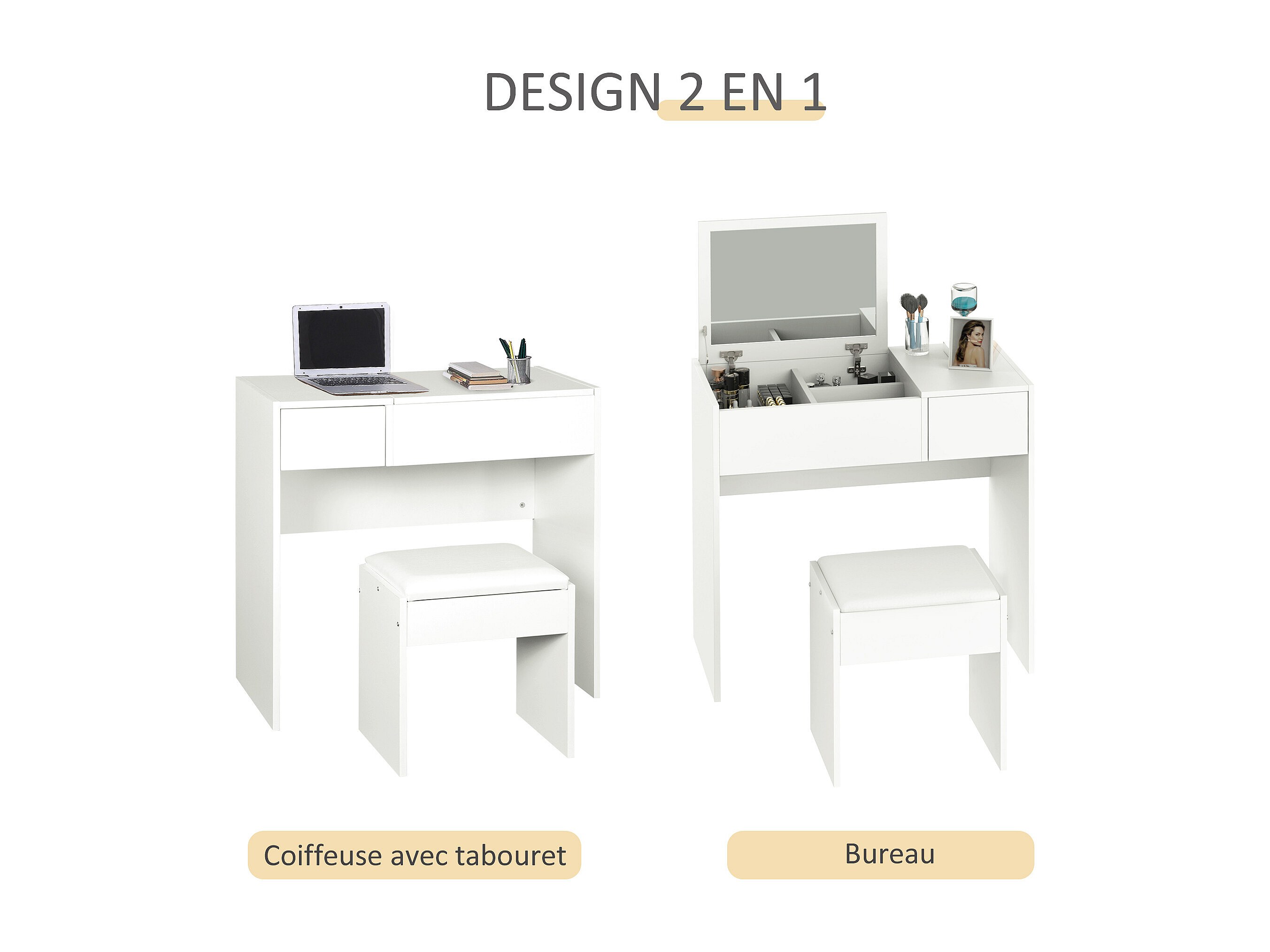 Coiffeuse table de maquillage design contemporain 80L x 40l x 79H cm miroir escamotable, tiroir, coffre + tabouret blanc
