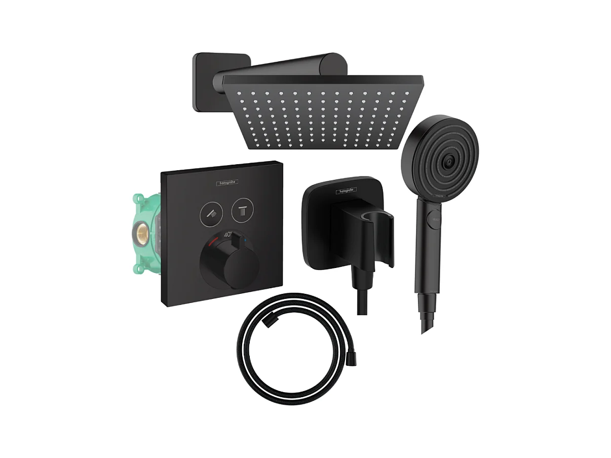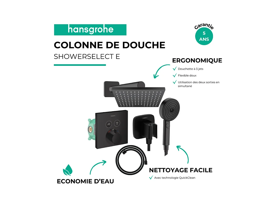 Colonne de douche thermostatique HANSGROHE ShowerSelect E Douche de tête Vernis Shape Flexible Designflex Douchette Pulsify noir