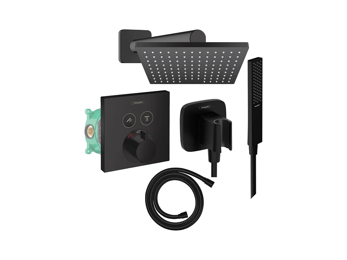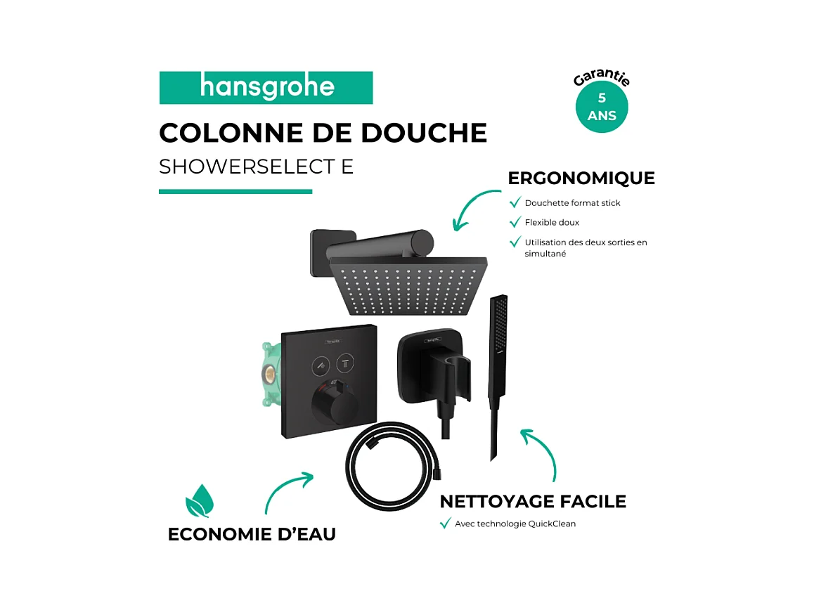 Colonne de douche thermostatique HANSGROHE ShowerSelect E Douche de tête Vernis Shape Flexible Isiflex Douchette PulsifyE noir mat