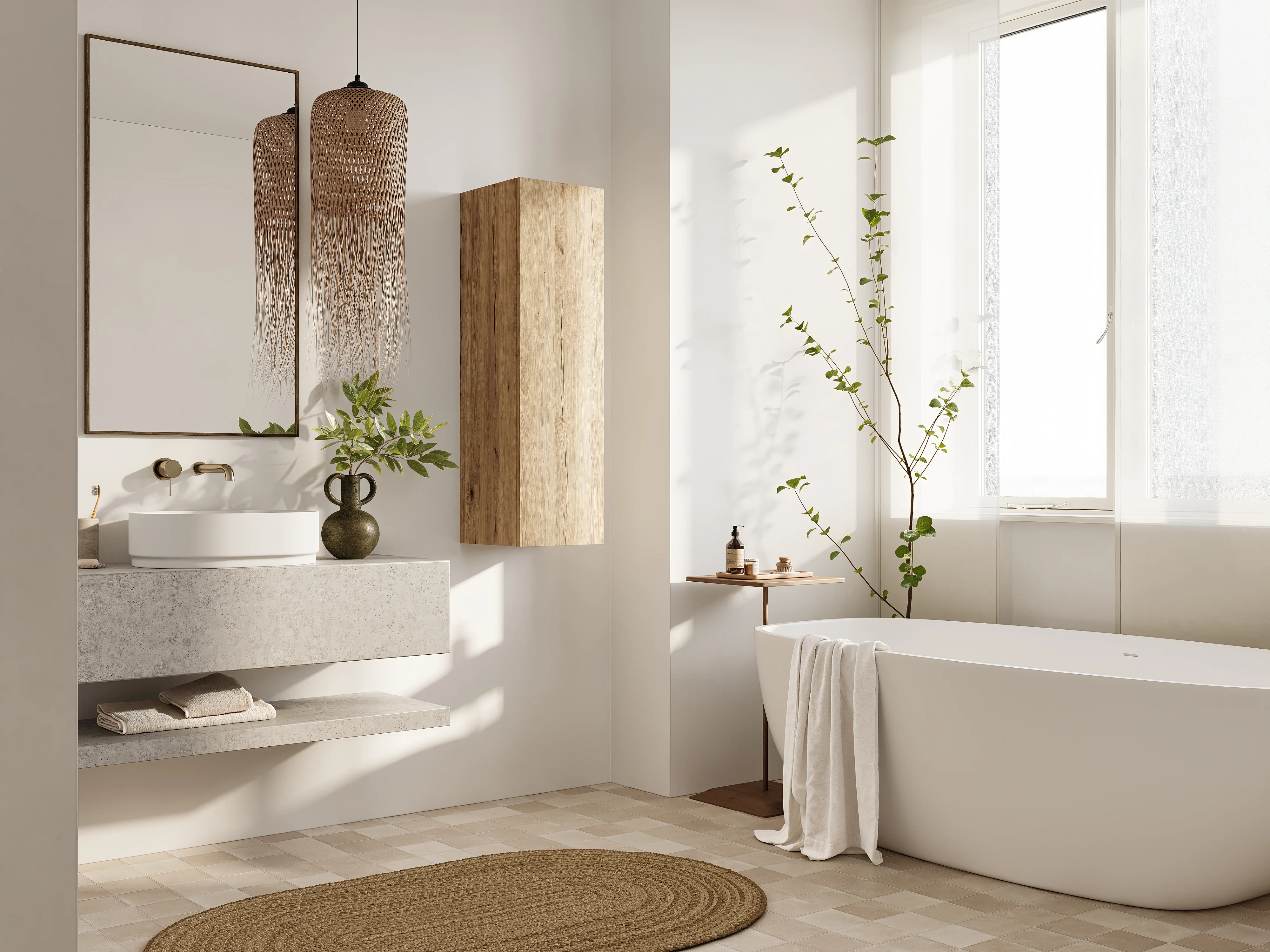 Touch armoire haute pour salle de bain accroché au mur chêne décor, mat blanc.