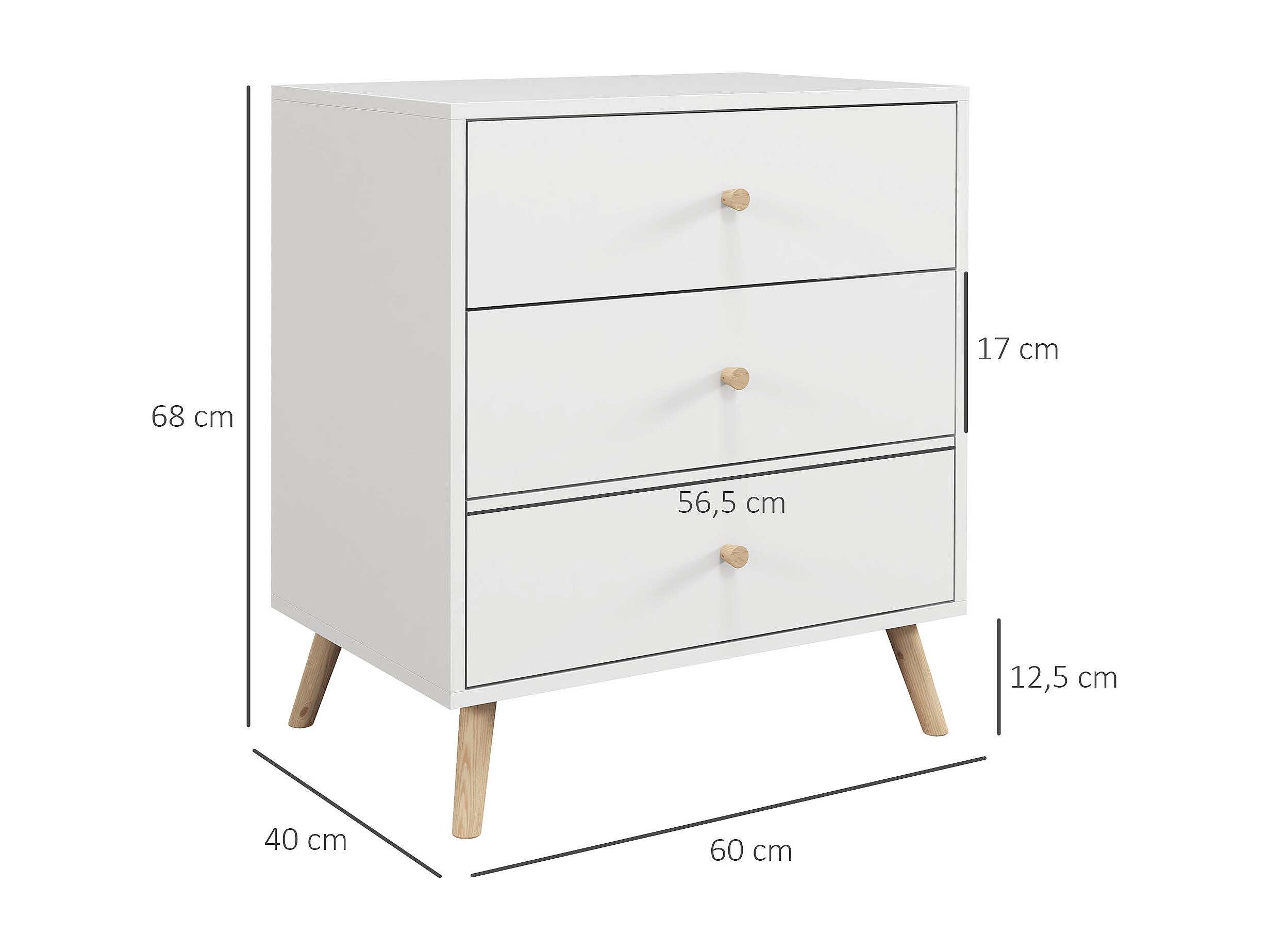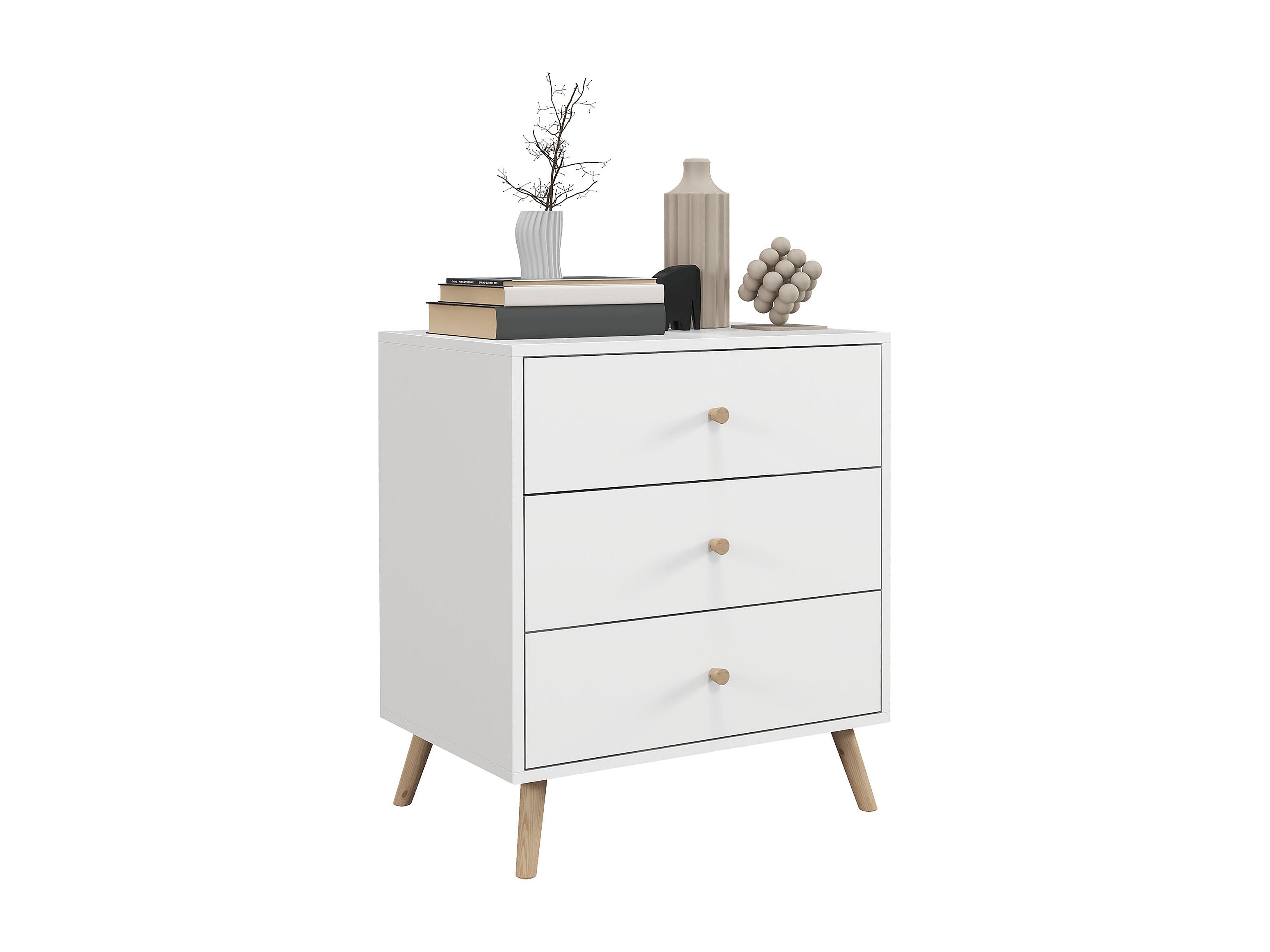 Commode 3 tiroirs design scandinave piètement effilé incliné bois pin MDF blanc