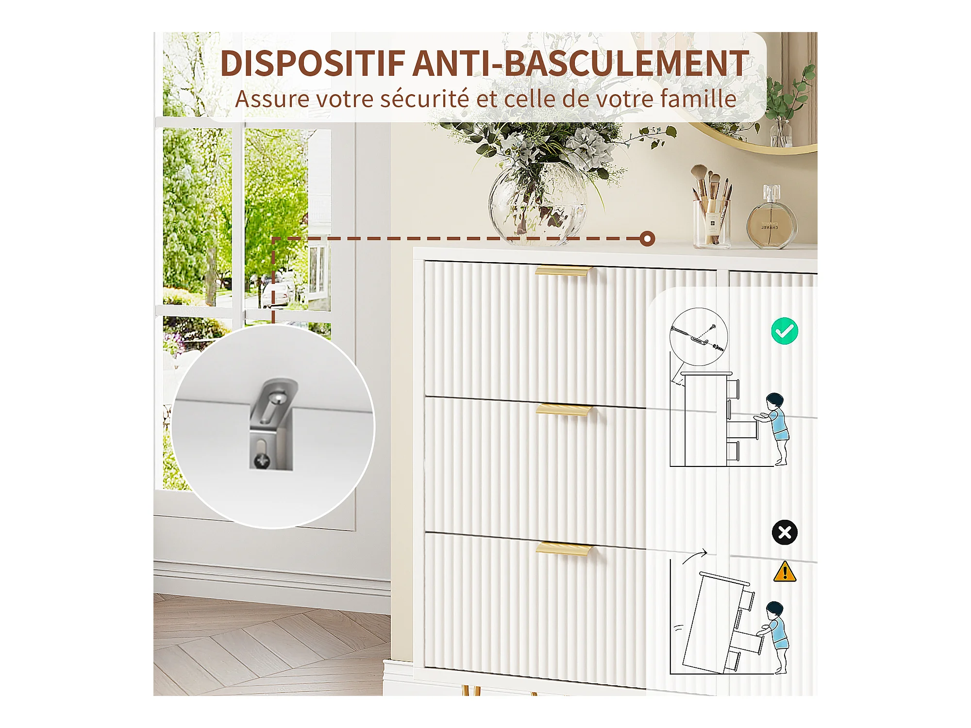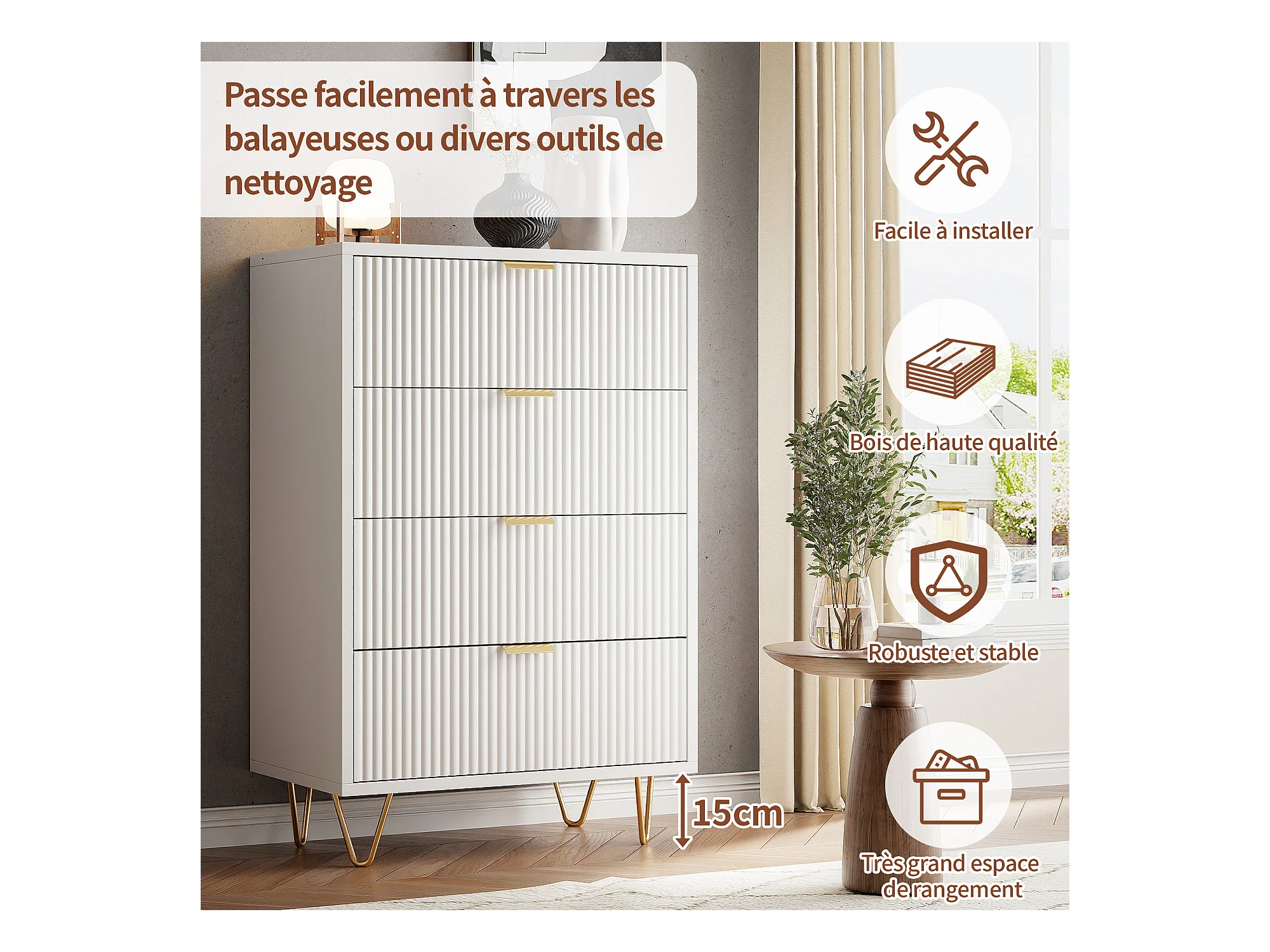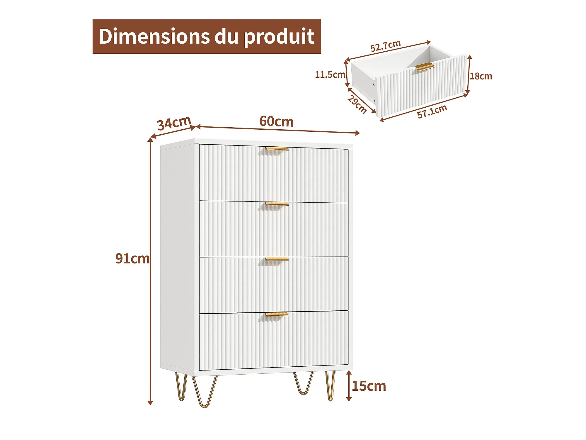 Commode 4 Tiroirs, Meuble de Rangement Bois, Manche et Pieds Couleurs Dorées, 60 x 34 x 91 cm