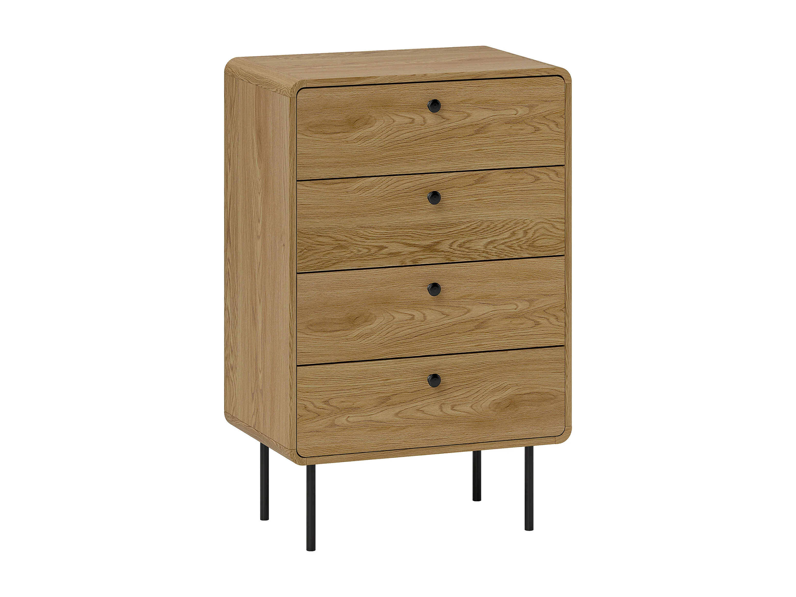 Commode 4 tiroirs style vintage effet bois coins biseautés piètement métal poignées bouton noir