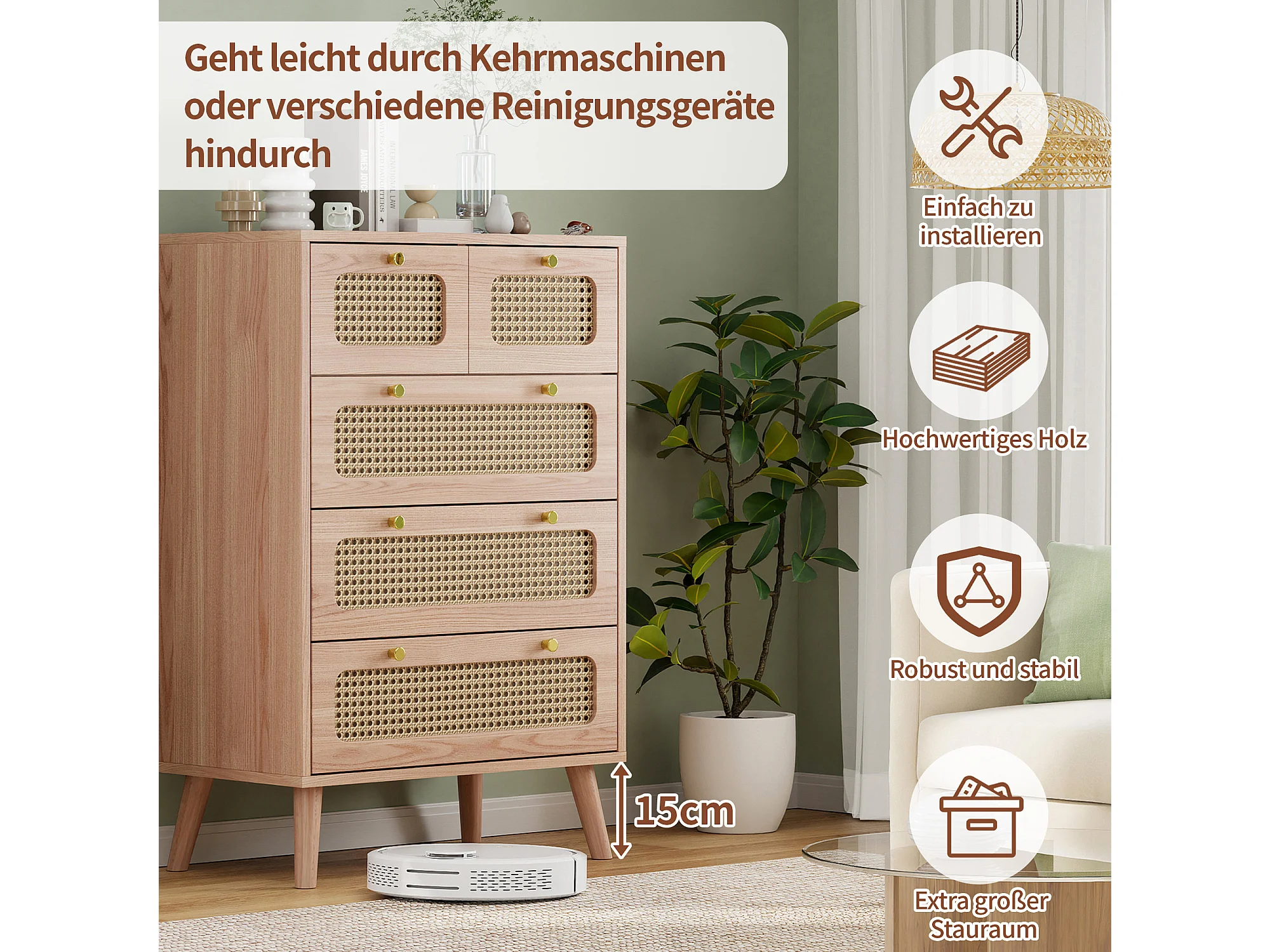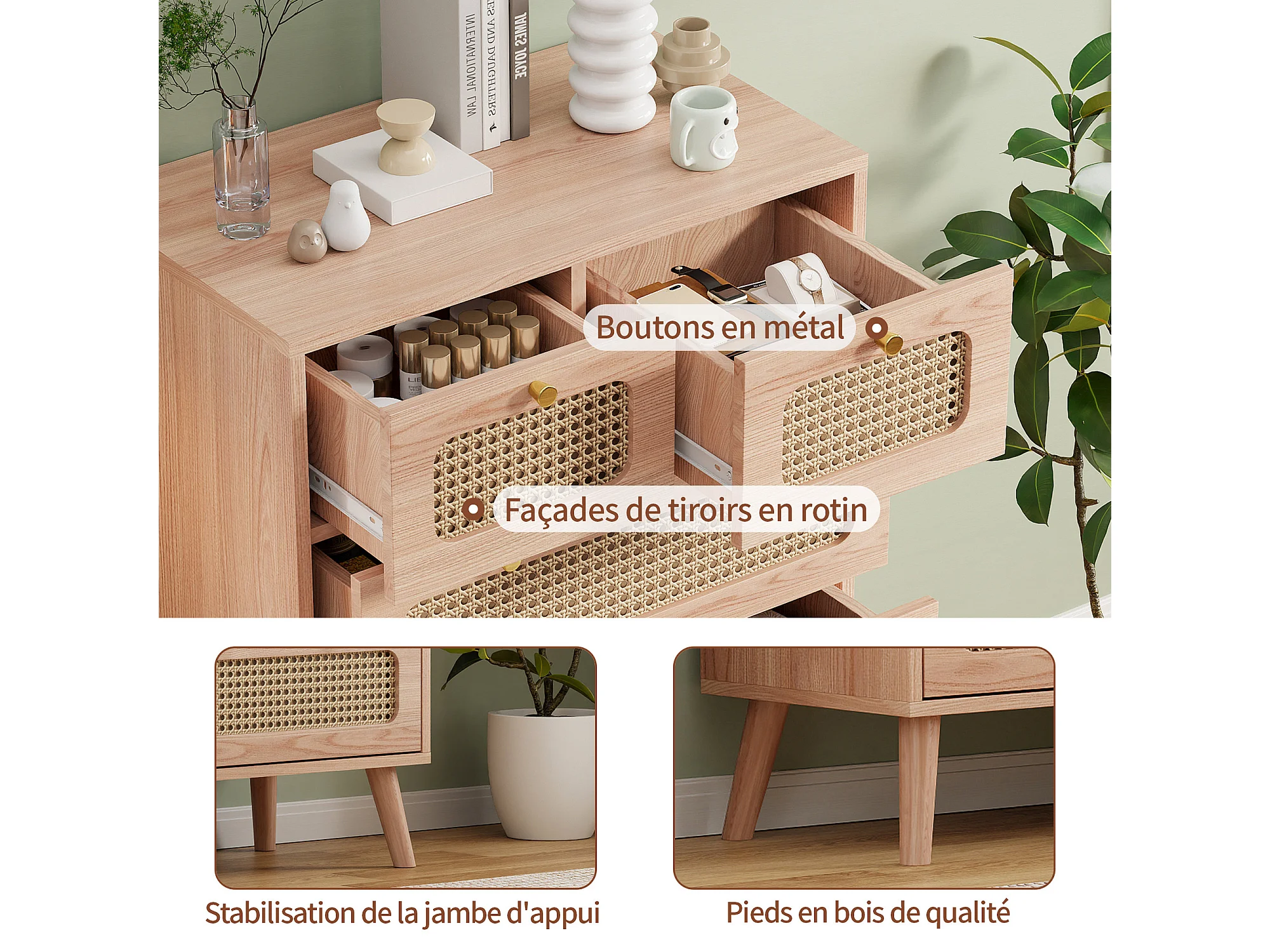 Commode à 5 tiroirs, commode en rotin pour la chambre,commode en bois avec poignées dorées, buffet,60 x 34 x 91 cm