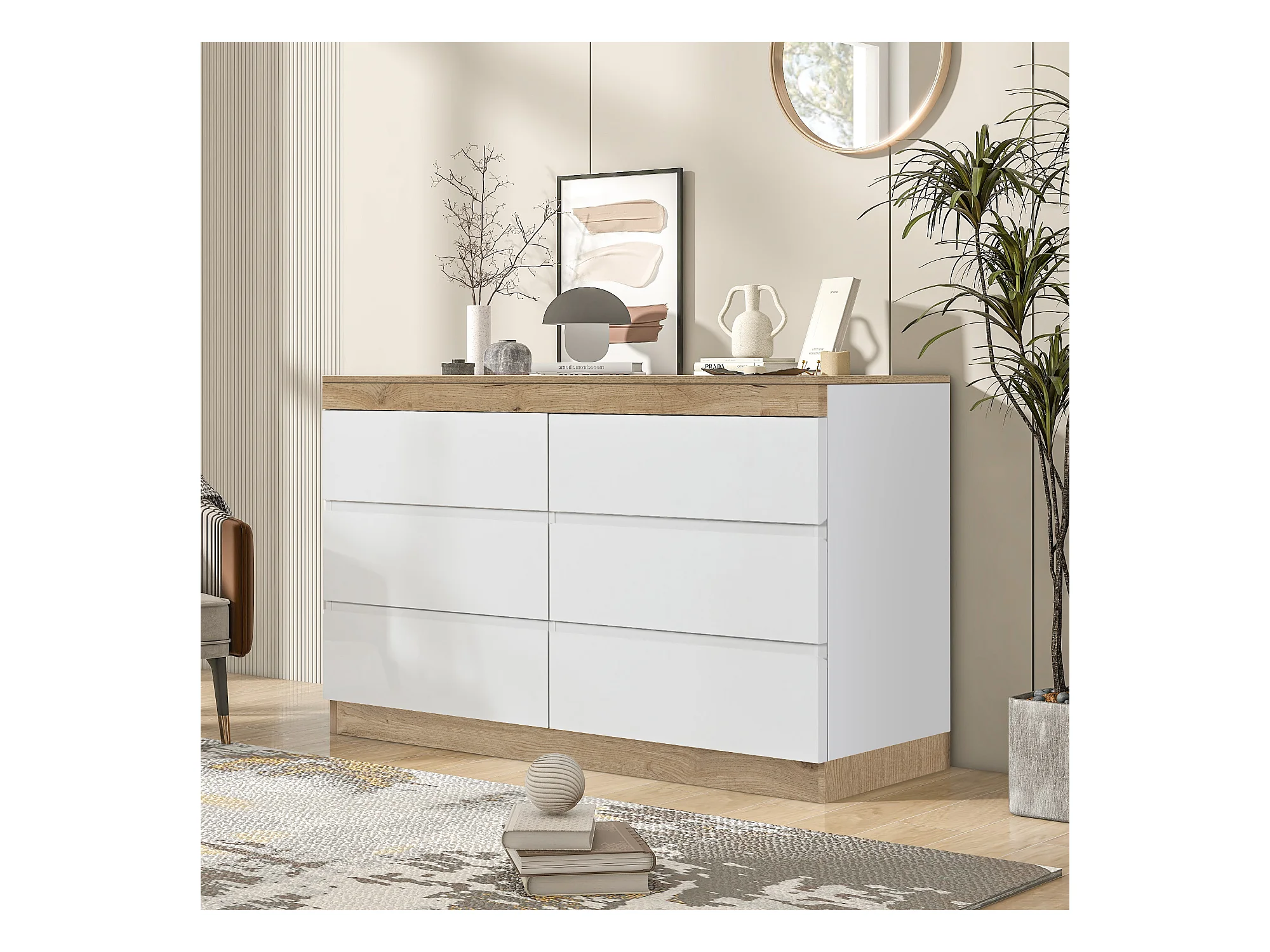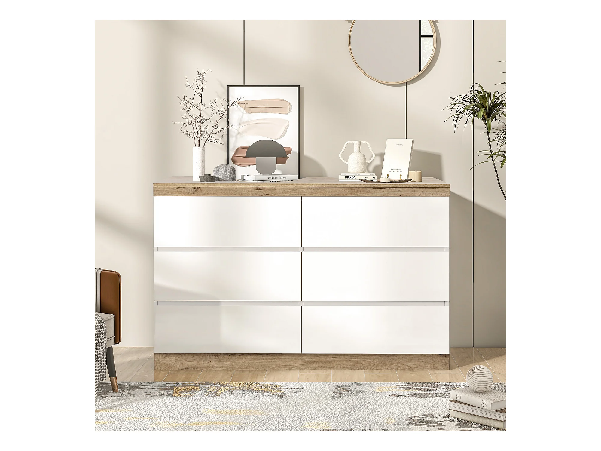 Commode à 6 tiroirs - 110 x 40 x 67.5 cm - pour chambre et salon - aggloméré E1 - blanc + chêne